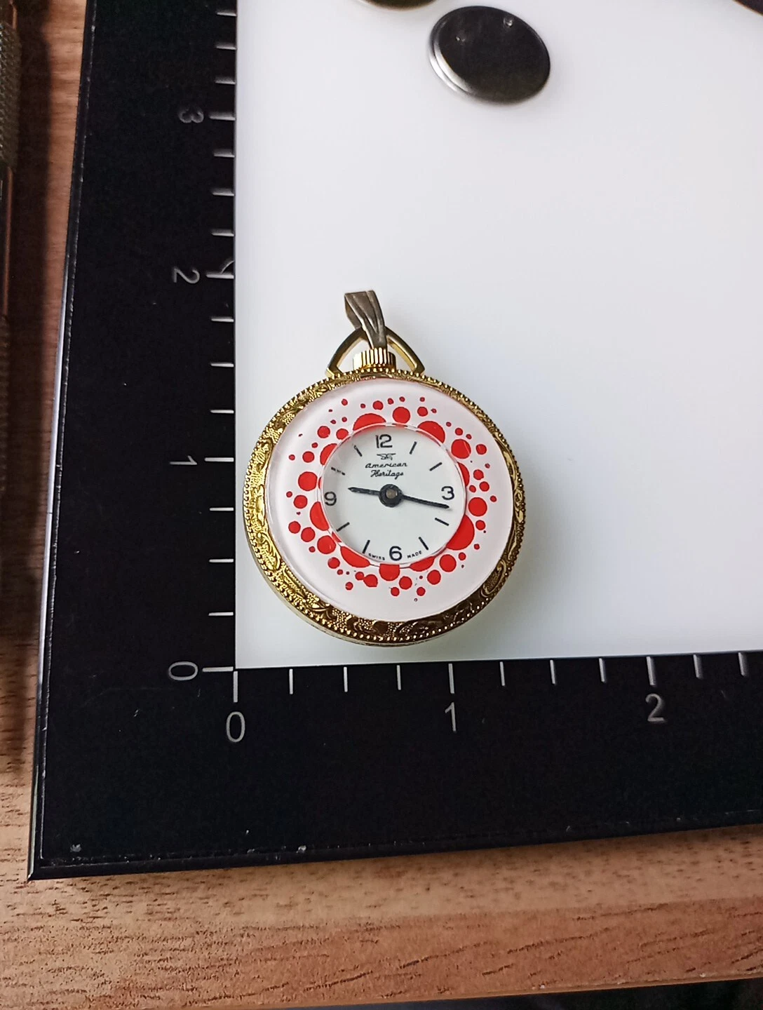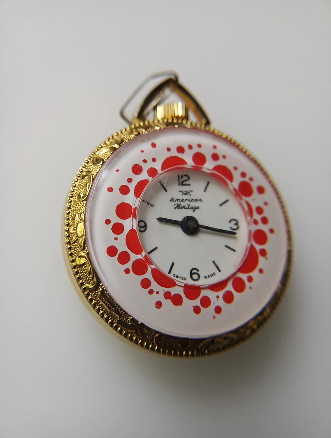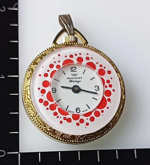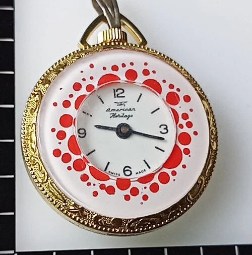 American Heritage Goldtone Red Black White Necklace Wind Up Swiss Watch
