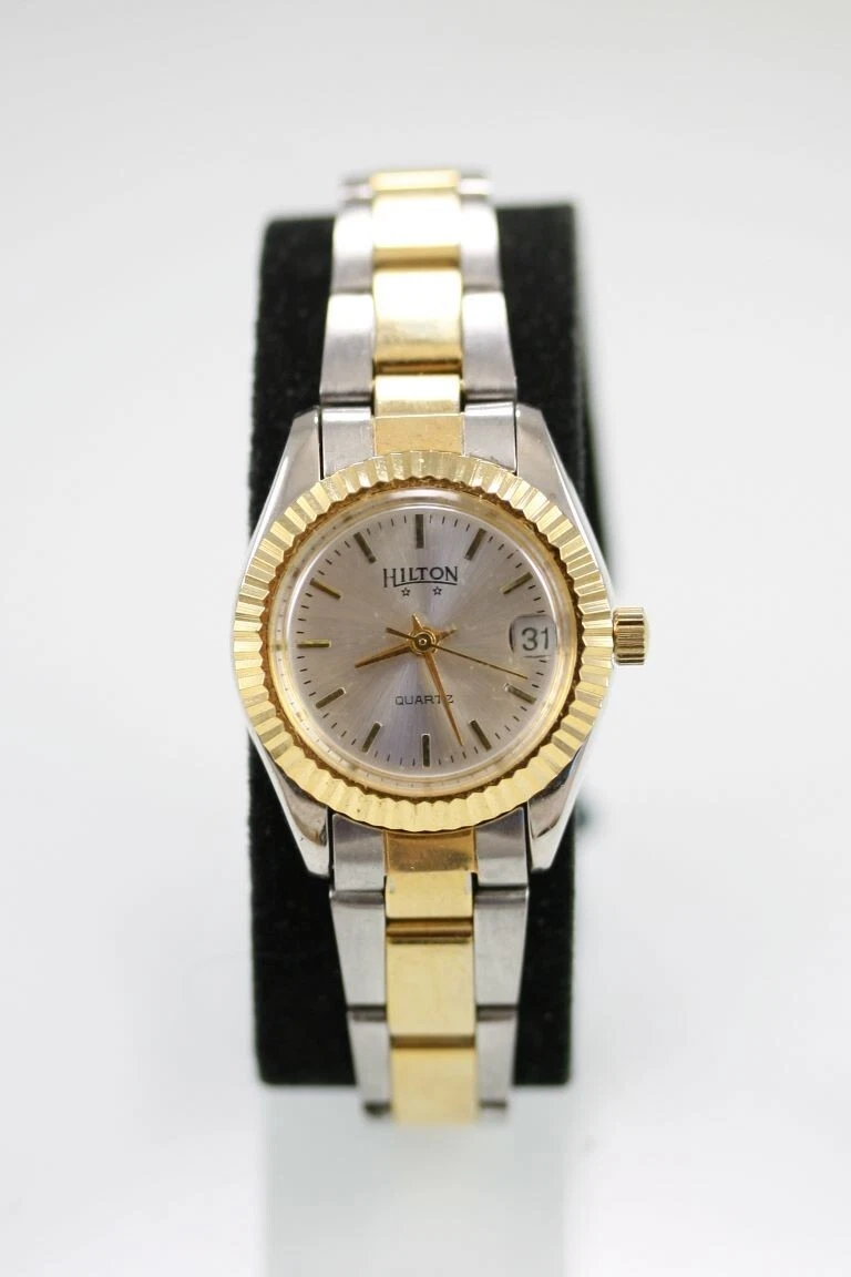 Hilton Women Watch Stainless Steel Gold Silver Water Res Batt Date White Quartz