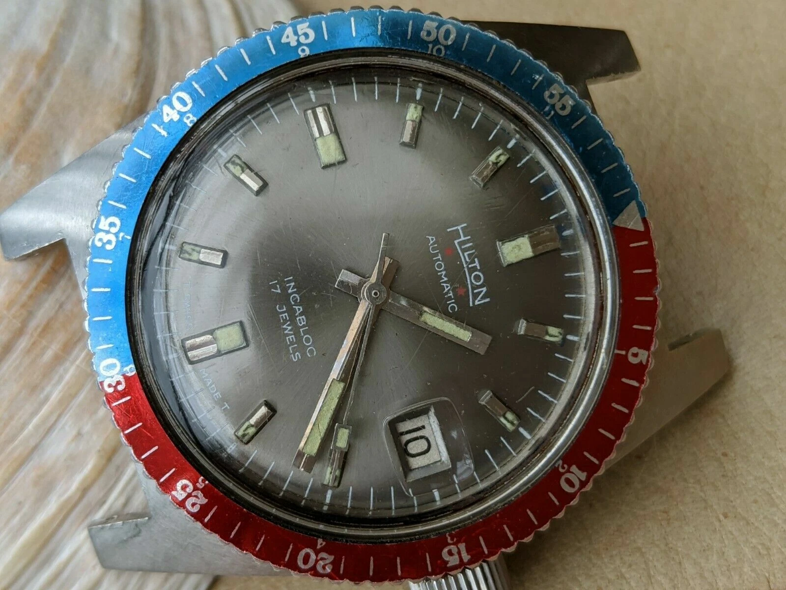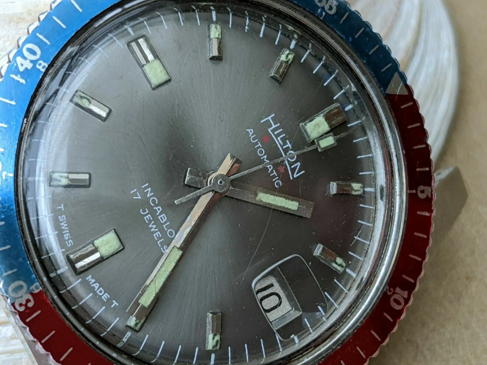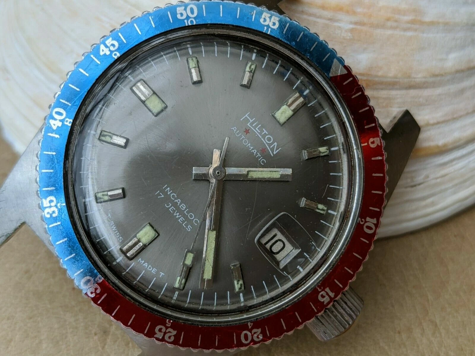 Vintage 1970's Hilton 5 ATM Diver w/Patina,Pepsi Bezel,All SS Case,AS 1903 Mvmt