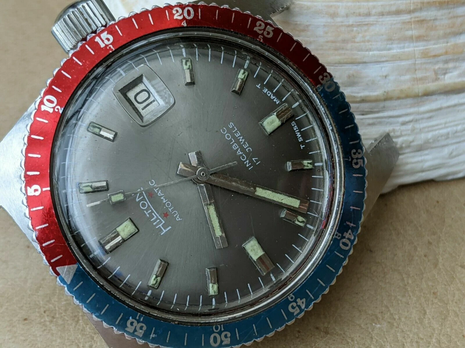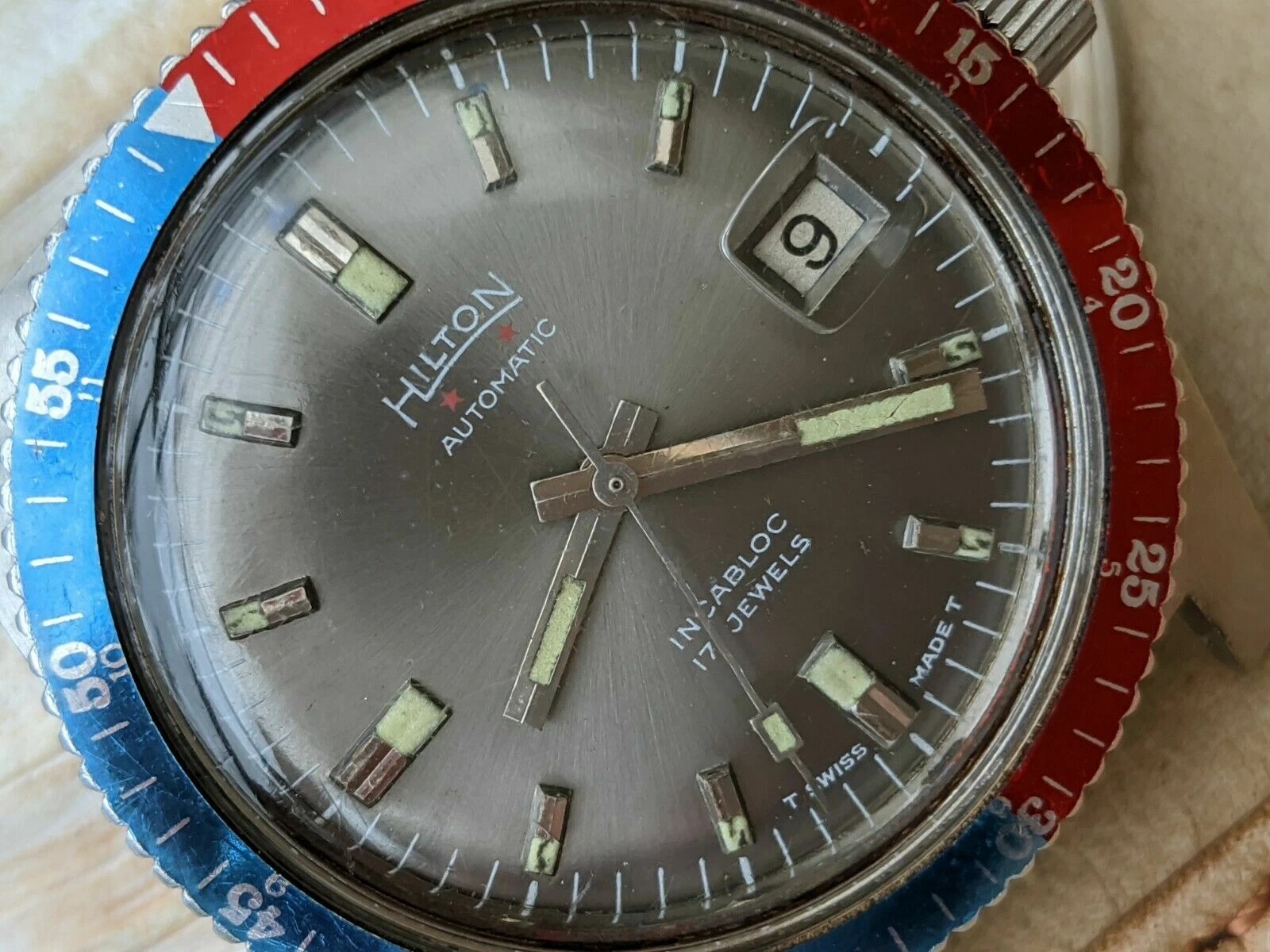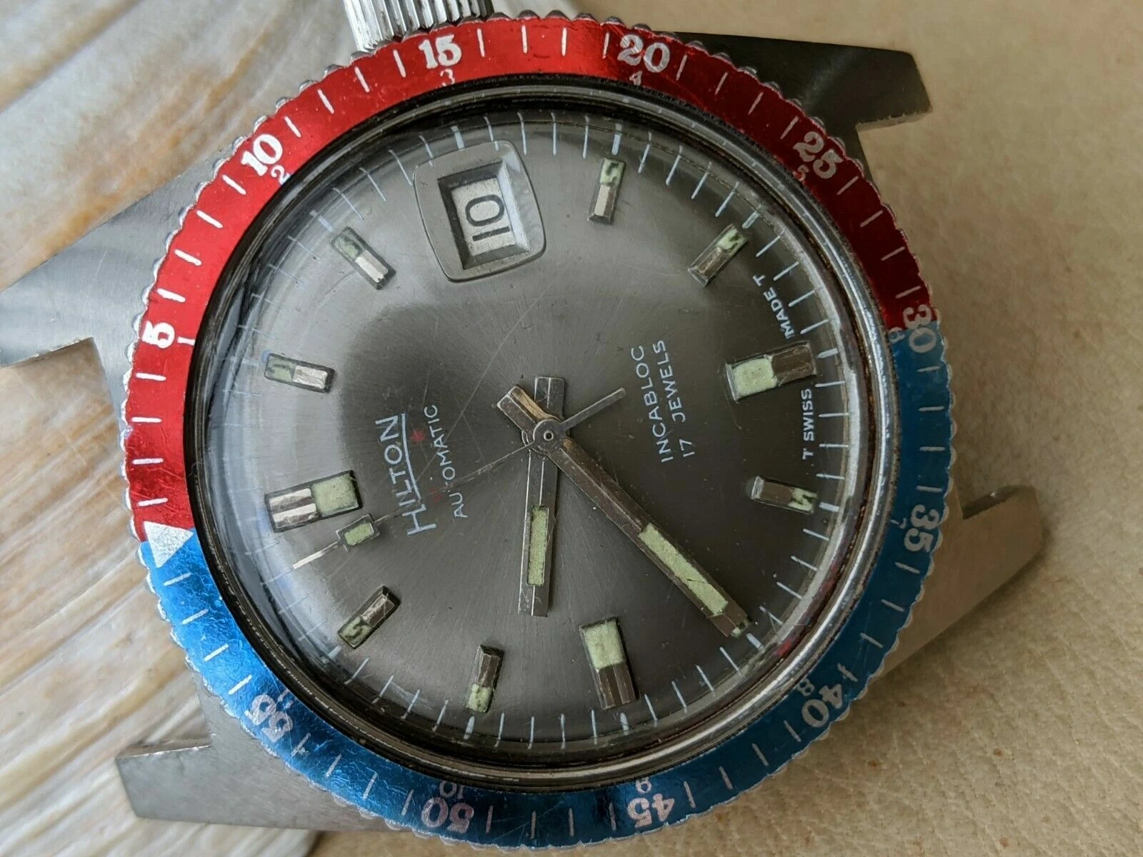 Vintage 1970's Hilton 5 ATM Diver w/Patina,Pepsi Bezel,All SS Case,AS 1903 Mvmt