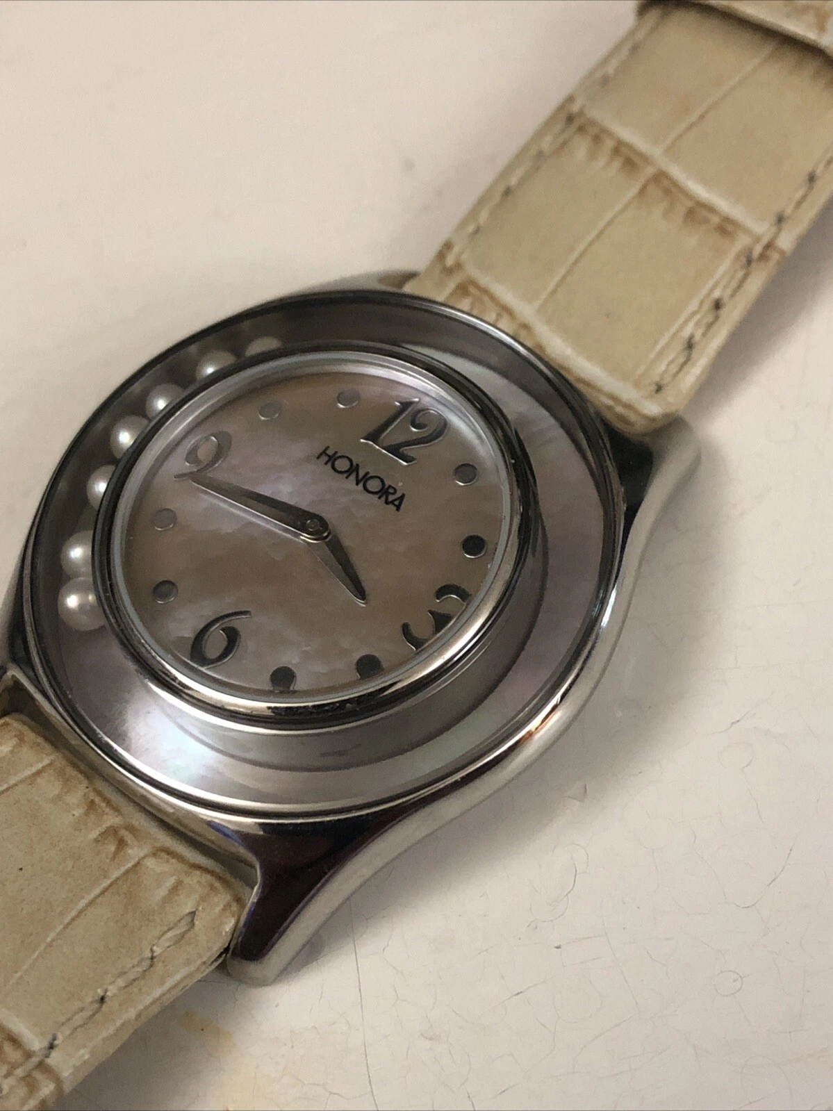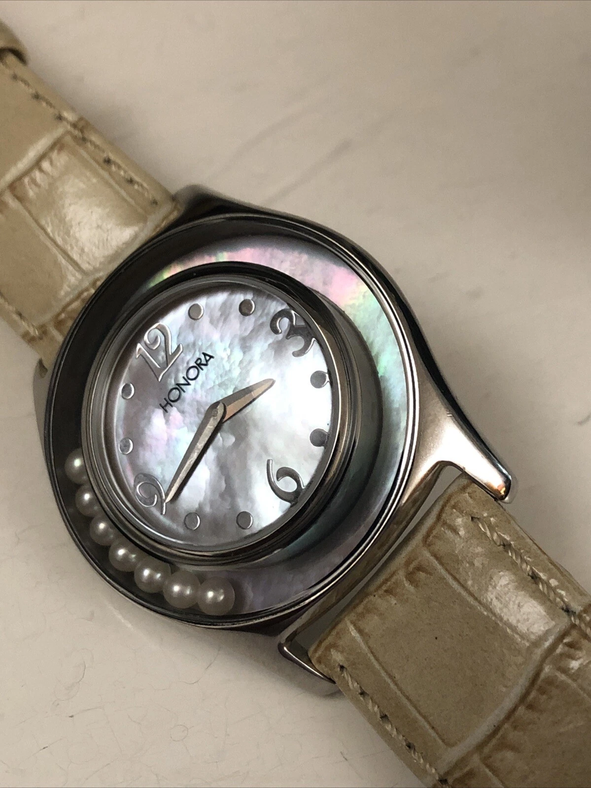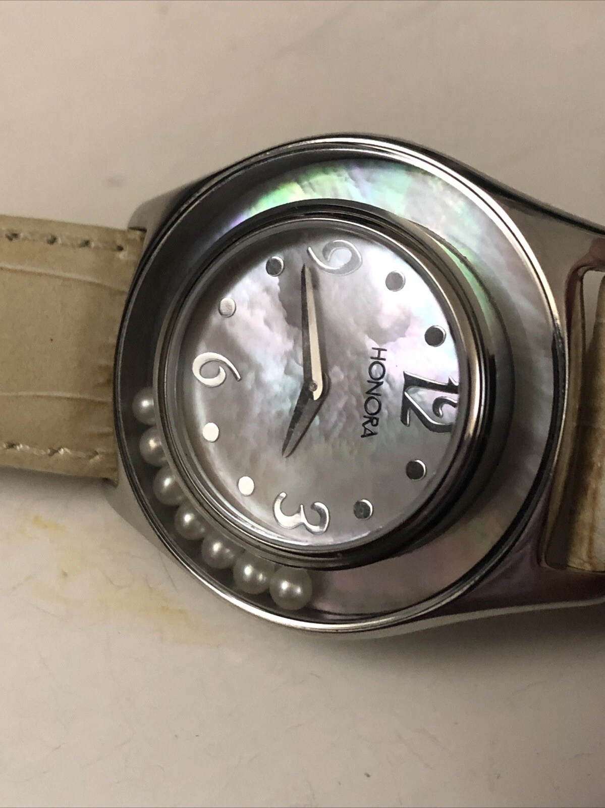 Honora Pearl Watch Women 36mm Silver Tone MOP Dial Leather Band New Battery