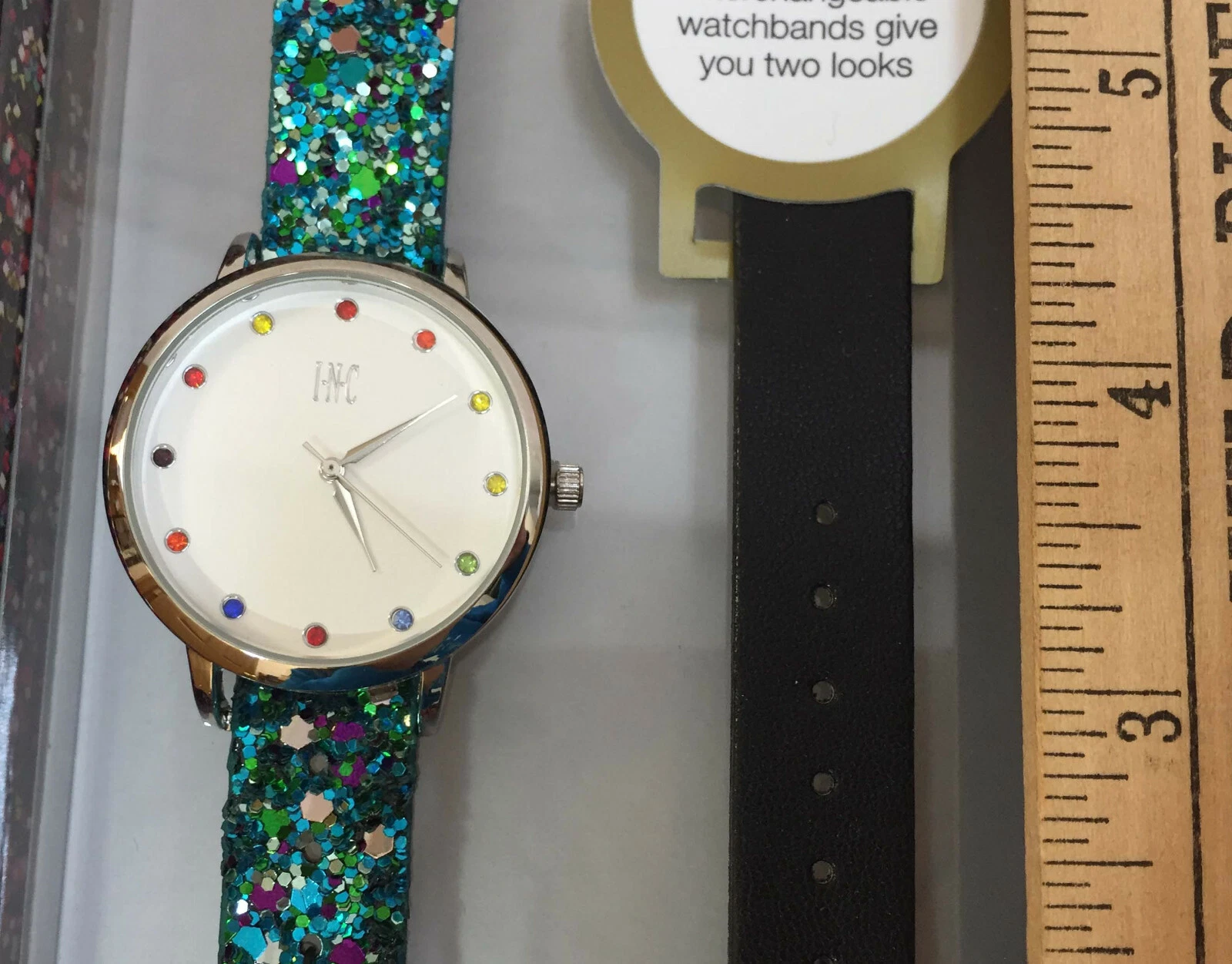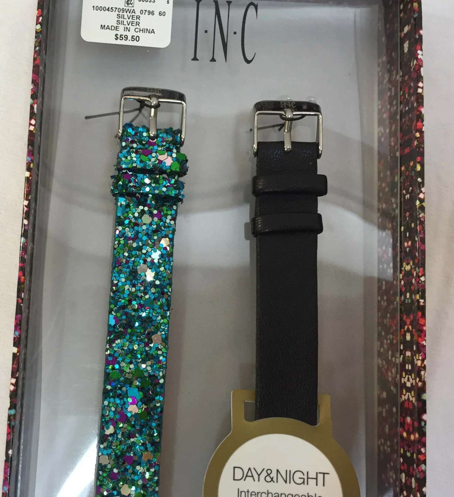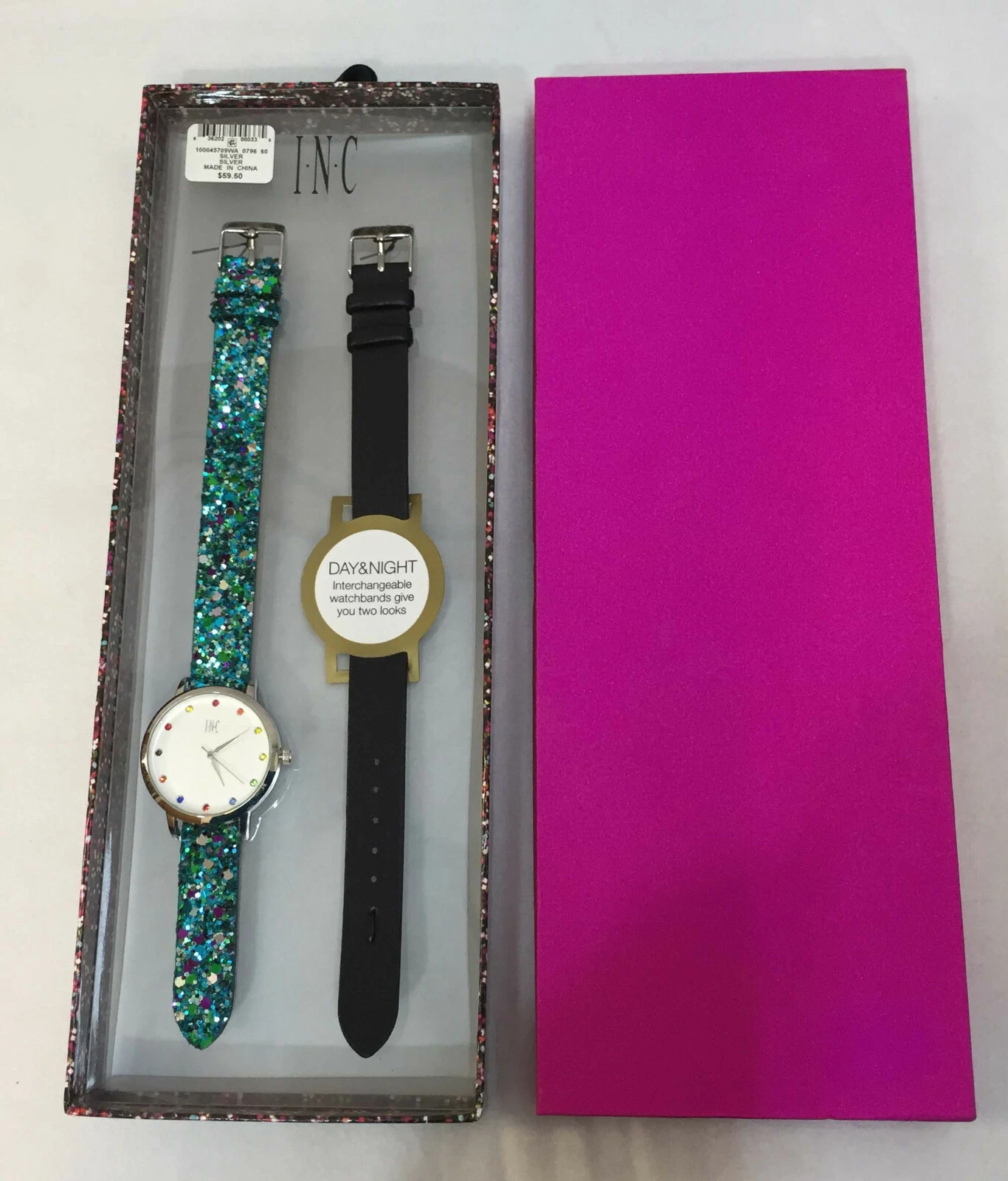 Watch INC Interchangeable Leather Band Black & Blue Glitter Wristwatch Women's
