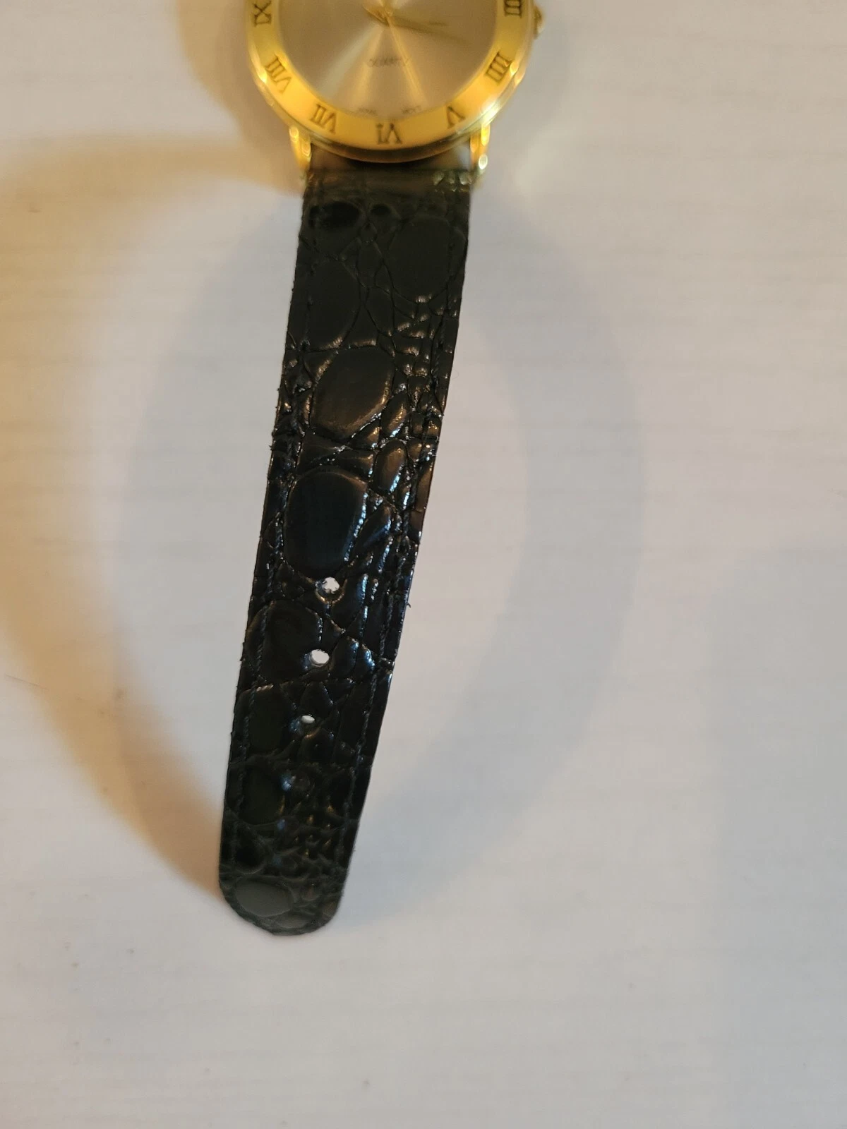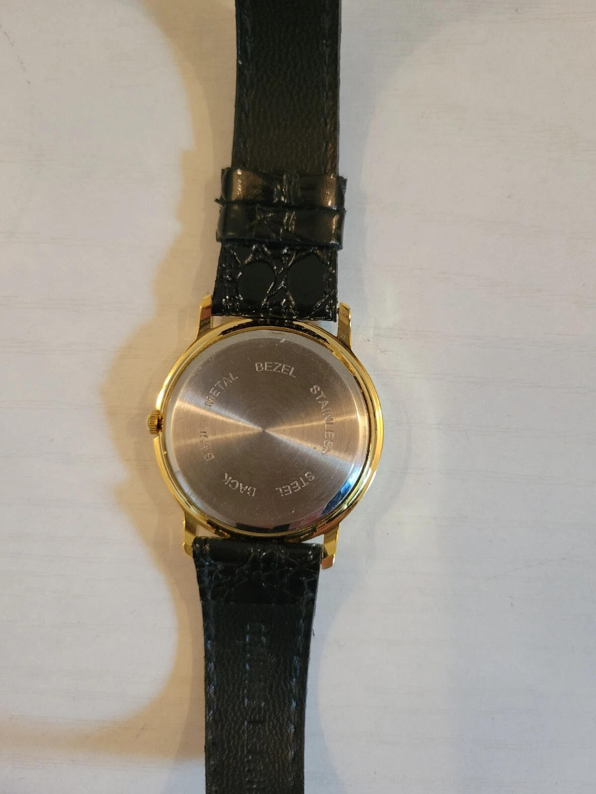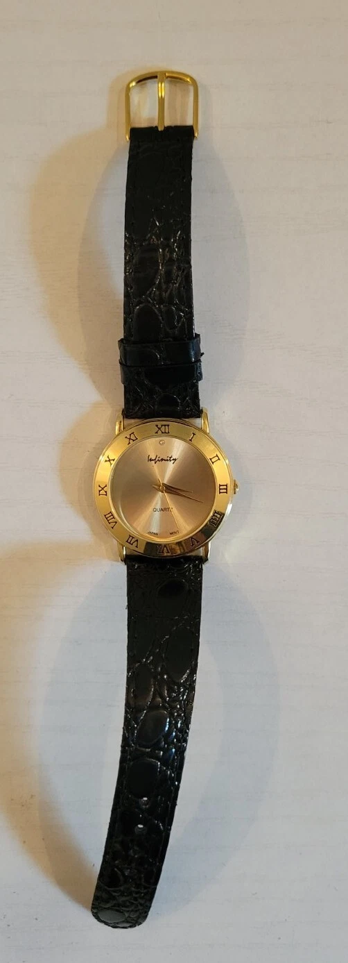 Infinity Gold Tone Dial Round Case Black Leather Band Watch. Not Tested
