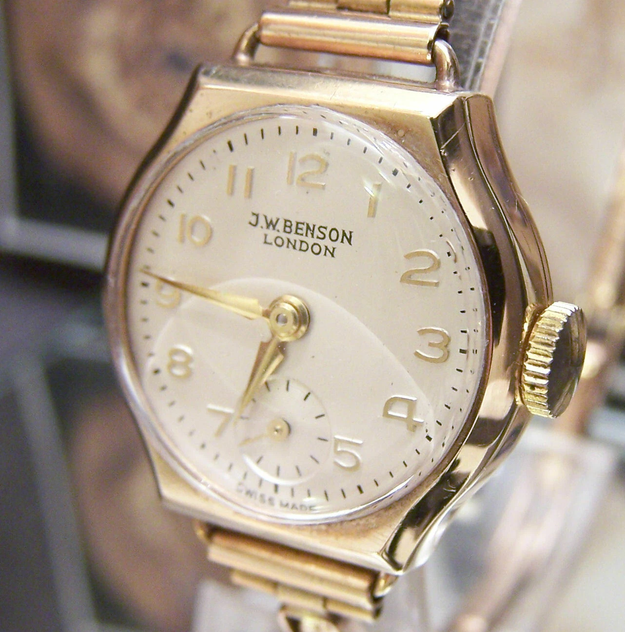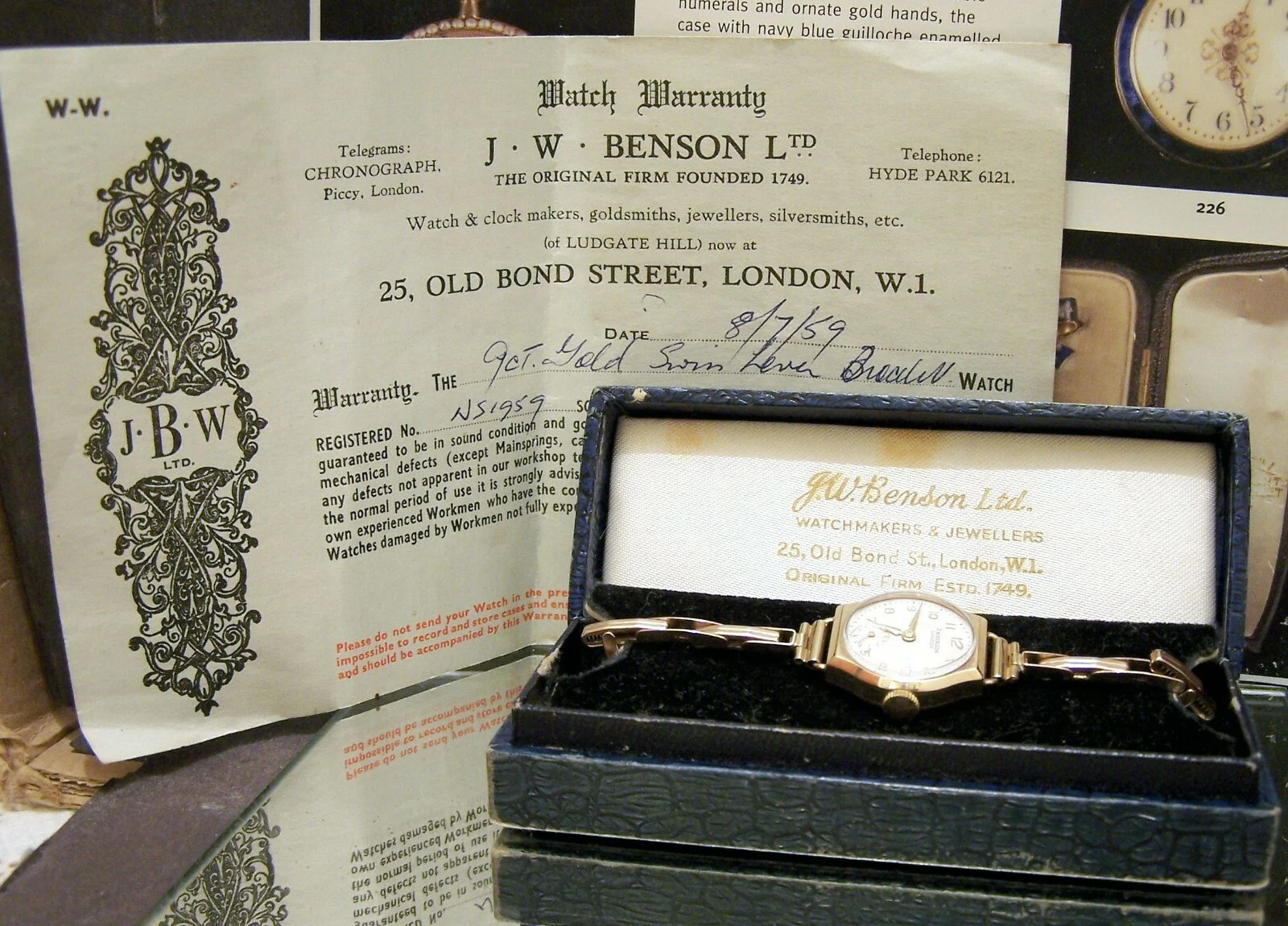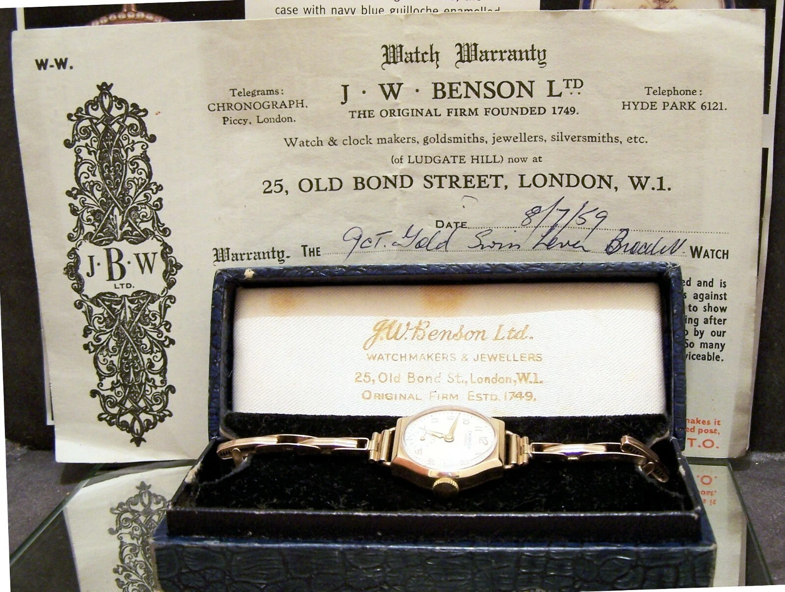 ANTIQUE VINTAGE STUNNING J W BENSON SOLID GOLD WATCH & BAND + BOX AND PAPER