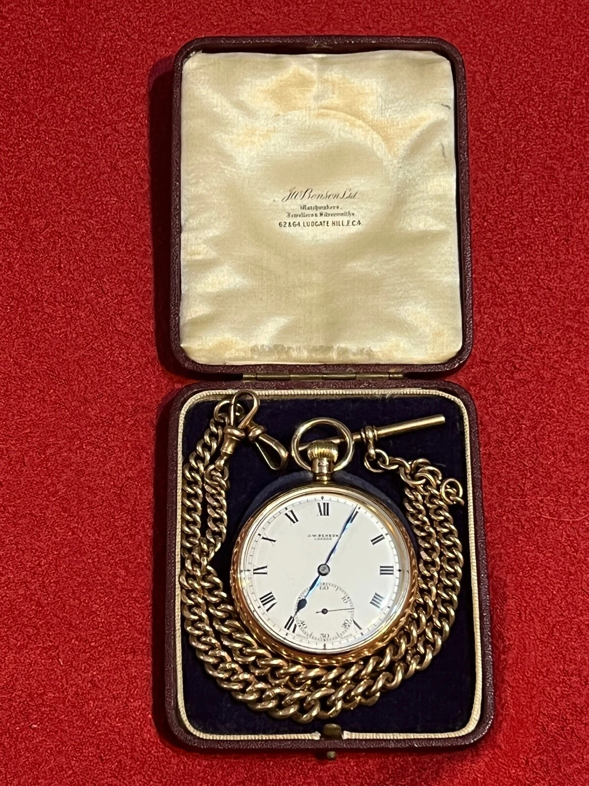 J W BENSON SOLID GOLD POCKET WATCH 9CT+ 9CT ALBERT CHAIN+ORIGINAL BOX