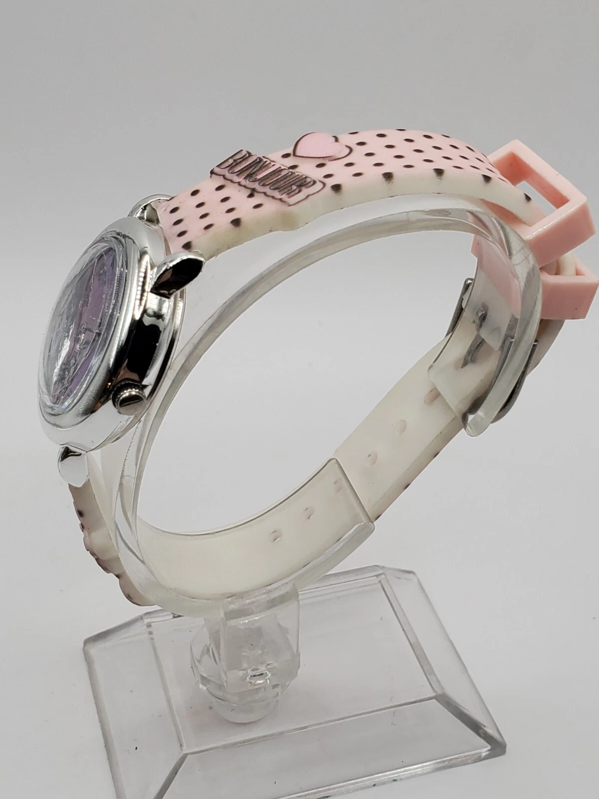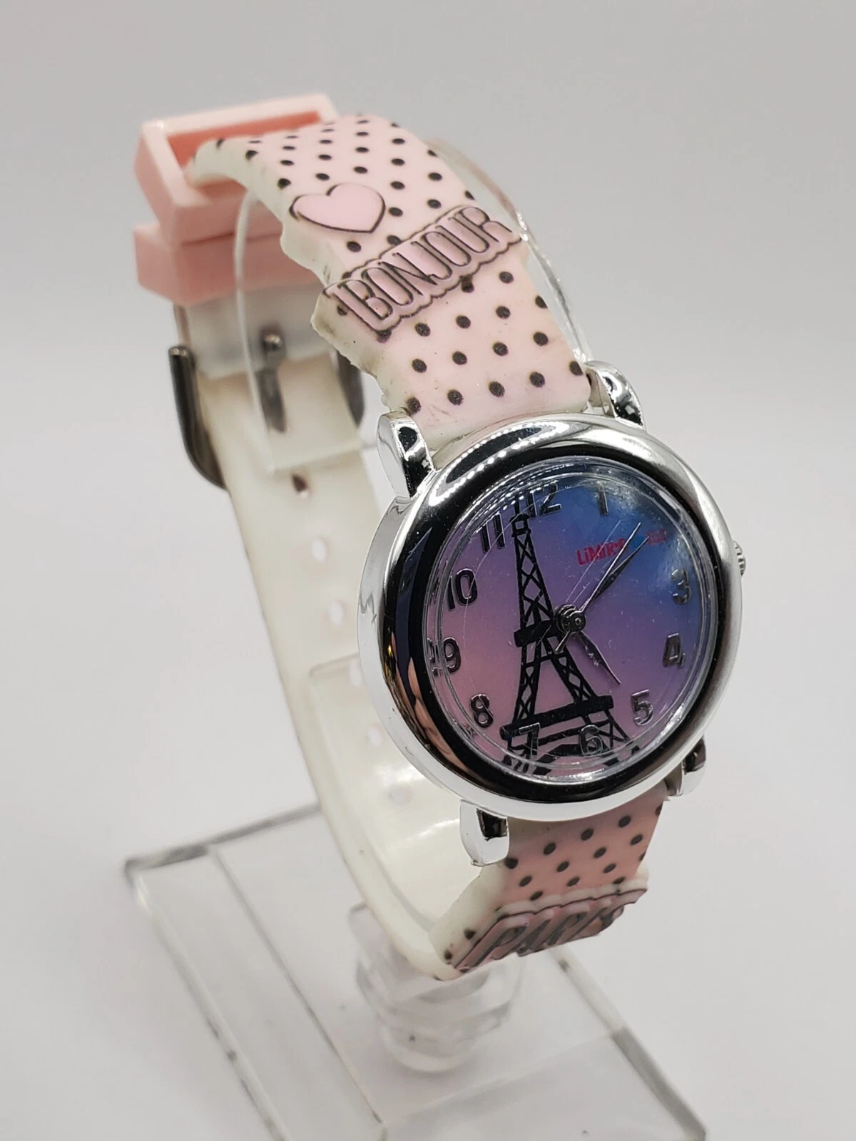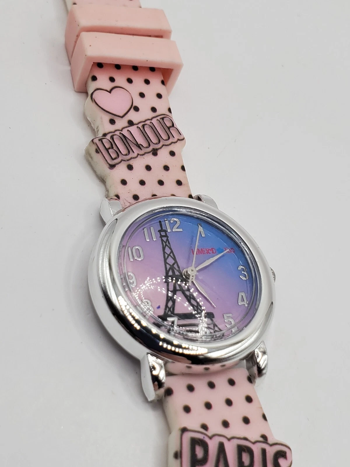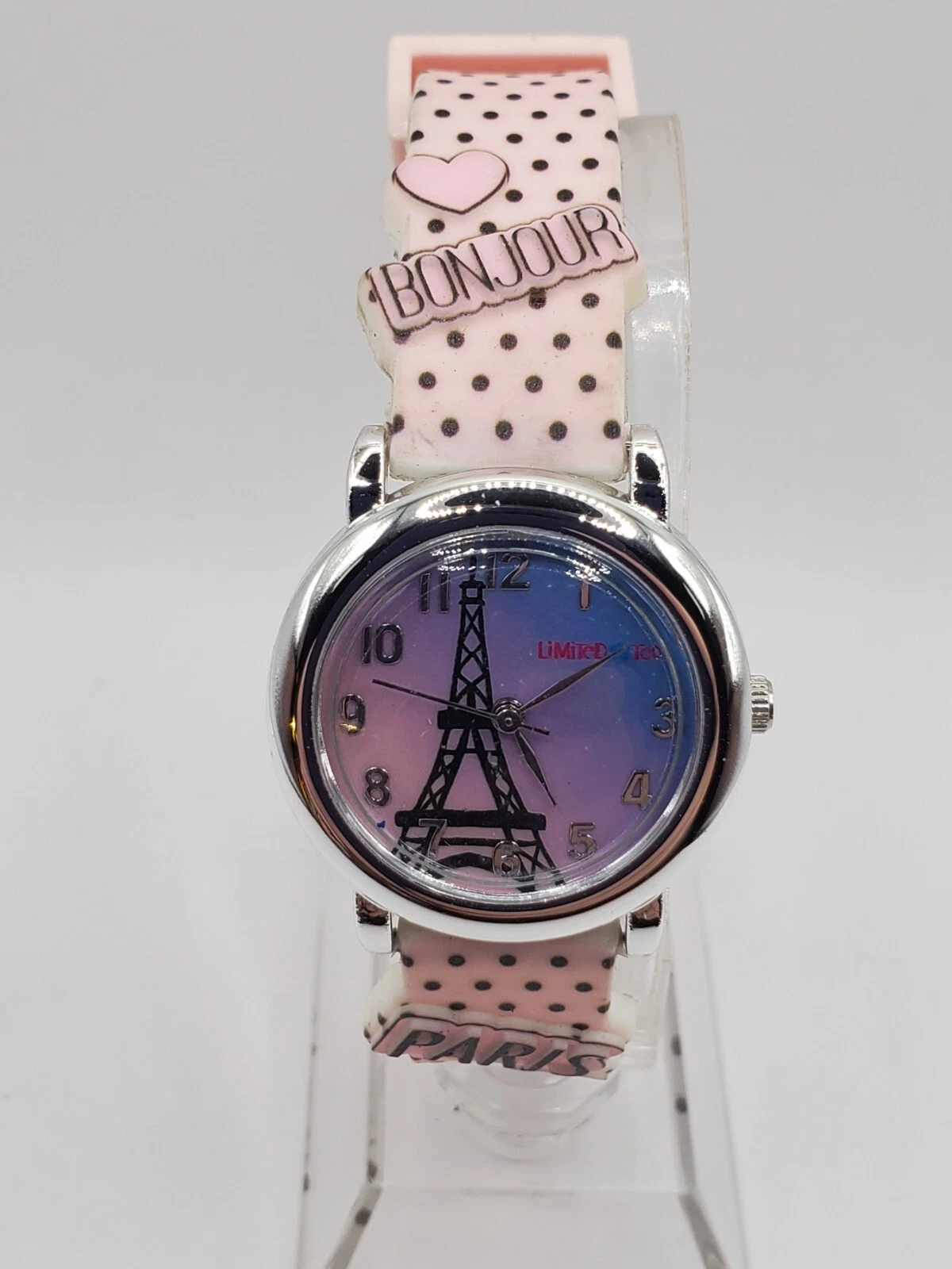 Limited Too Girls Eiffel Tower Quartz Watch 28mm Round Silver Pink Silicone Band