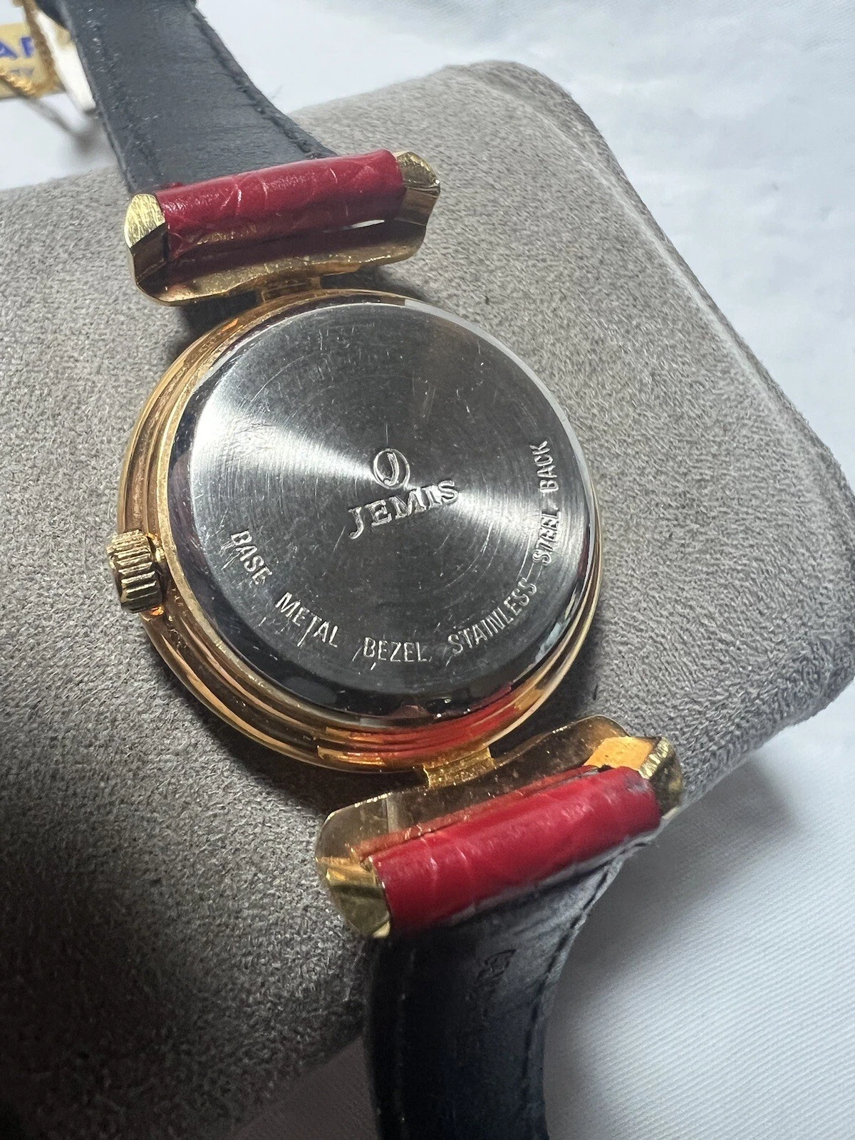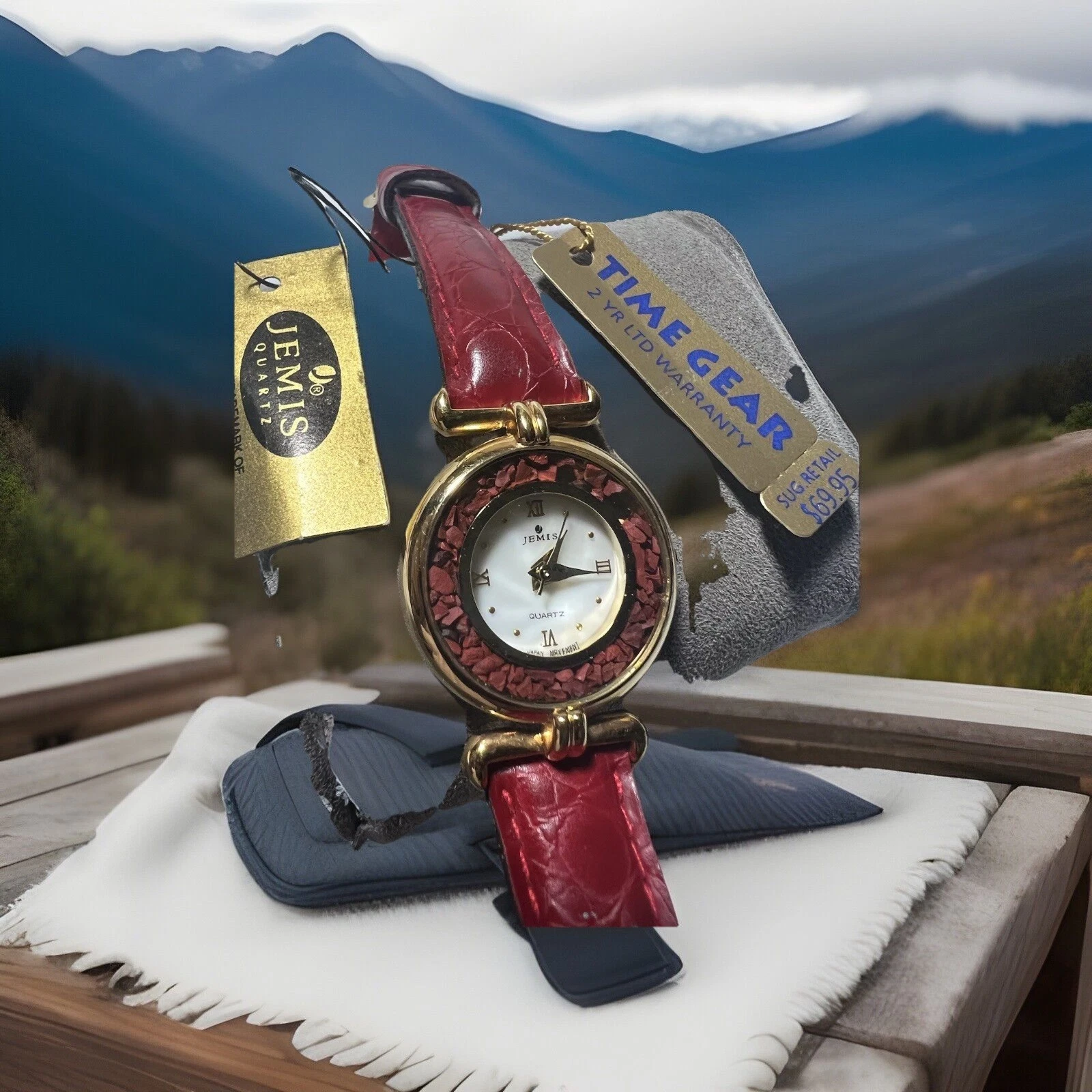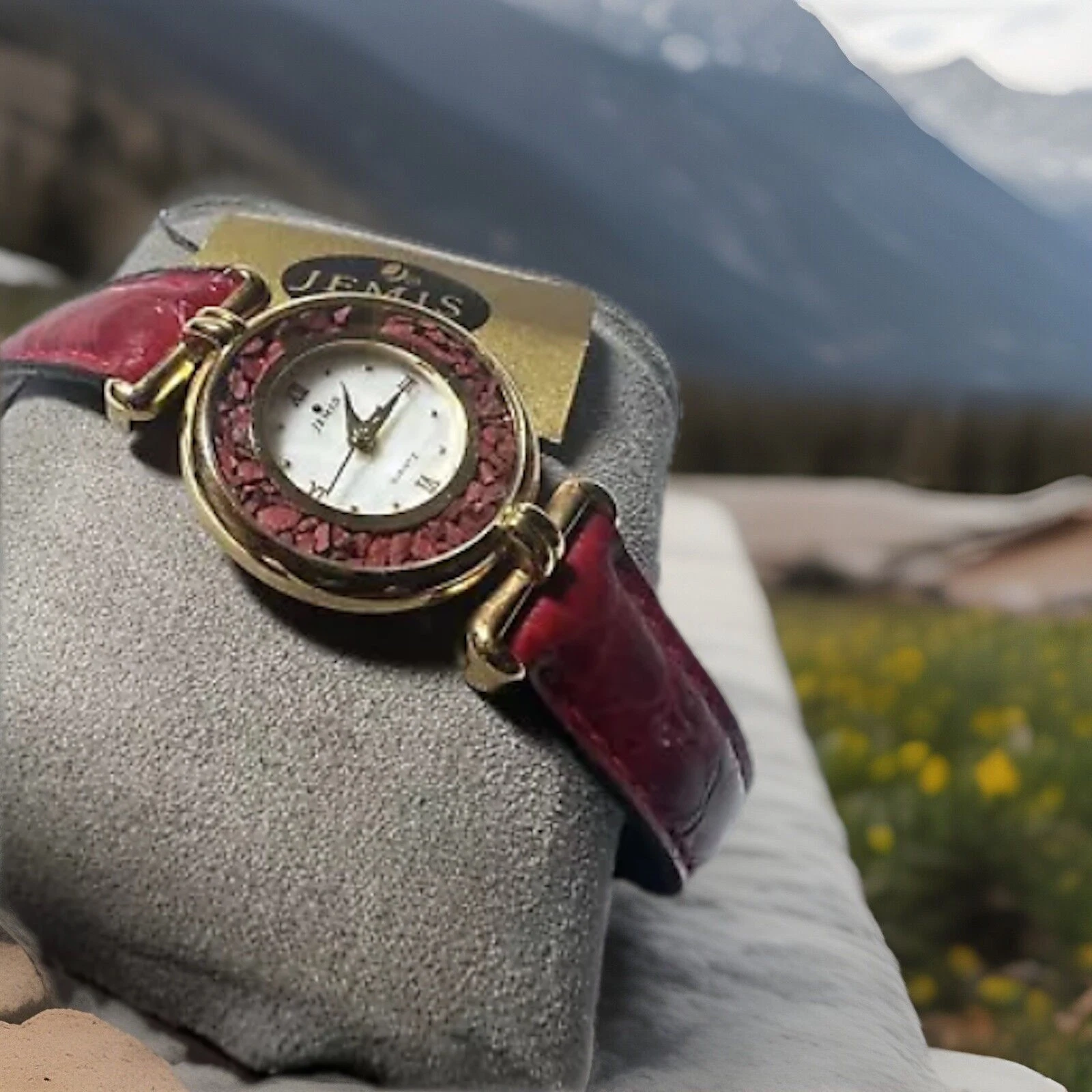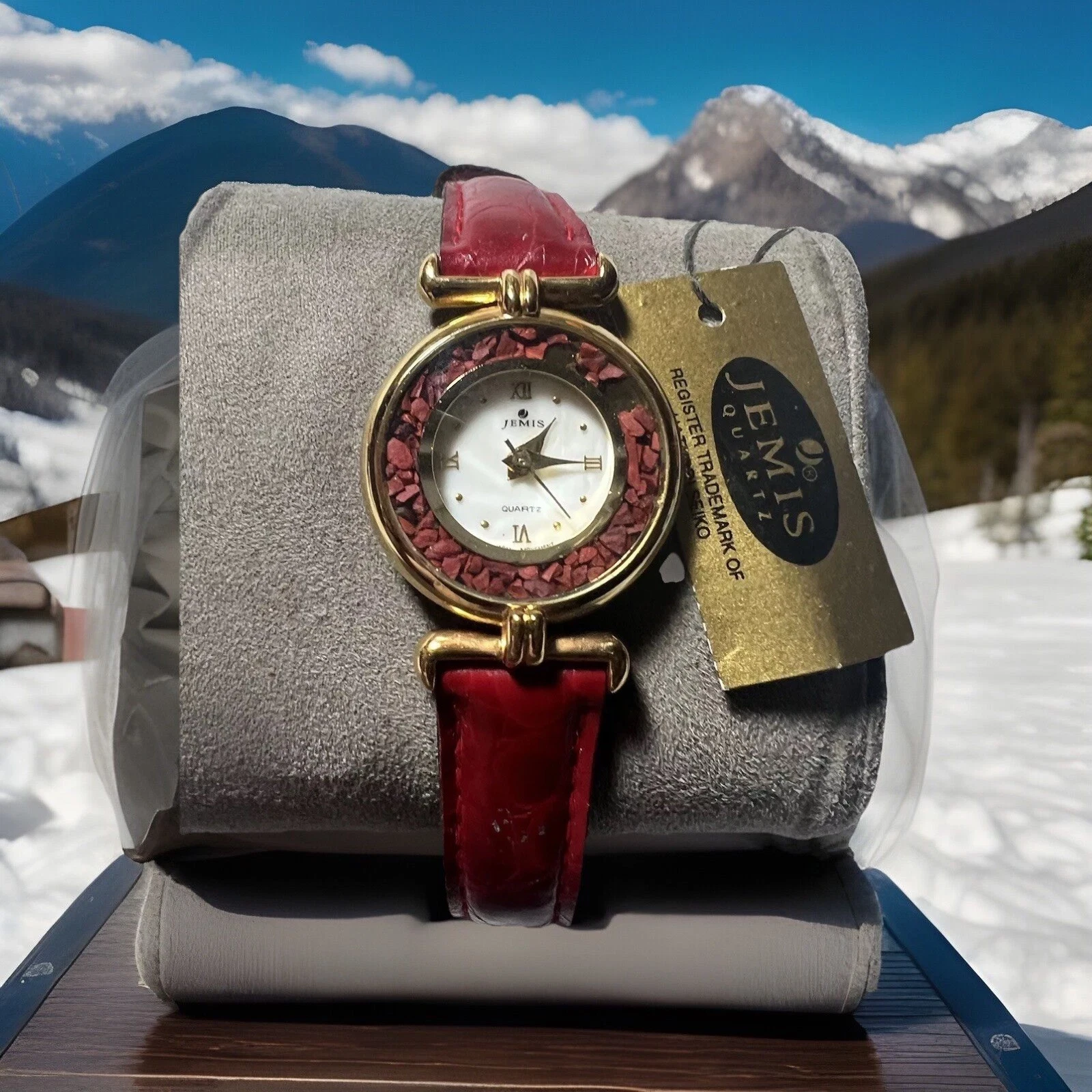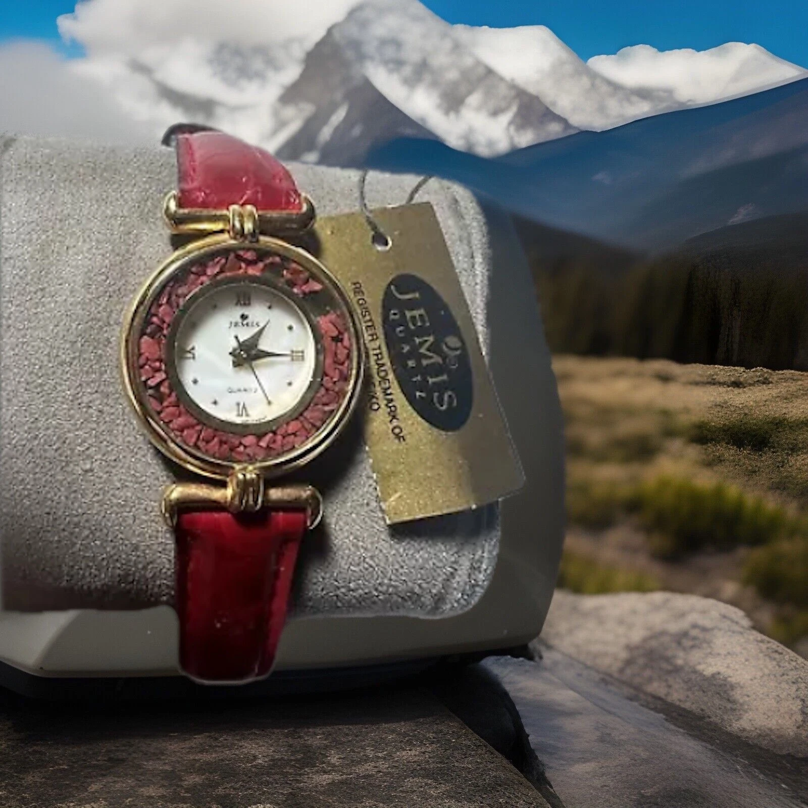 jemis watch, broken stone On Bezel, mother Of Pearl Face,27mm Case,RED Leather