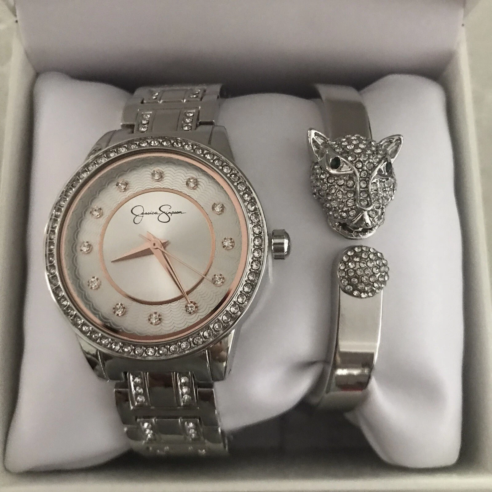 Jessica Simpson JSB8002SL Silver Watch w/ Panther/Tiger Bangle Crystal Pave $120