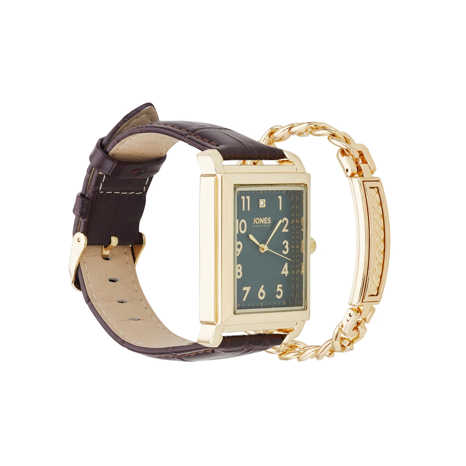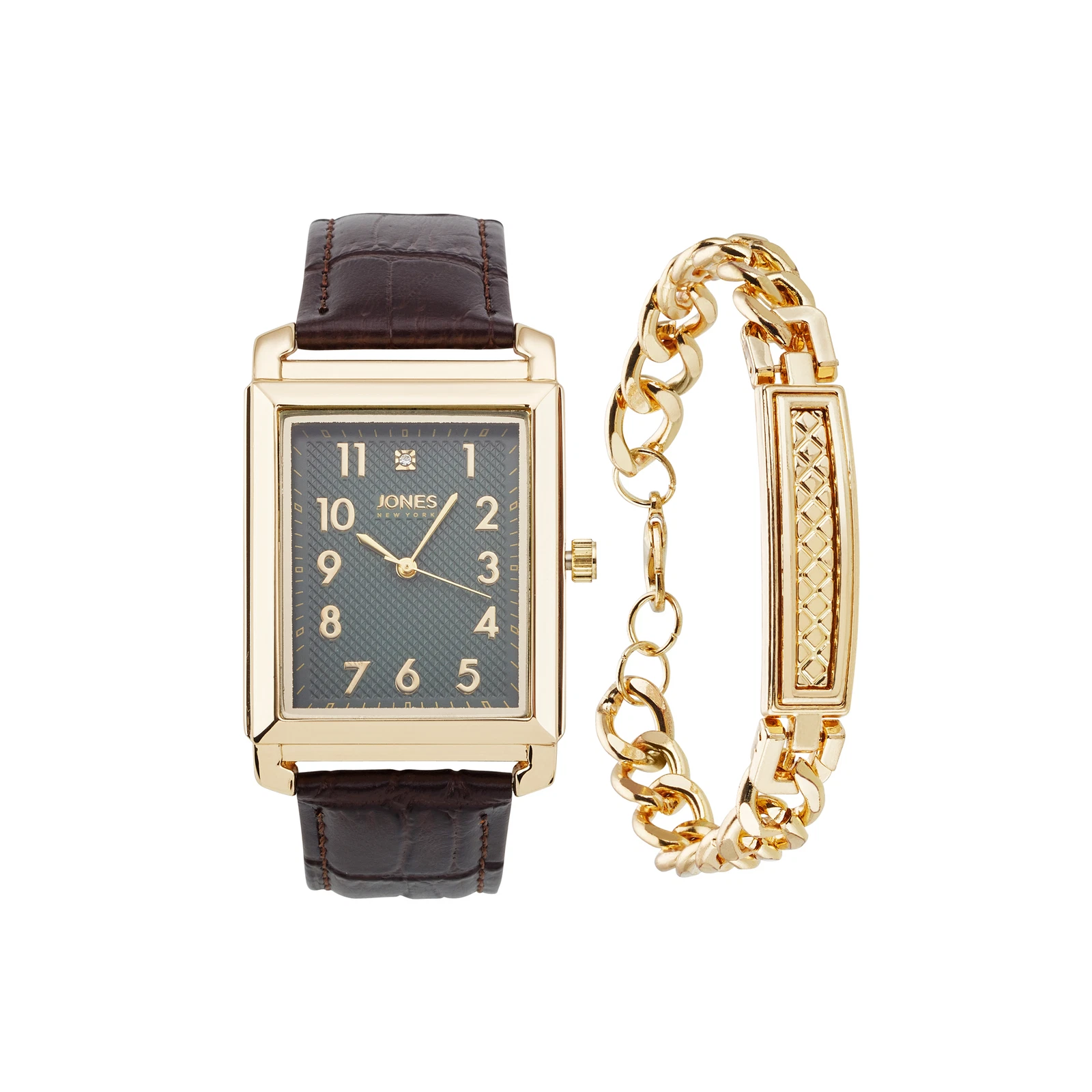 Jones New York Men's Analog Brown PU Watch and Bracelet Set 33mm