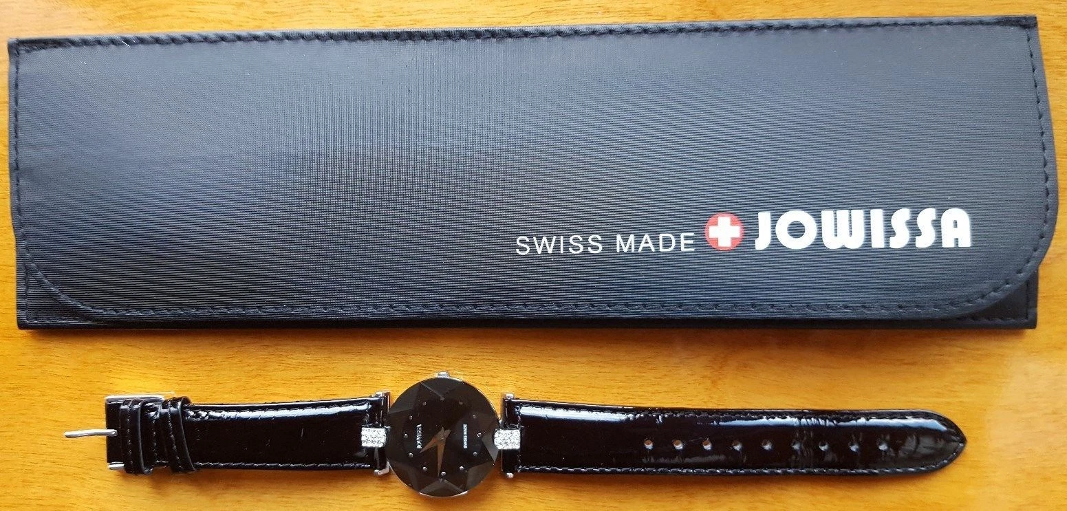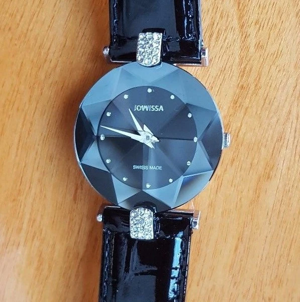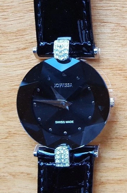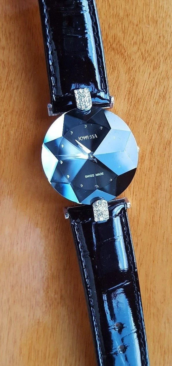 JOWISSA WOMEN'S WRISTWATCH BLACK FACET STRASS STAR CUT LEATHER RHINESTONE NEW