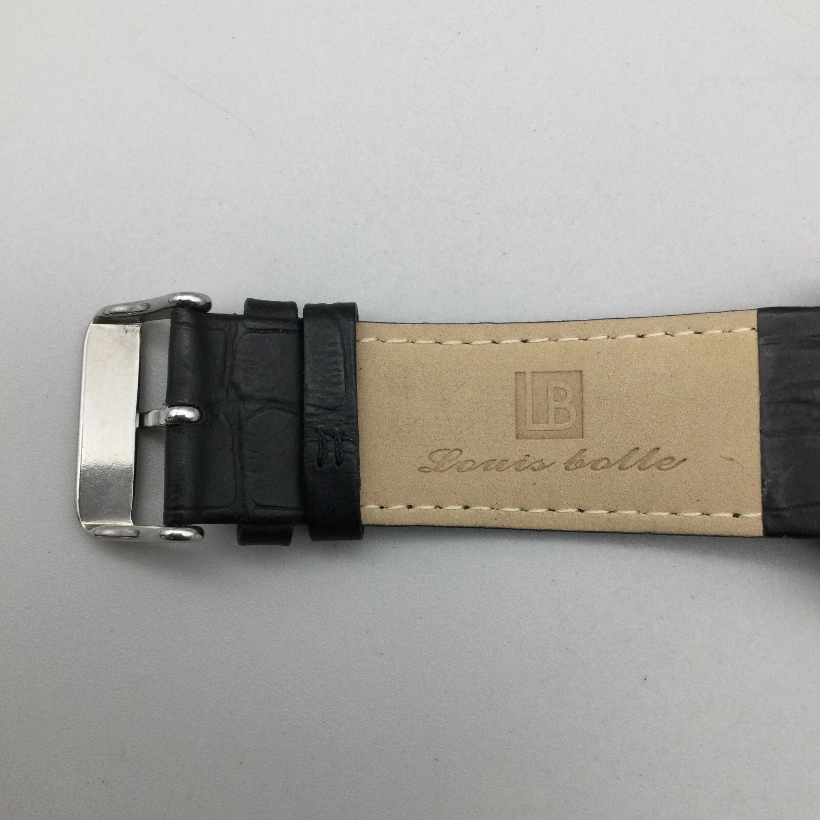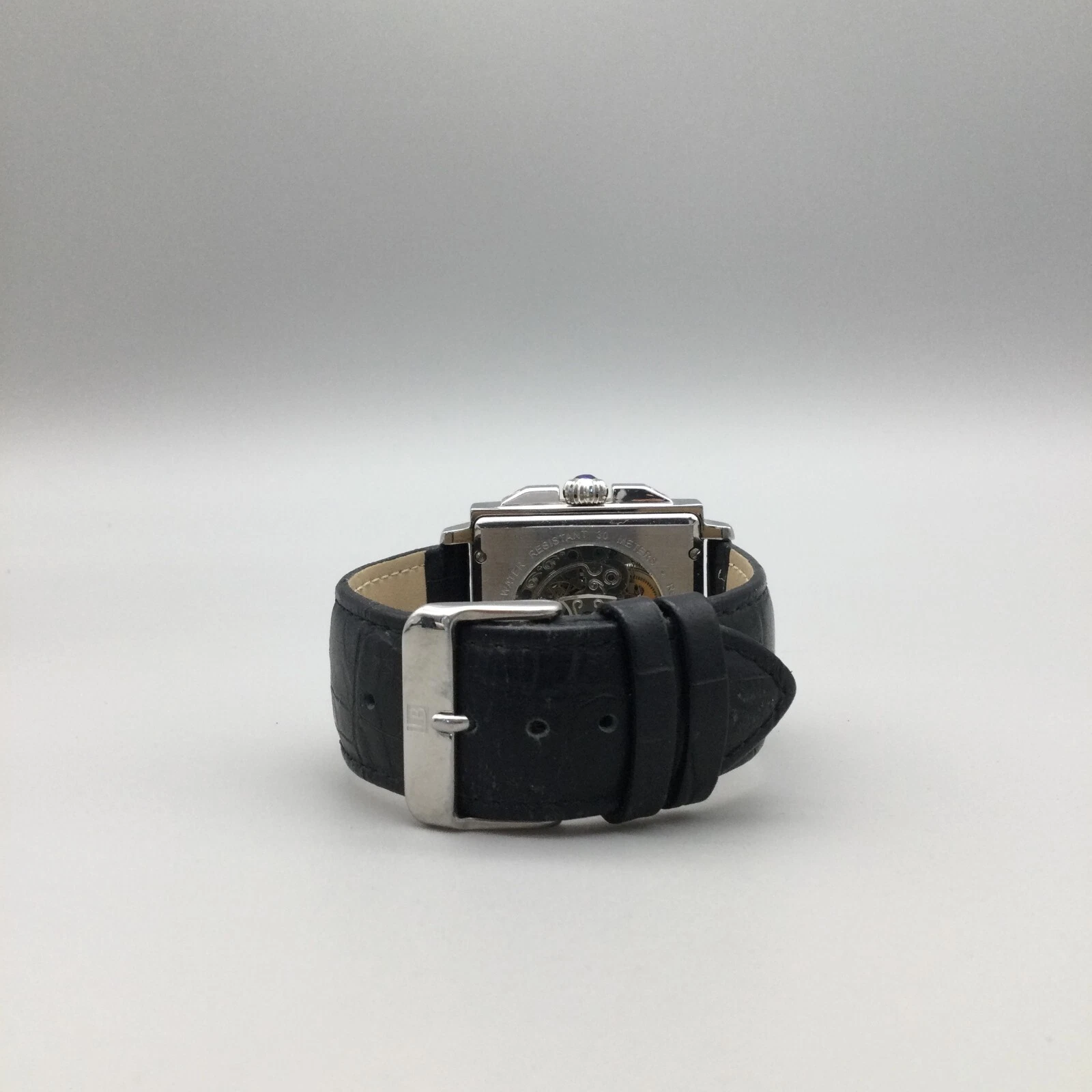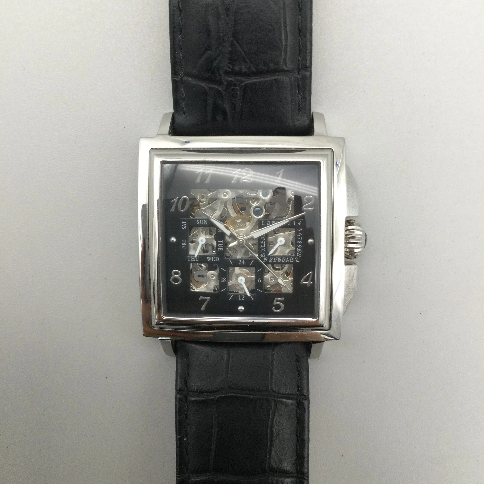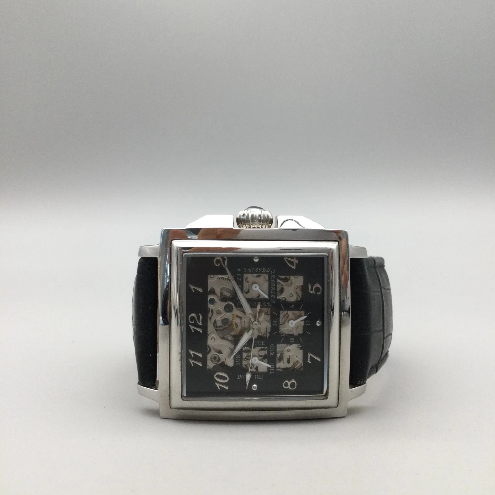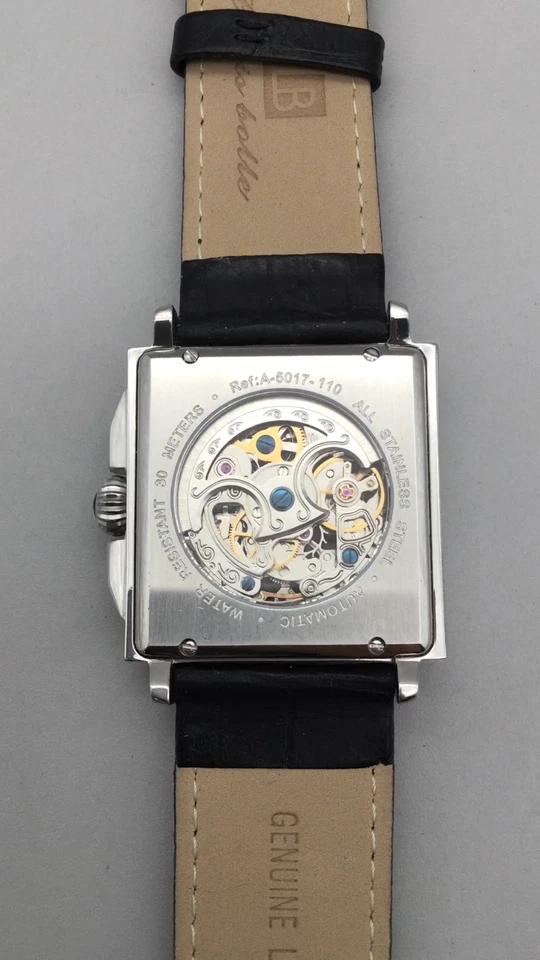 Louis Bolle Skeleton Automatic Watch Men 38mm Silver Tone Day Date Black Leather
