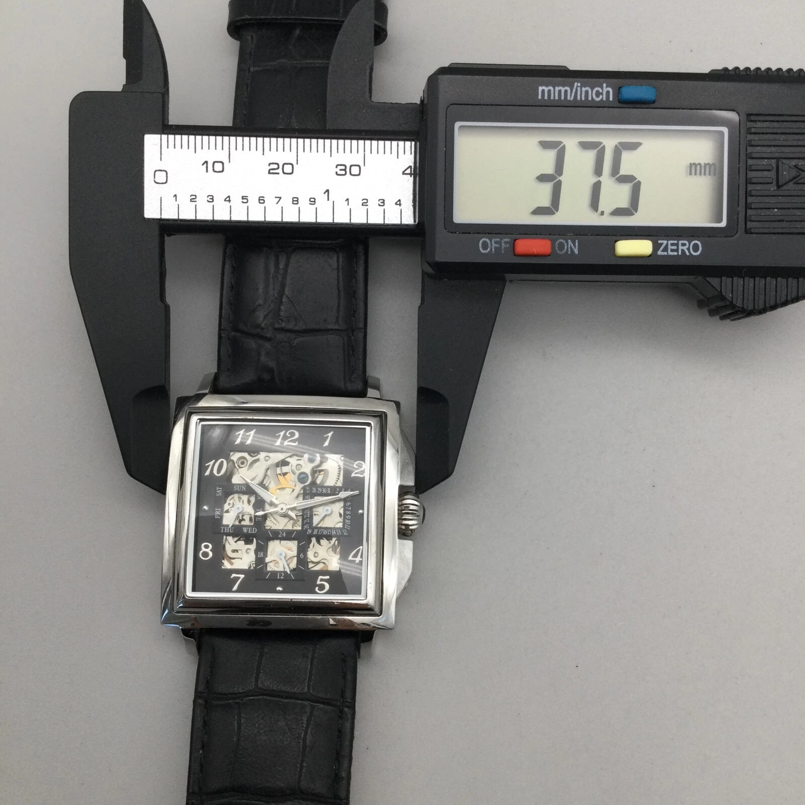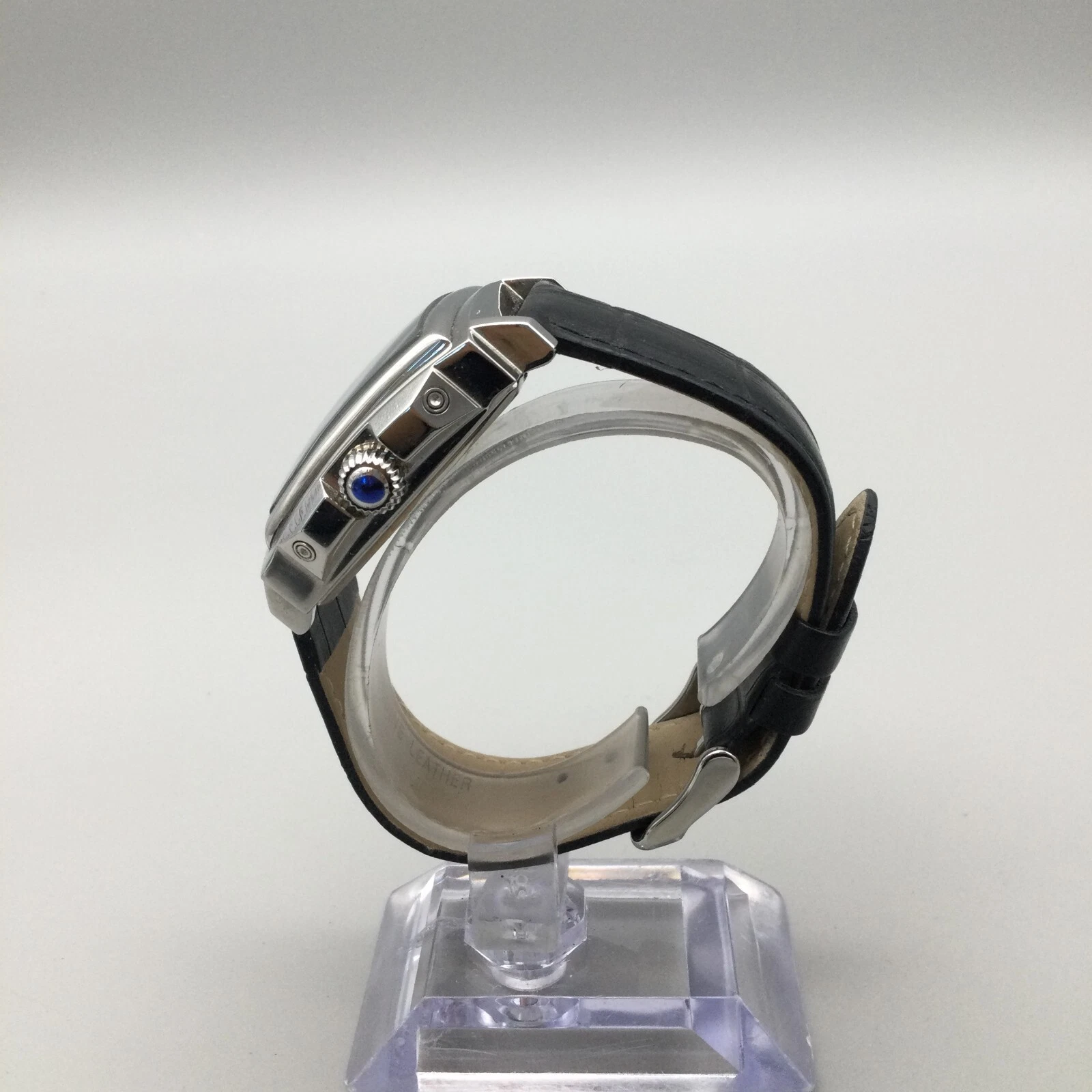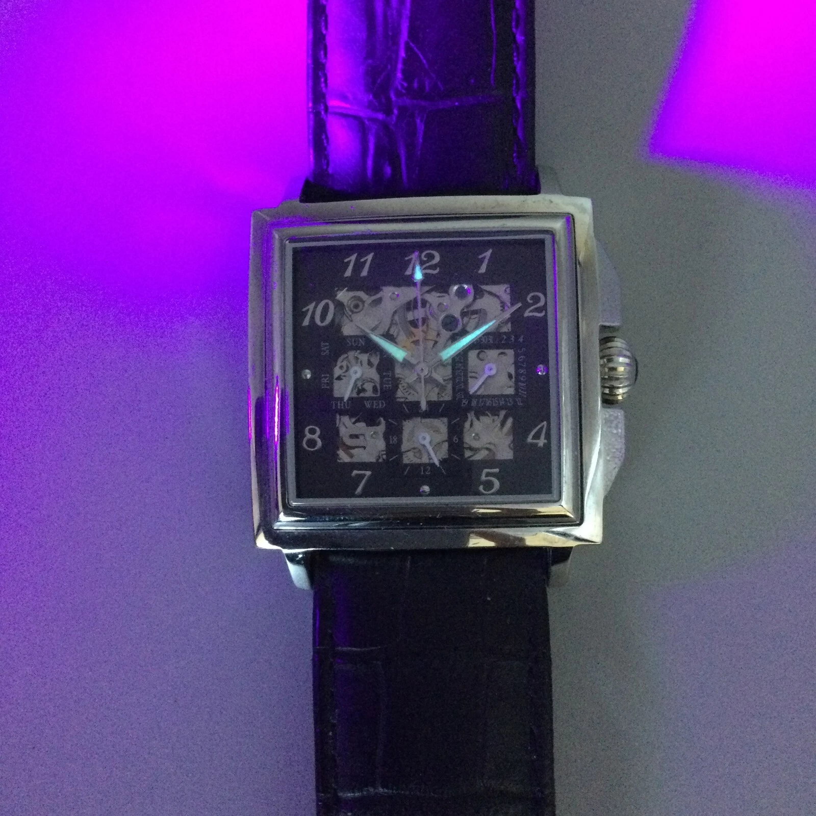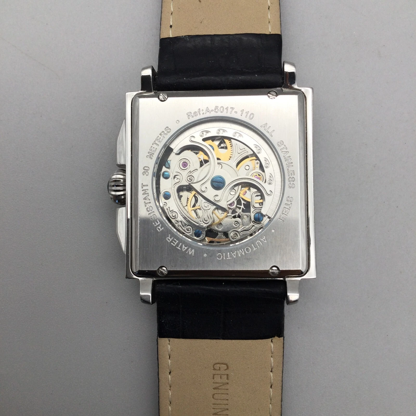 Louis Bolle Skeleton Automatic Watch Men 38mm Silver Tone Day Date Black Leather