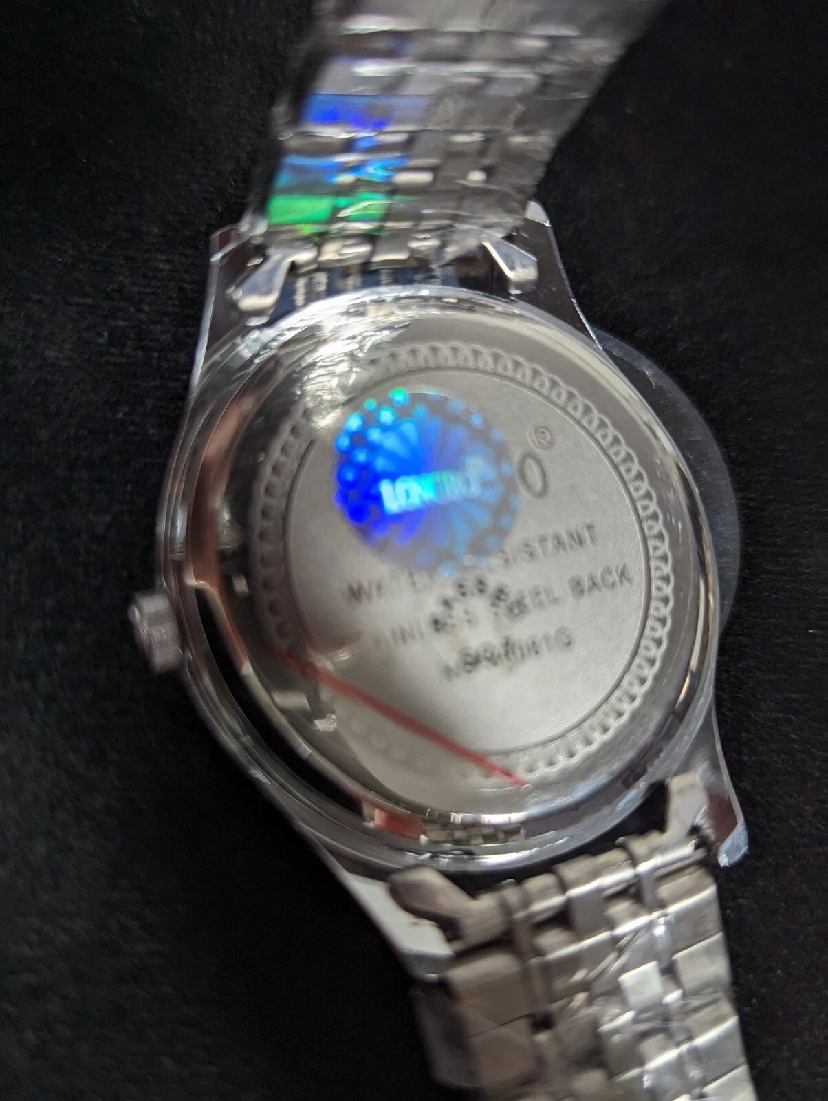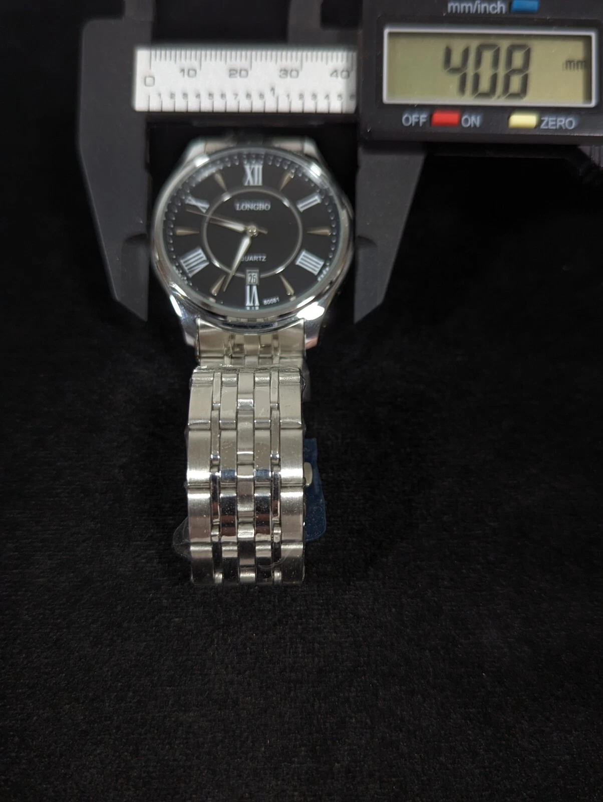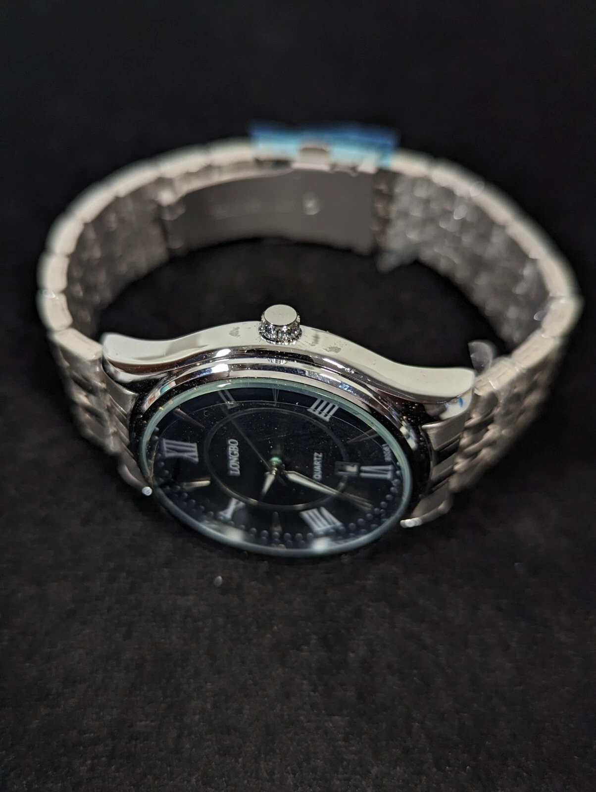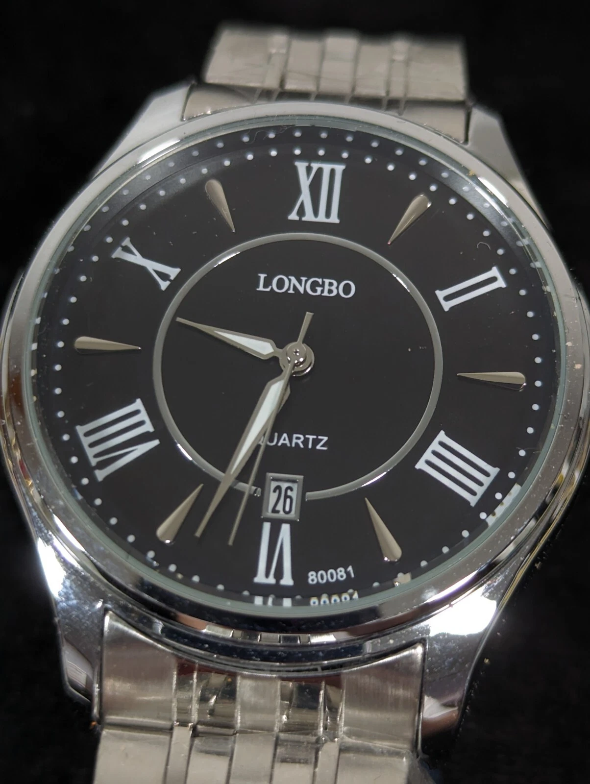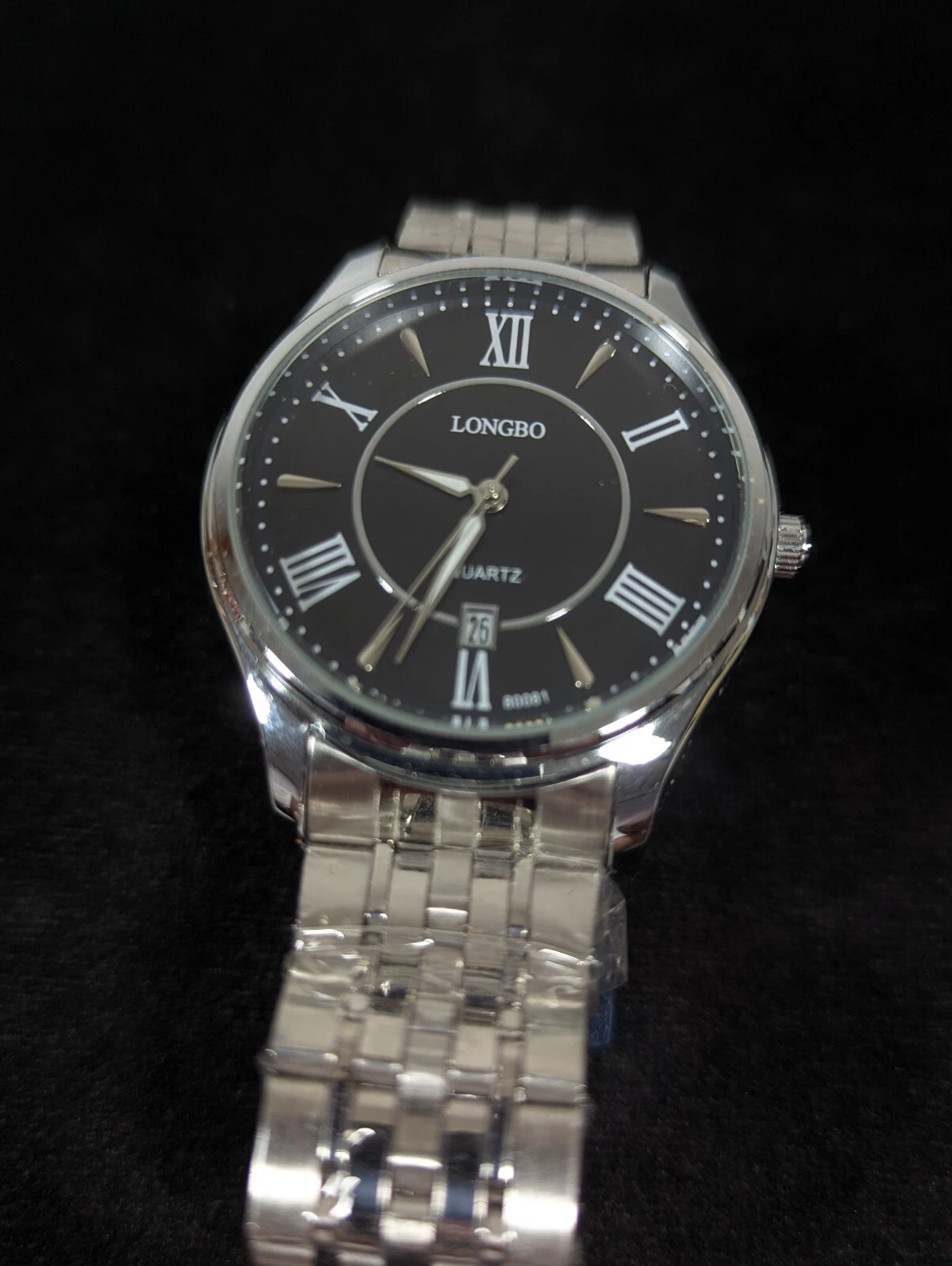 Mens Longbo Black Dial Date Indicator Stainless St Band Watch NEW In Plastic