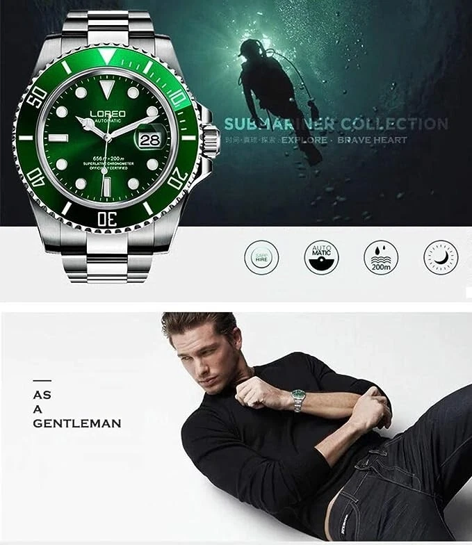 44mm Loreo Men Luxury Automatic Sub Diver Stainless Steel 200M Waterproof Watch