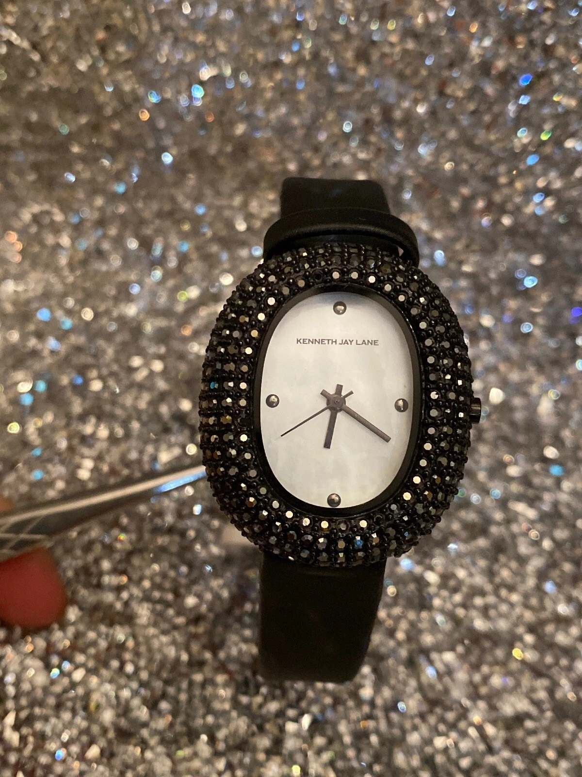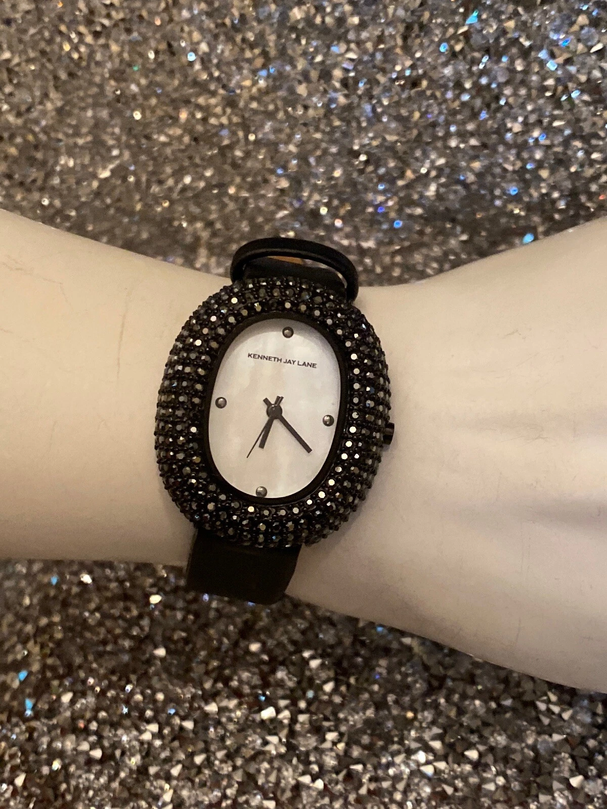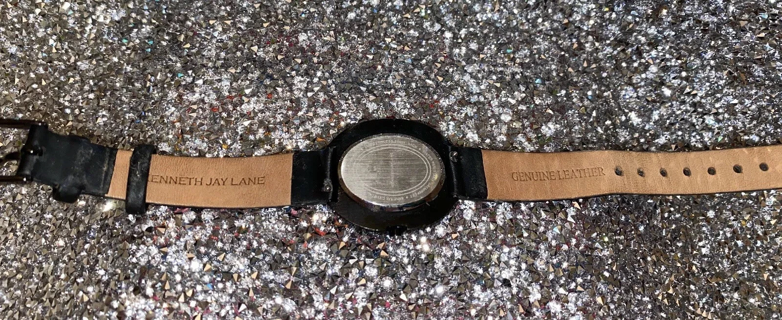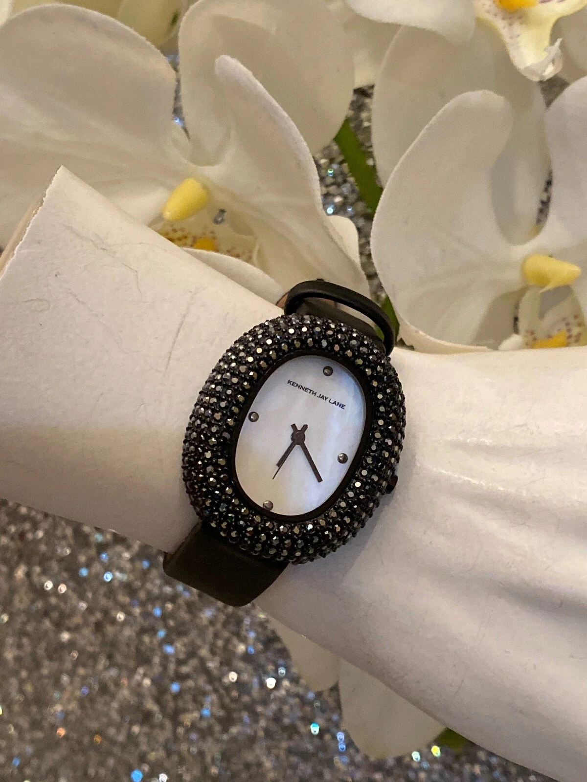 Kenneth Jay Lane KJL Ladies Crystal Studded Black Leather Watch