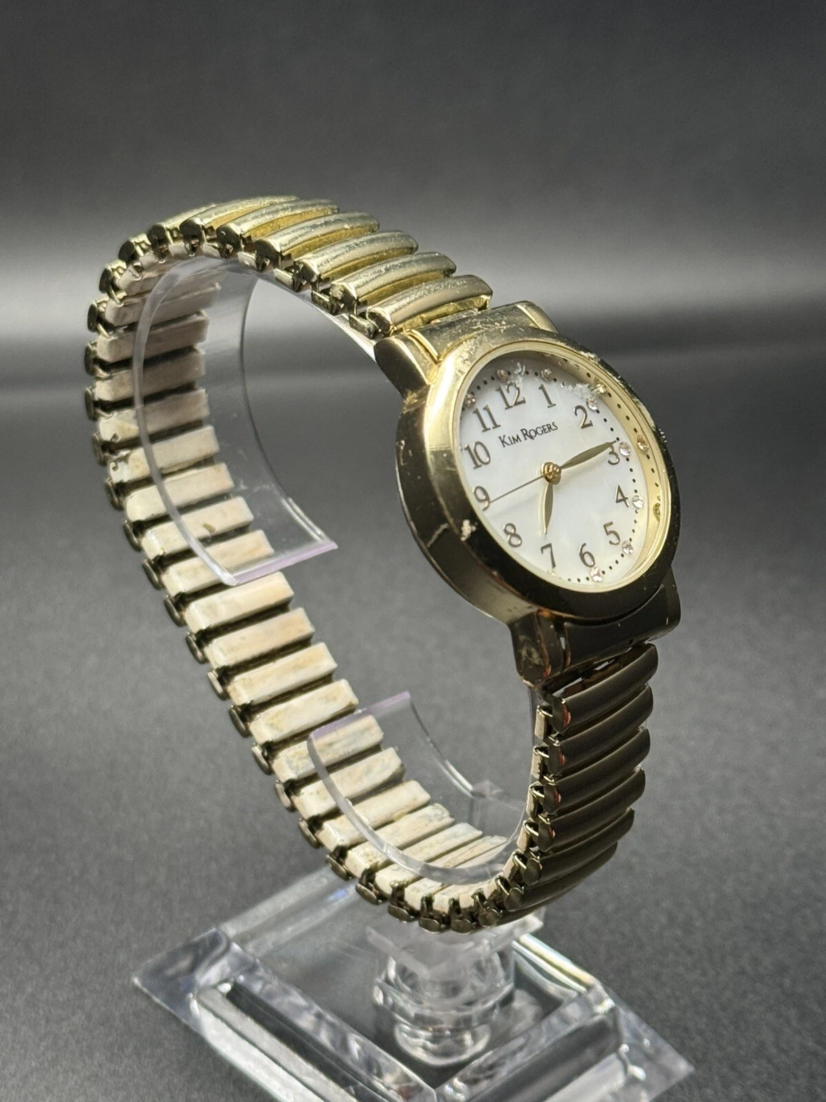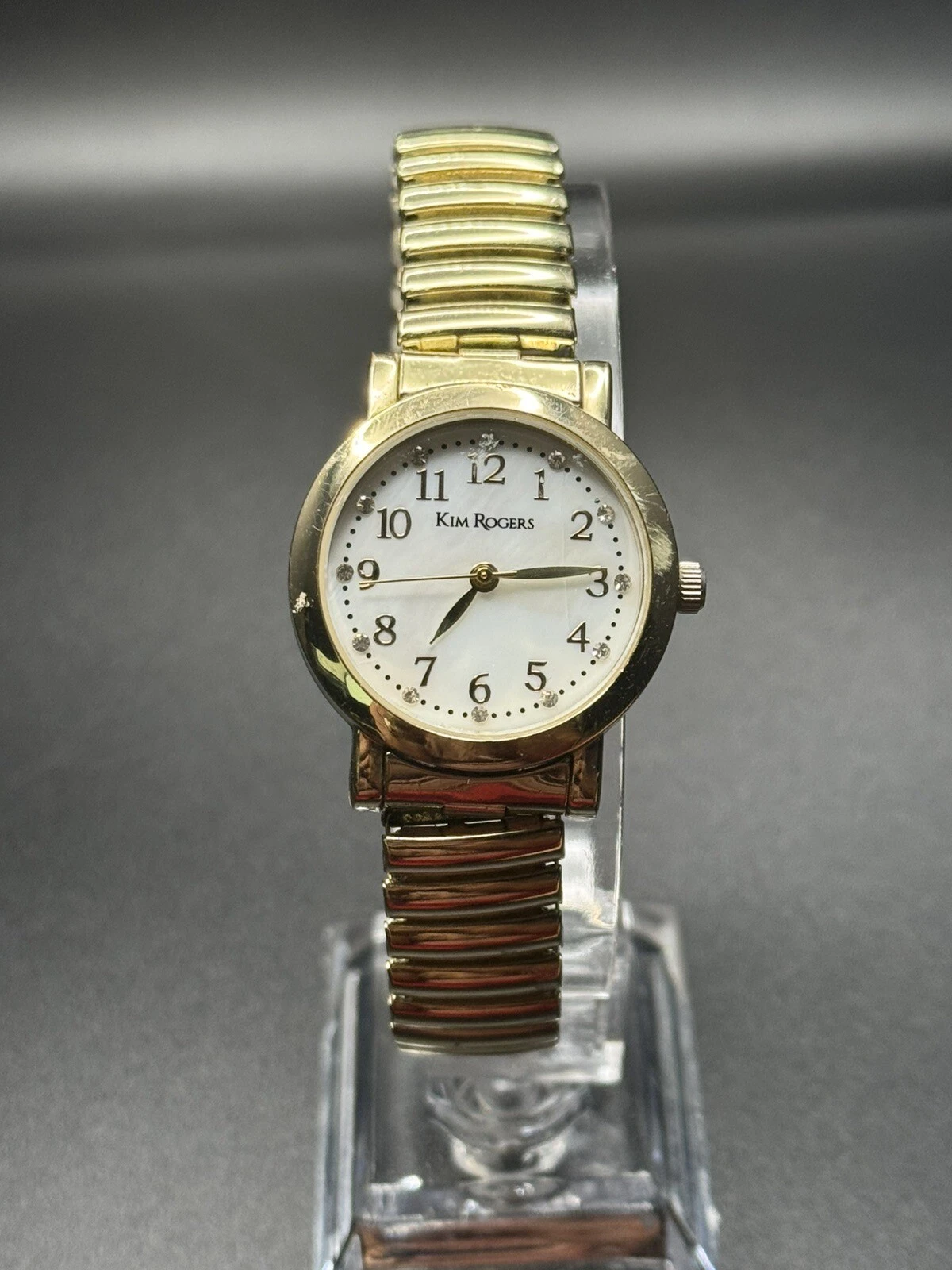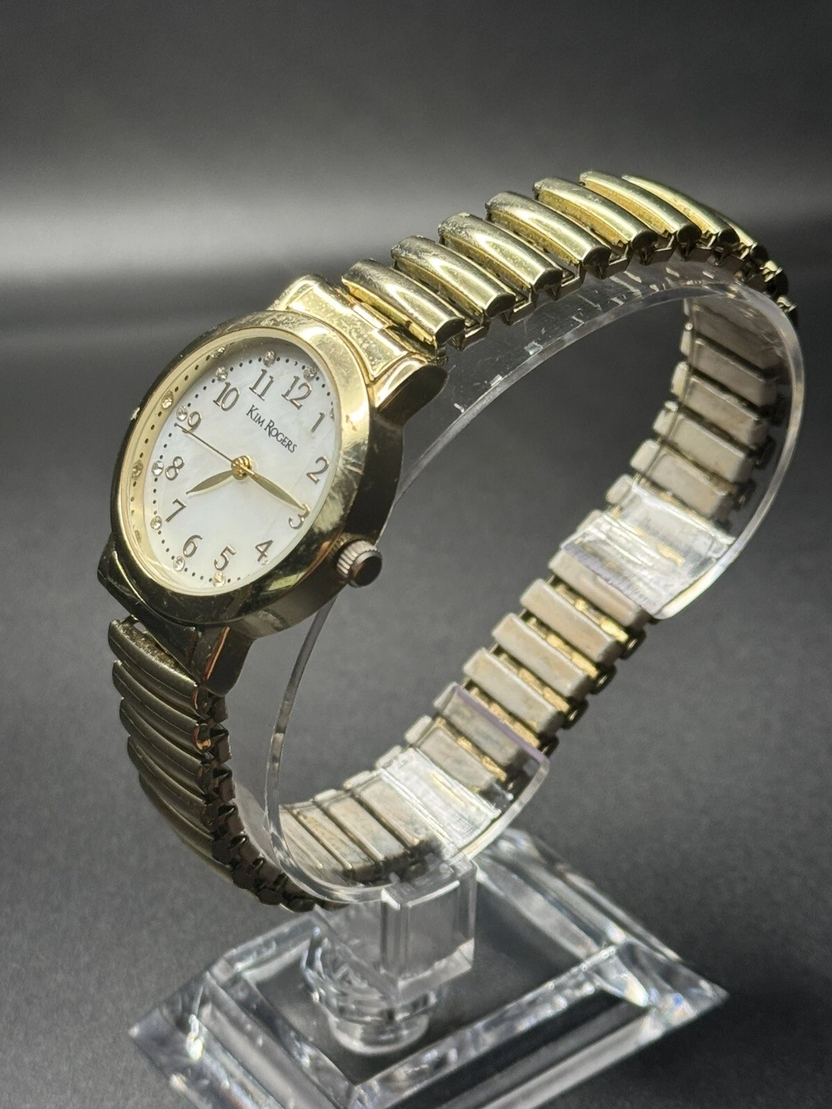 Vintage Gold Tone Women’s Kim Roger’s Watch White Pearl Dial W/ Stretch Band Use