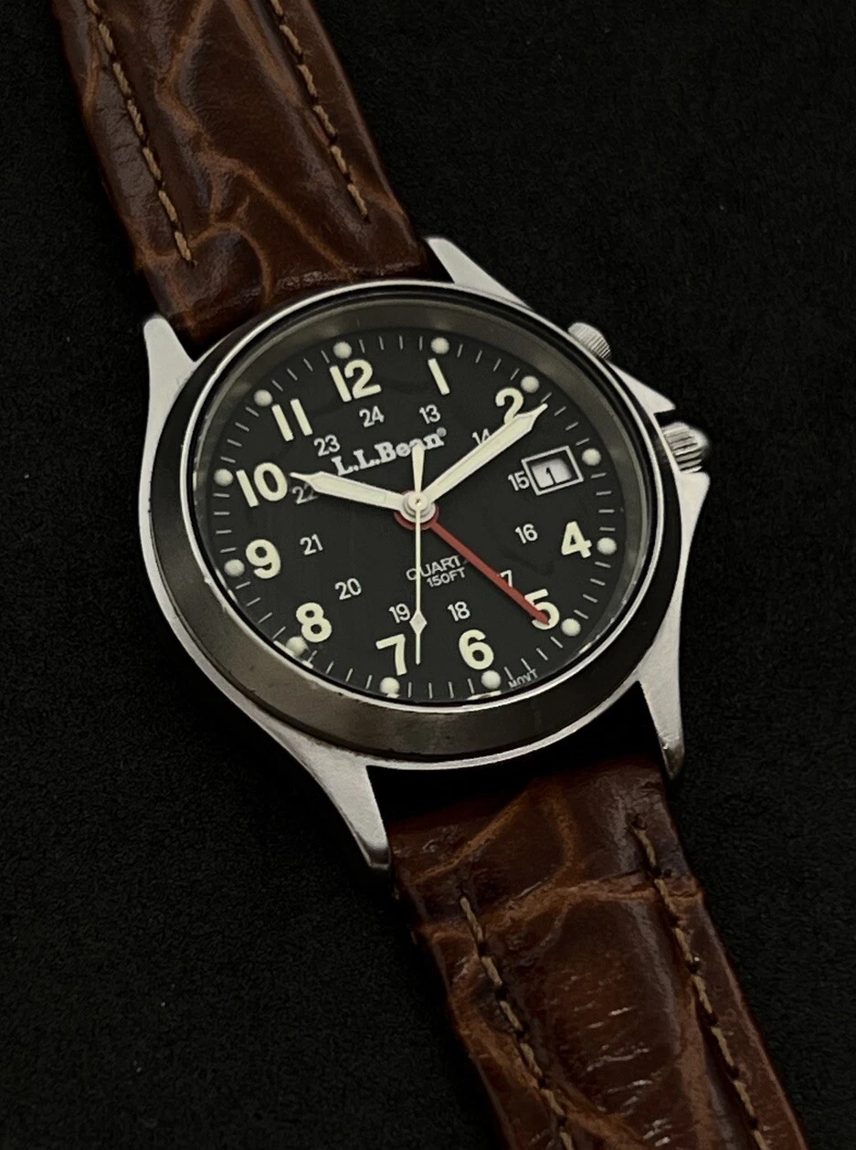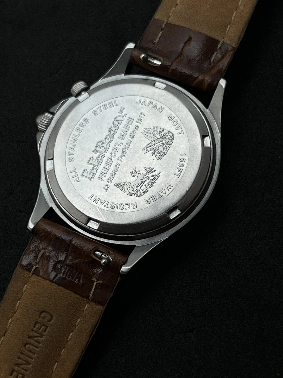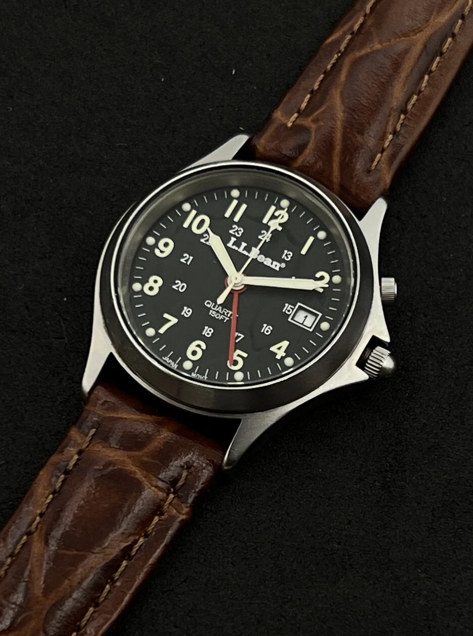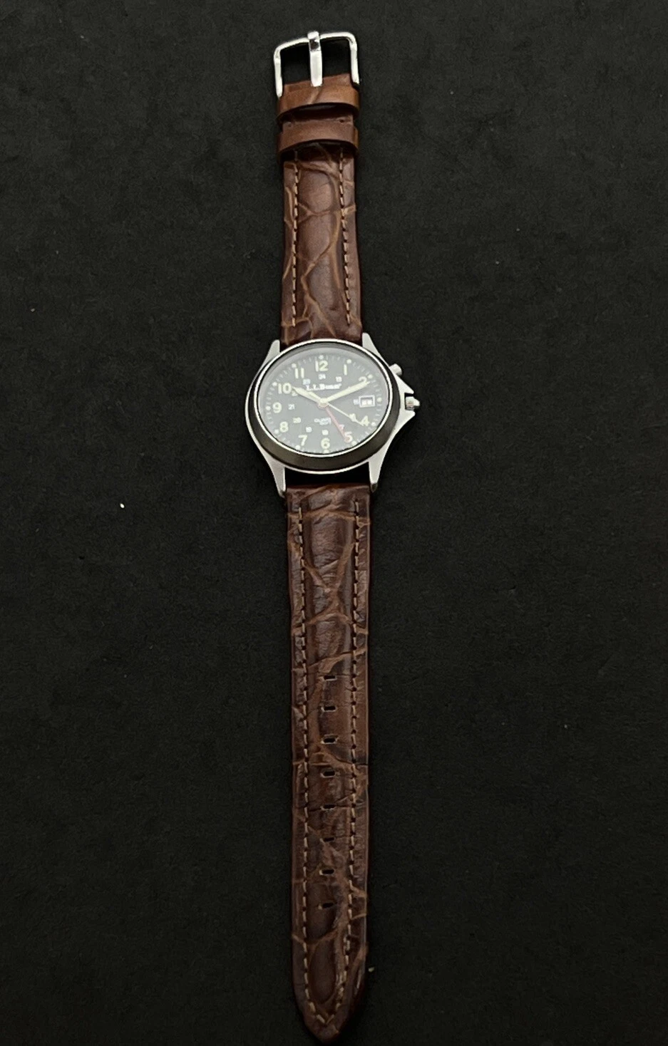 Vintage LL BEAN Men's 36mm Alarm Date Quartz Watch Steel Black Tan Leather