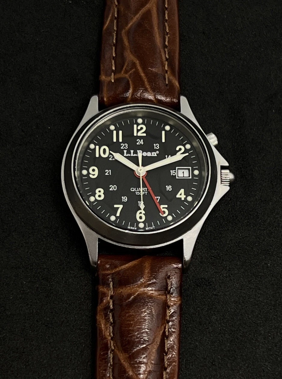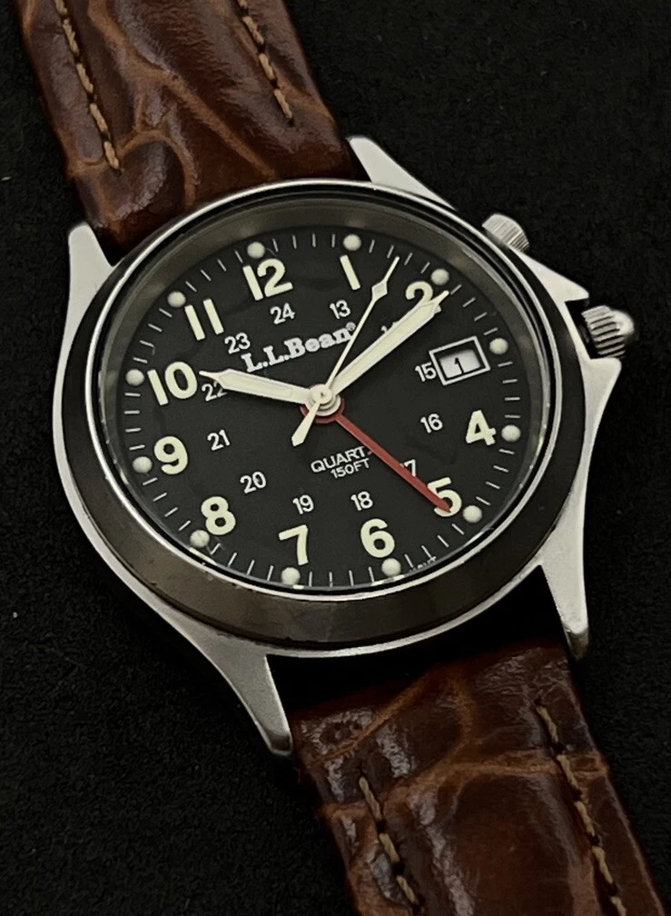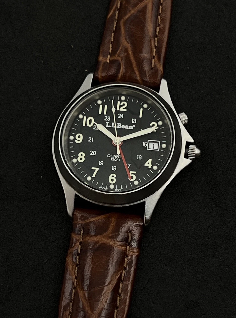 Vintage LL BEAN Men's 36mm Alarm Date Quartz Watch Steel Black Tan Leather
