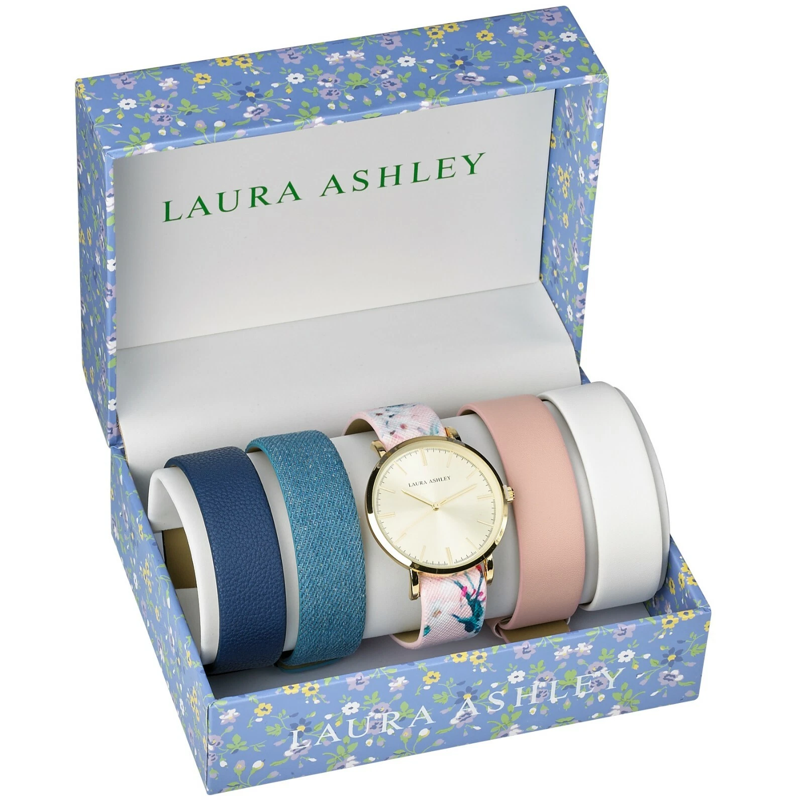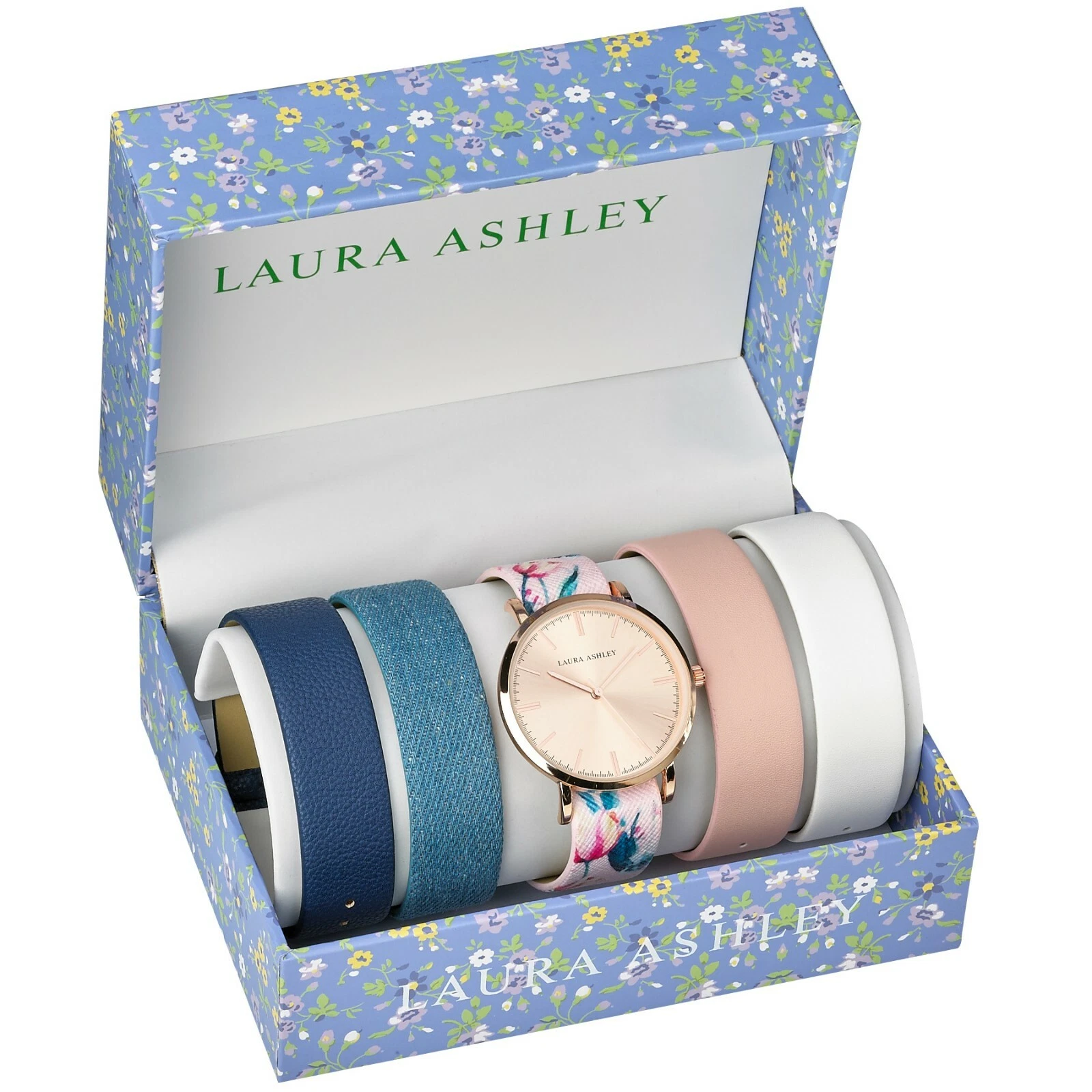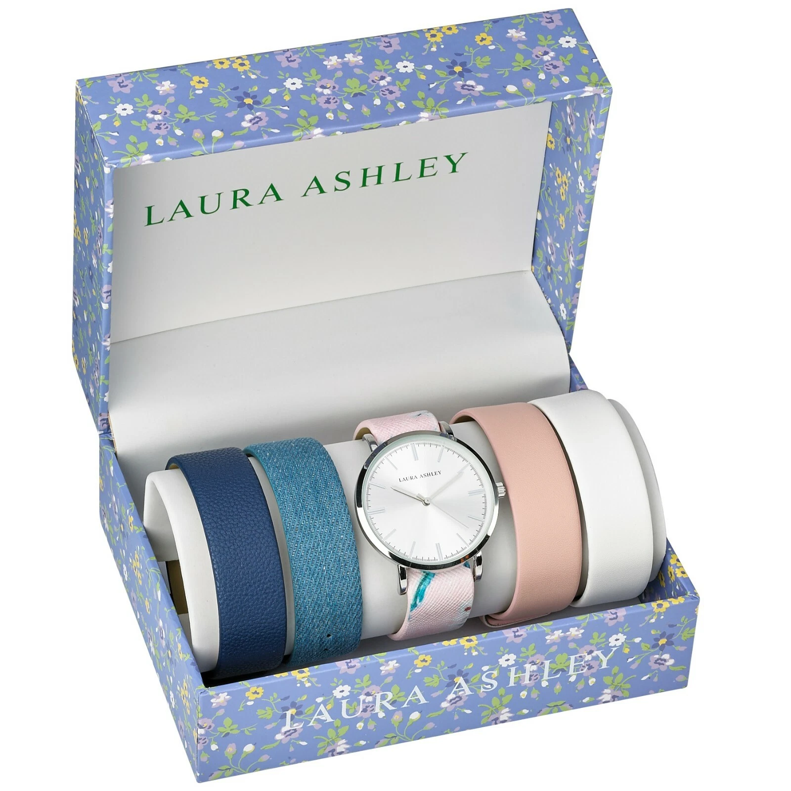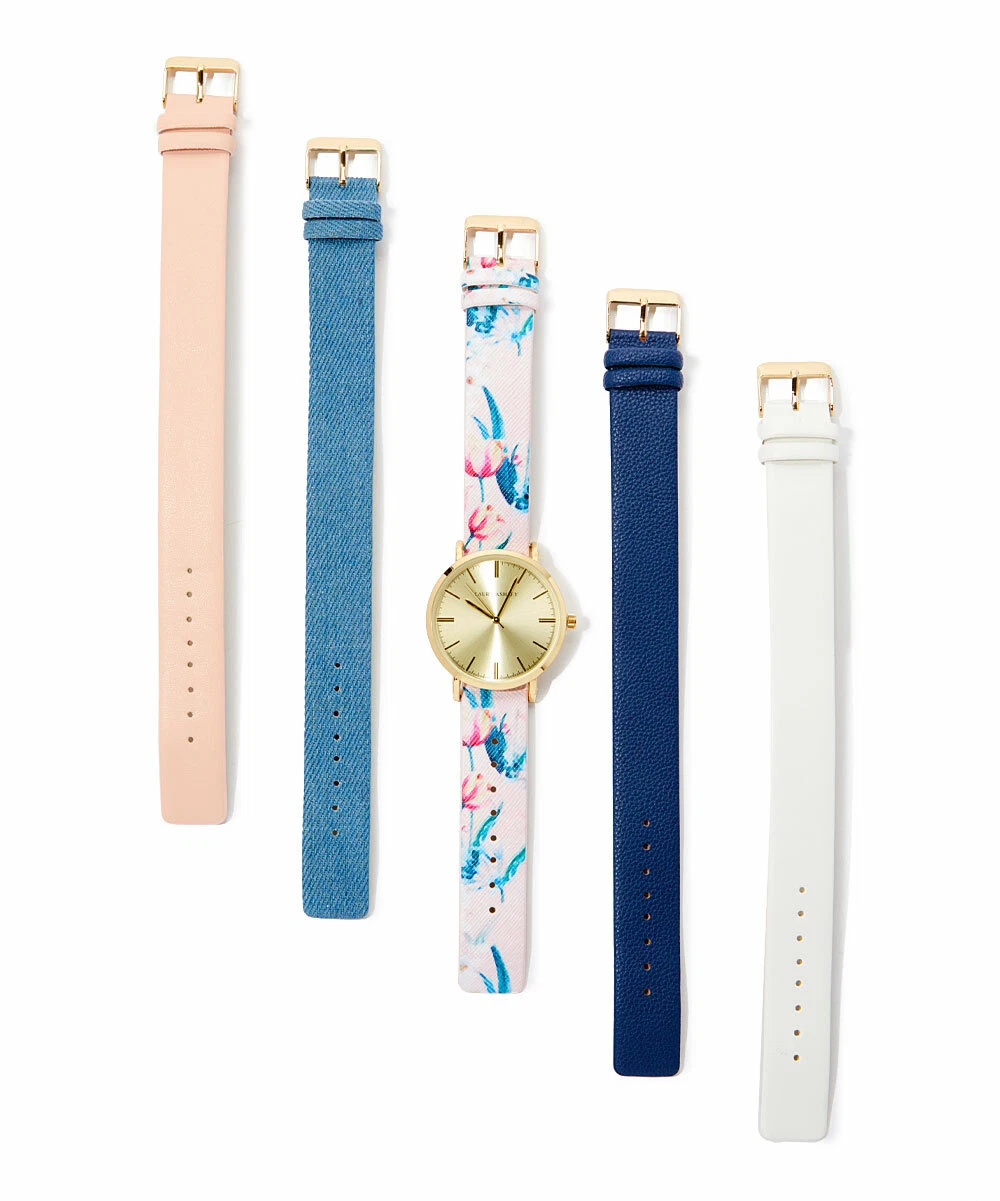 Laura Ashley Women's Mirror Dial Floral Strap Watch Set 4 Interchangeable Straps