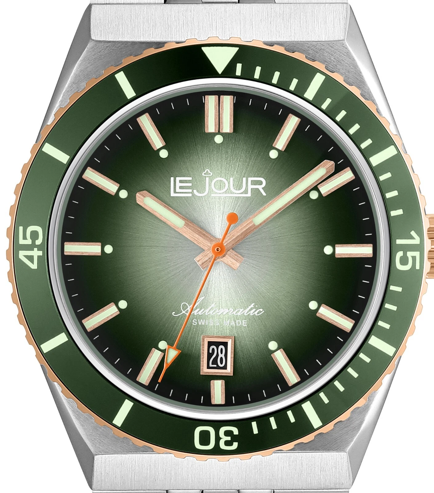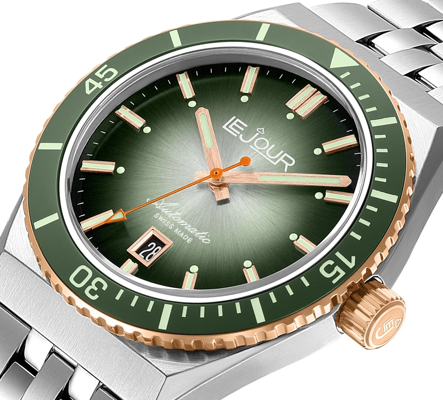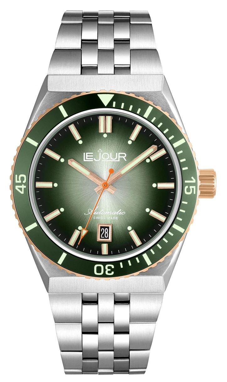 Le Jour Delmare Automatic Divers Watch Green/Gold Sunray. Authorised Dealer