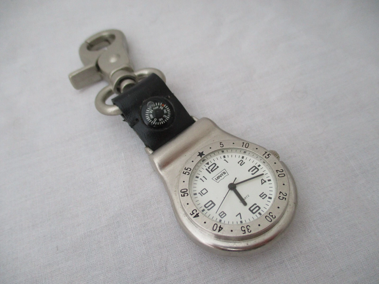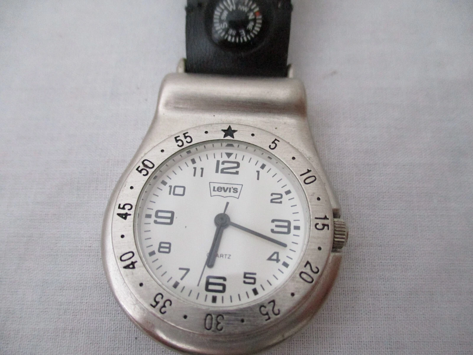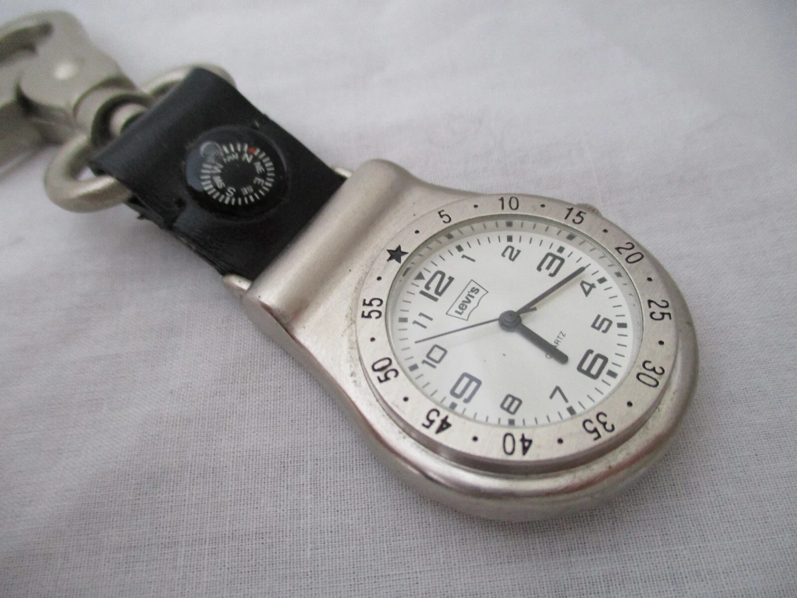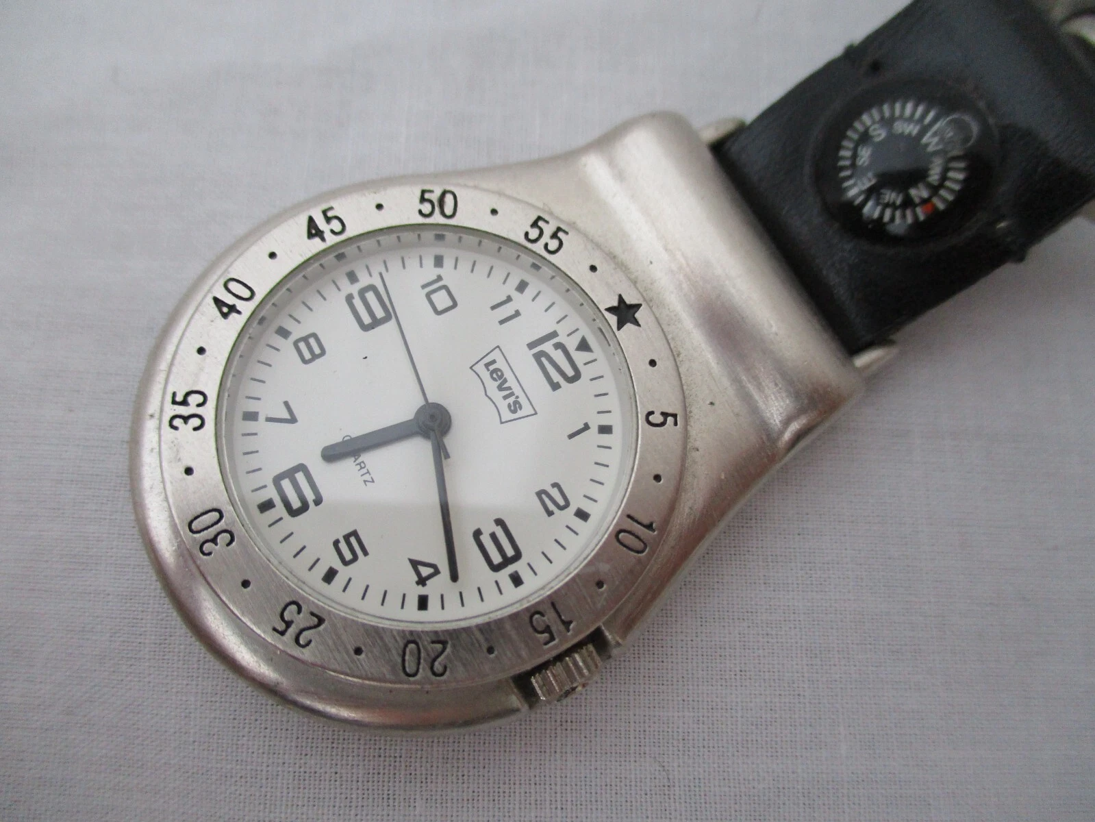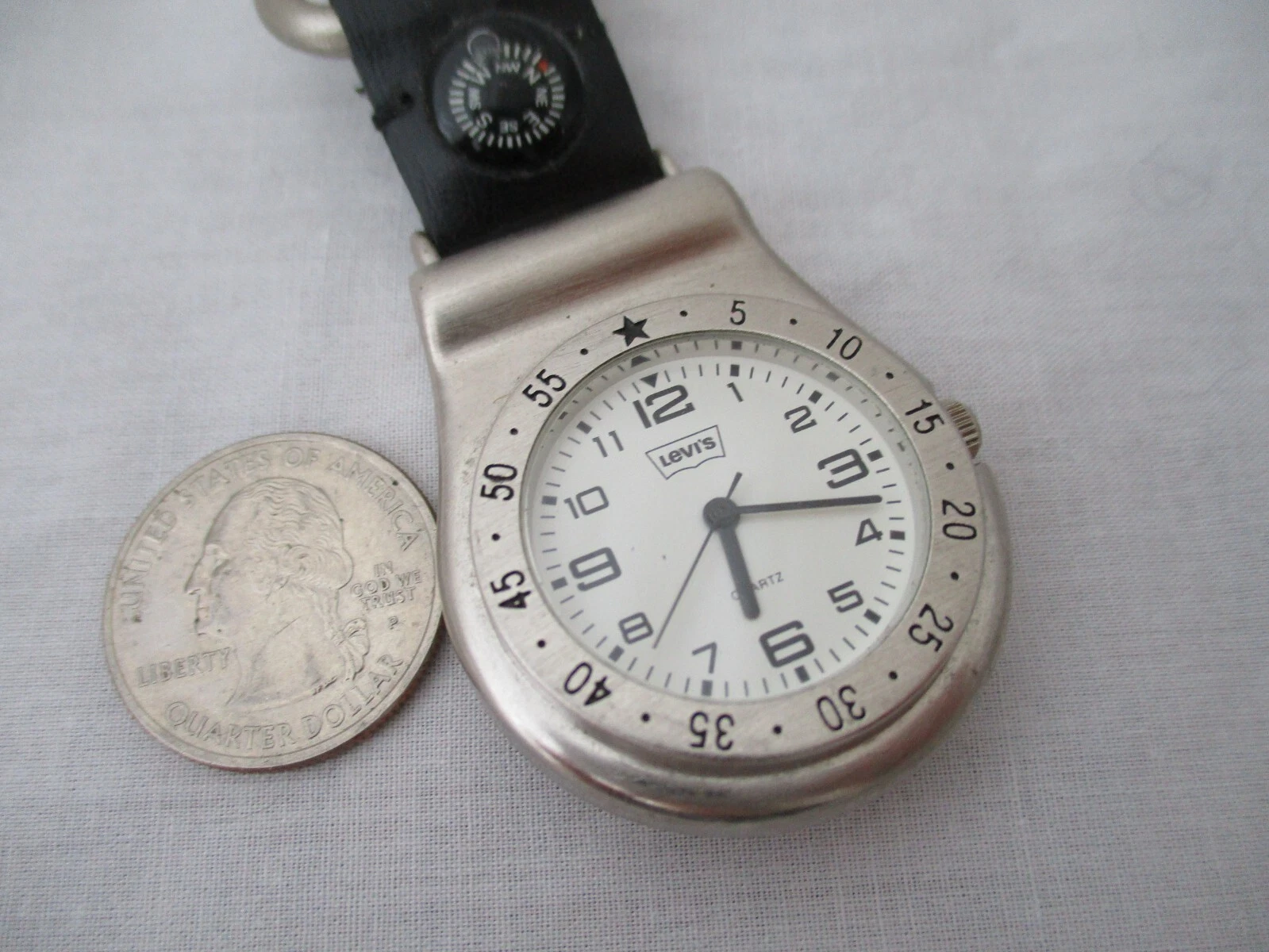 Levi's Clip On Watch Silver Tone Round White Face Compass *Working*