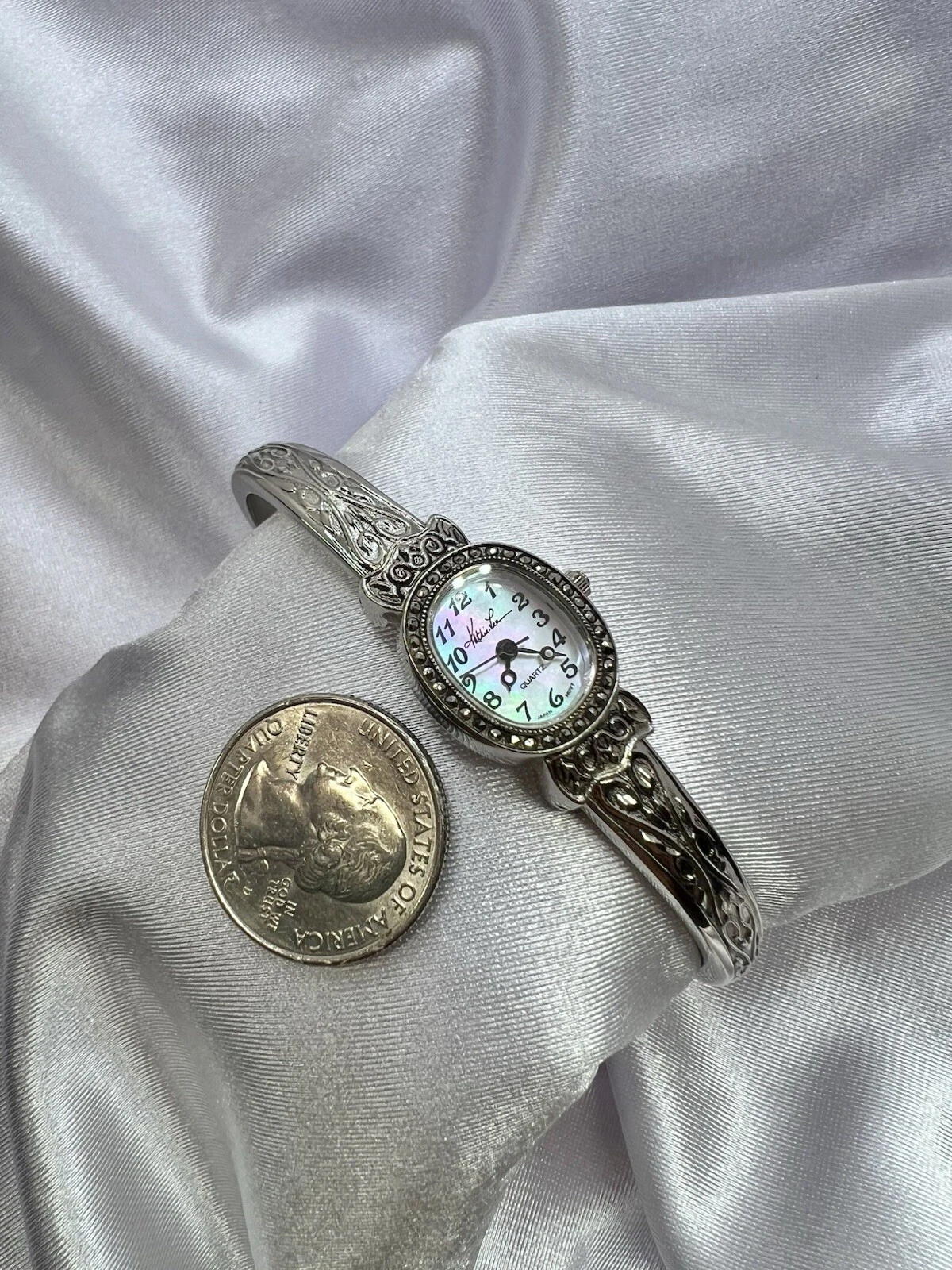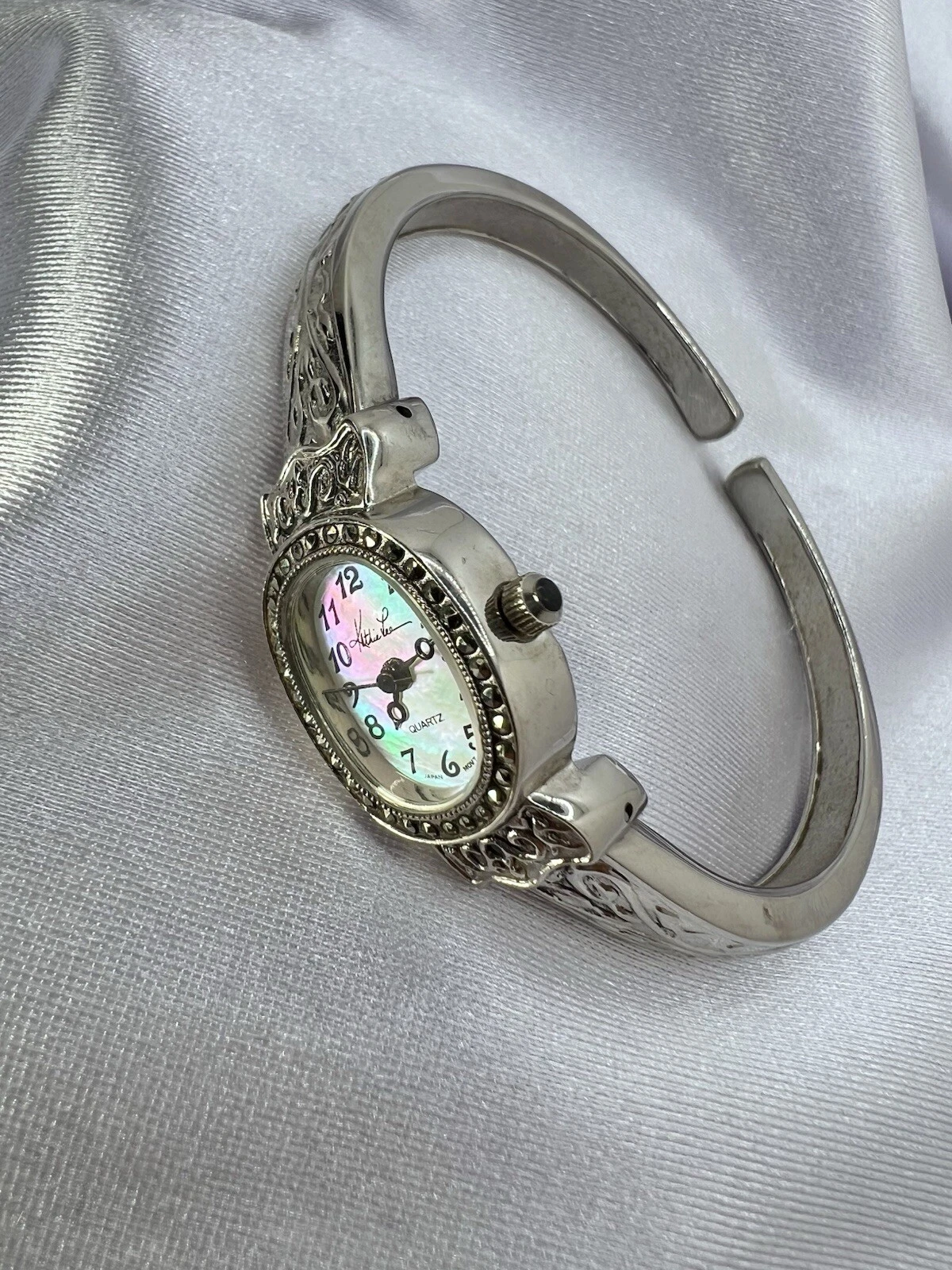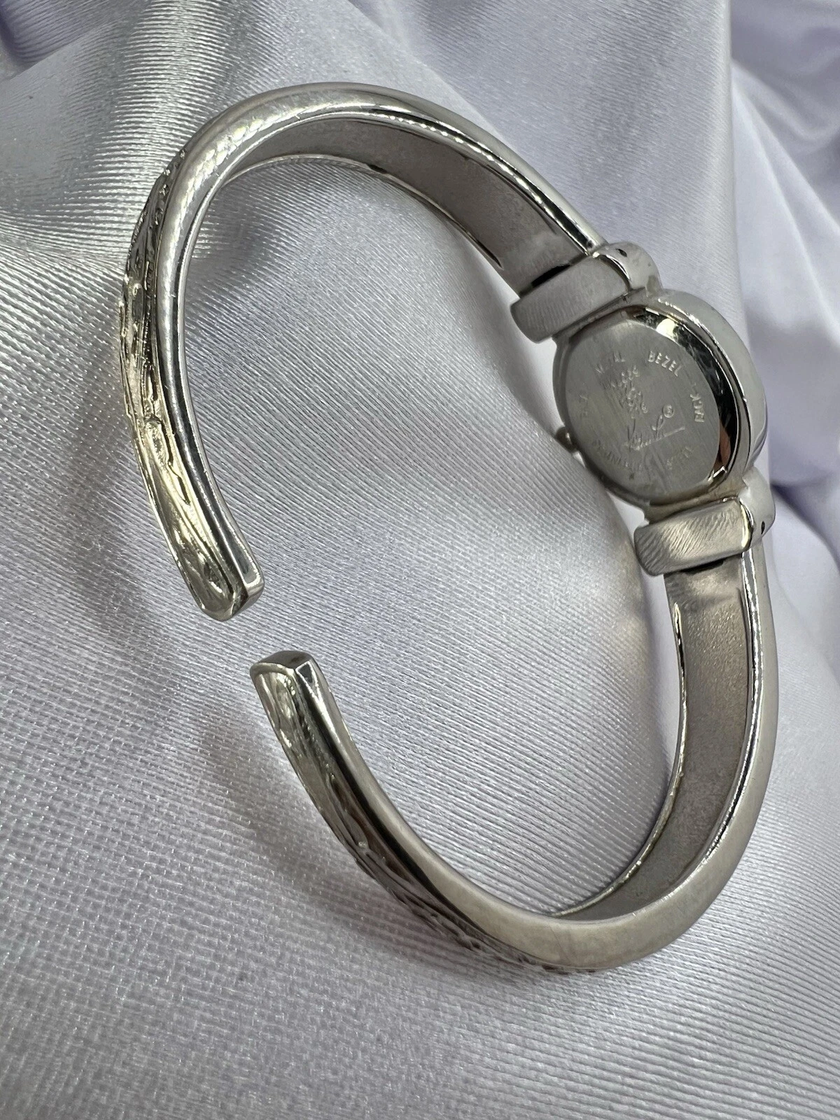 Kathie Lee Silver Cuff Bangle Womens Oval Watch Mother Of Pearl Dial Petite Goth