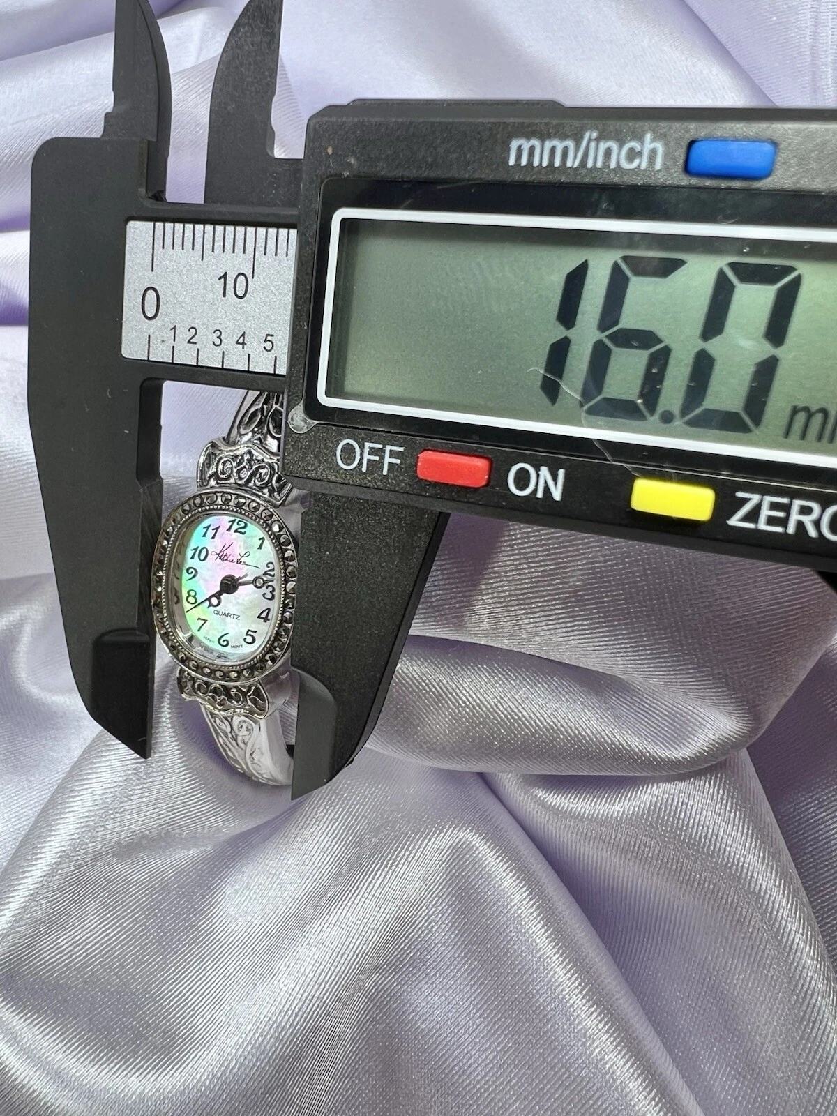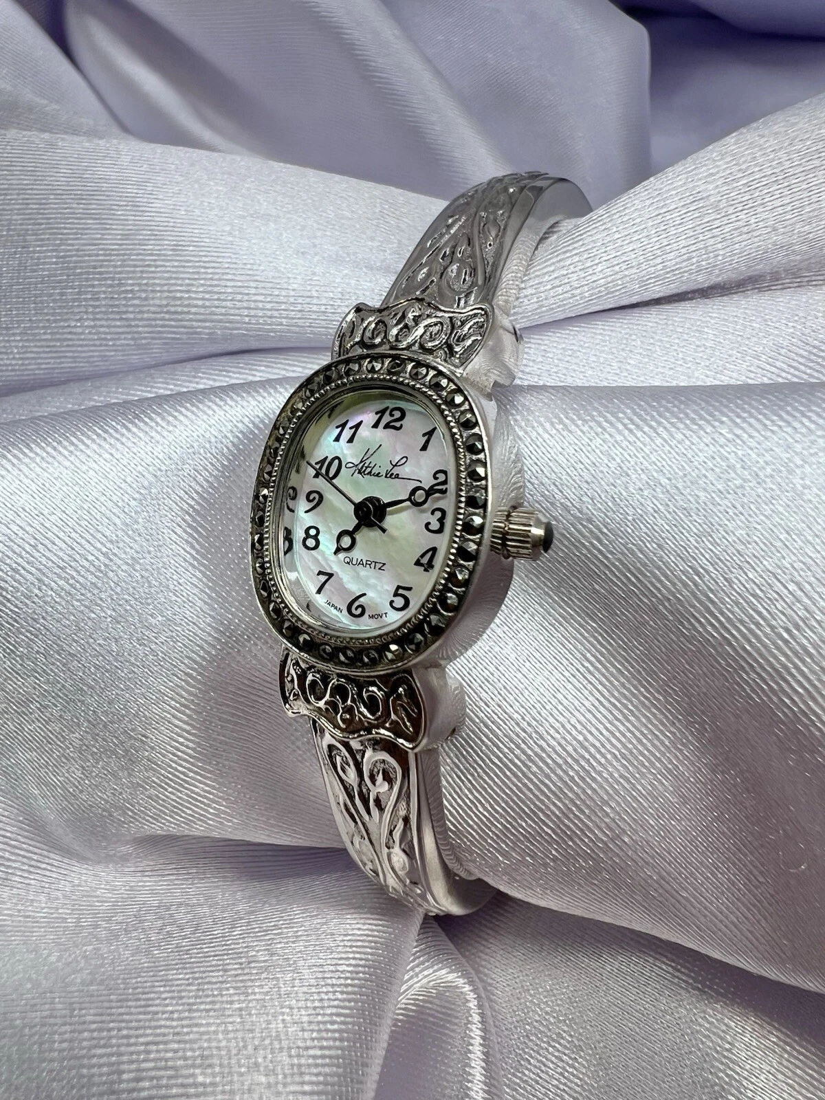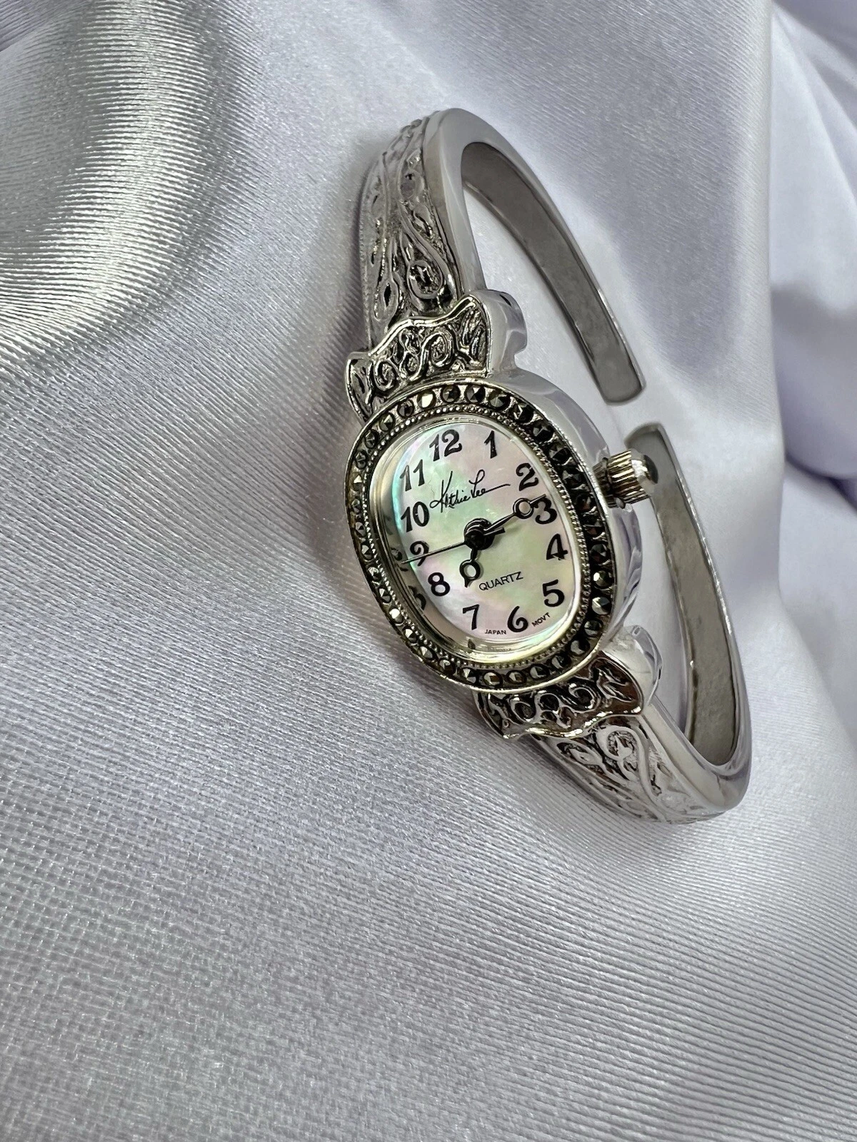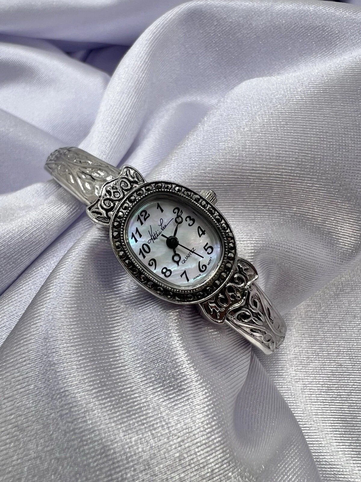 Kathie Lee Silver Cuff Bangle Womens Oval Watch Mother Of Pearl Dial Petite Goth