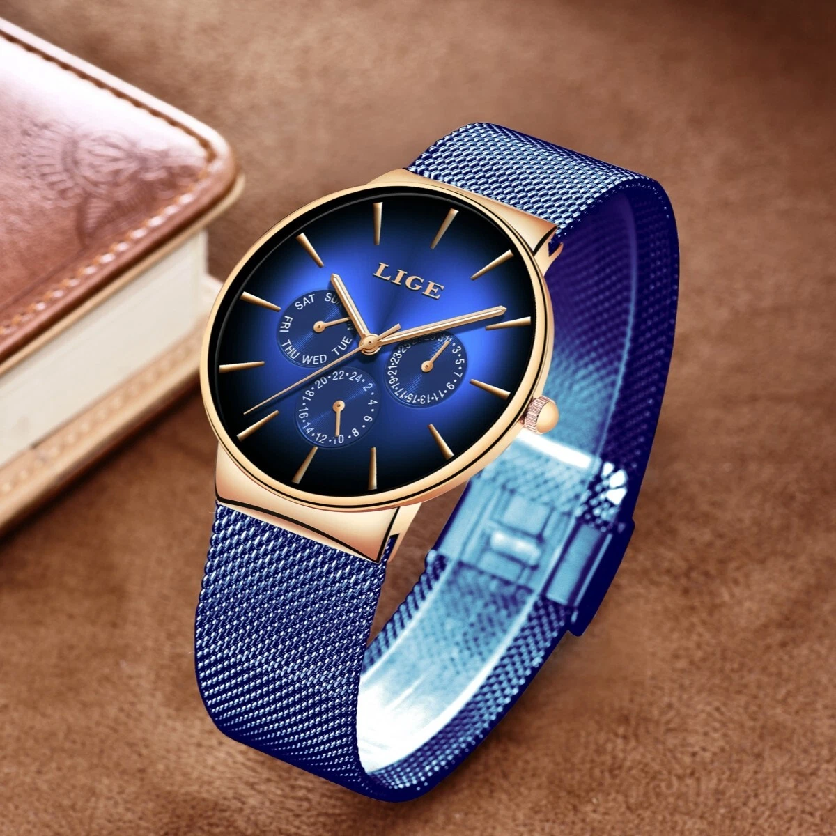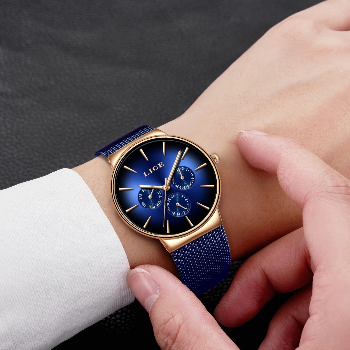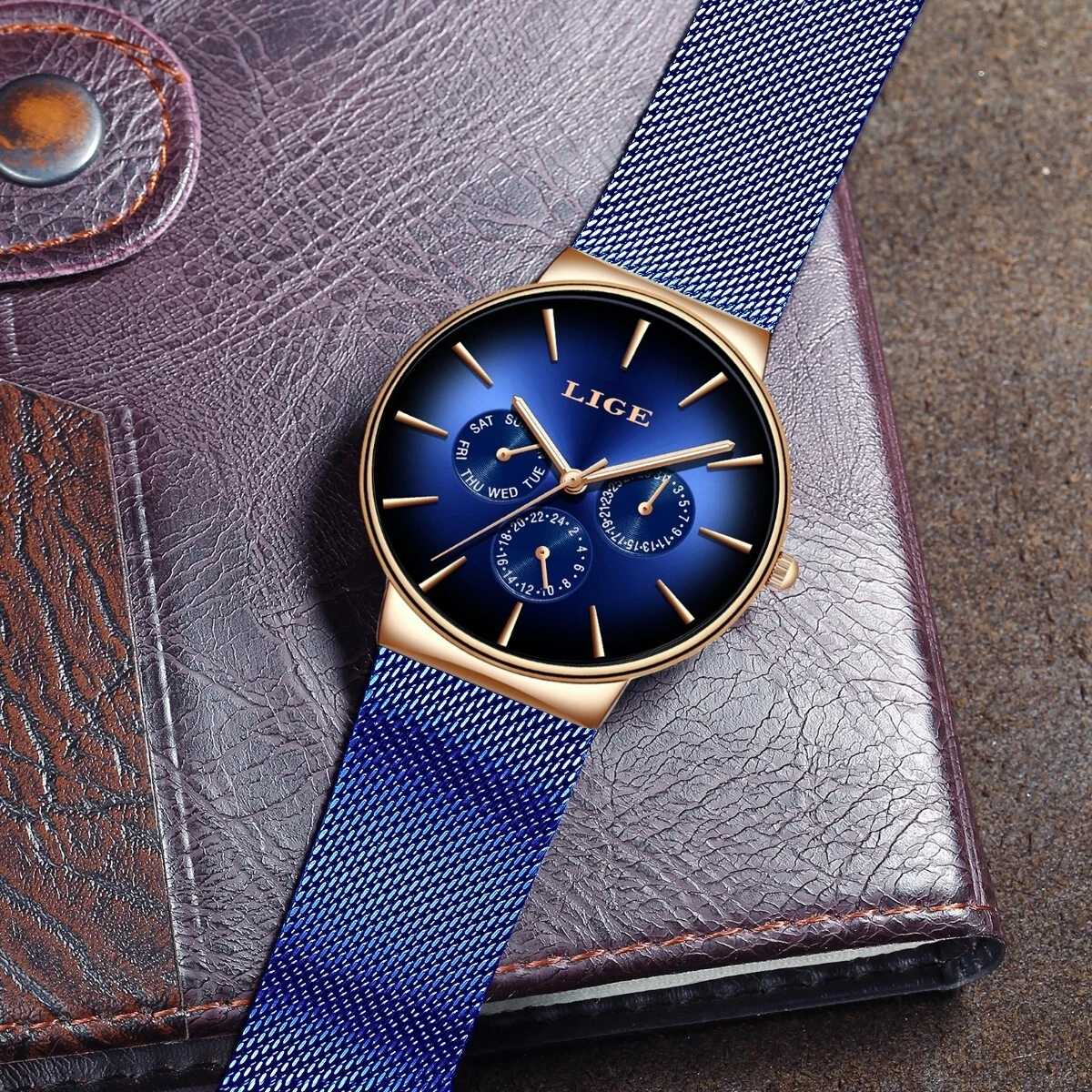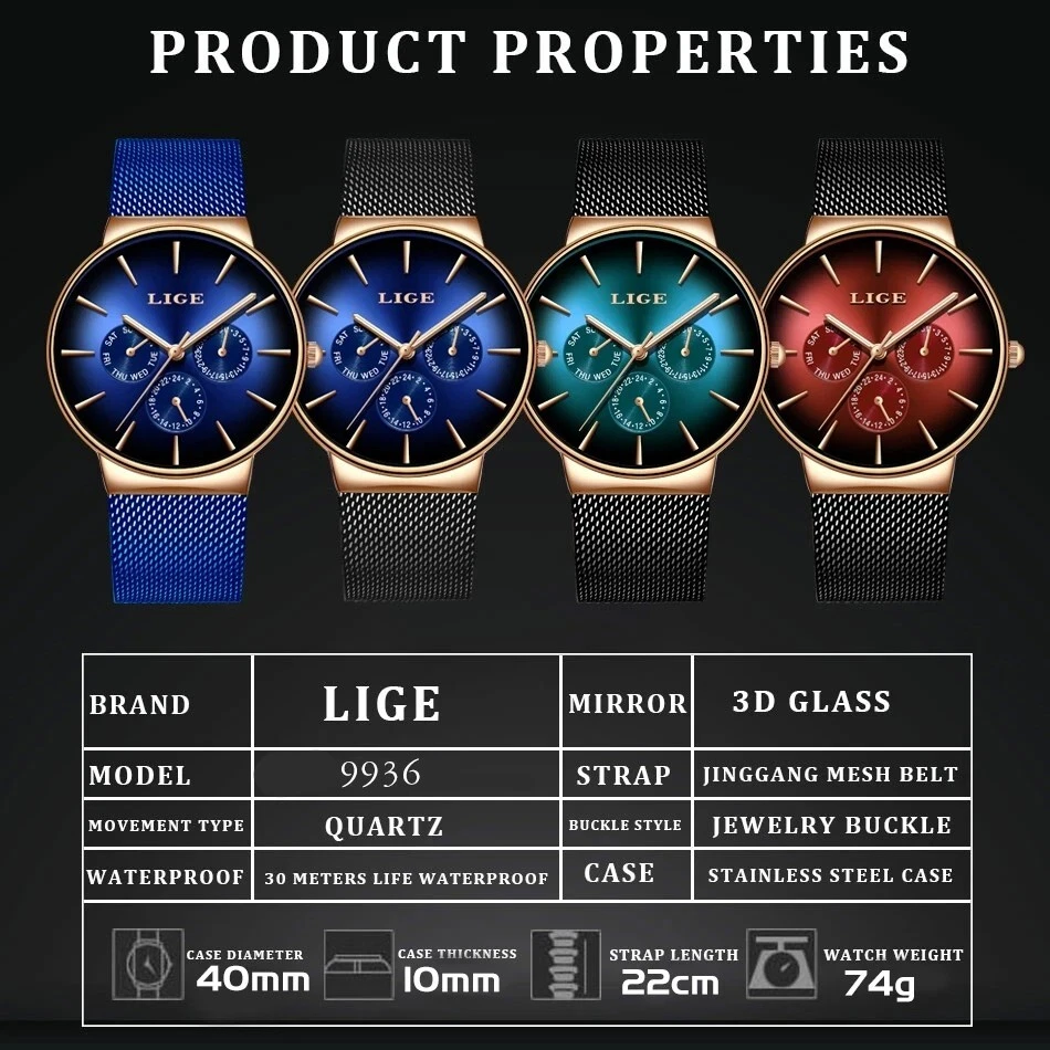 Men's Quartz Watch Ultra-thin Mesh Strap Date Week Waterproof Luxury Wristwatch