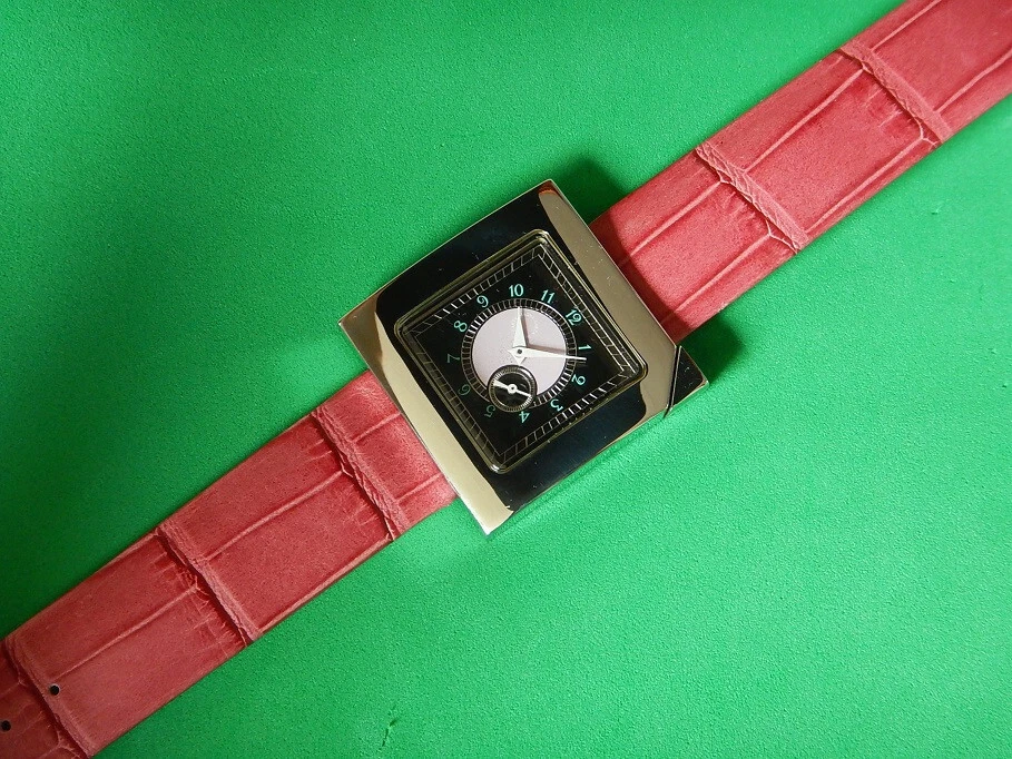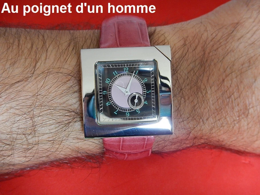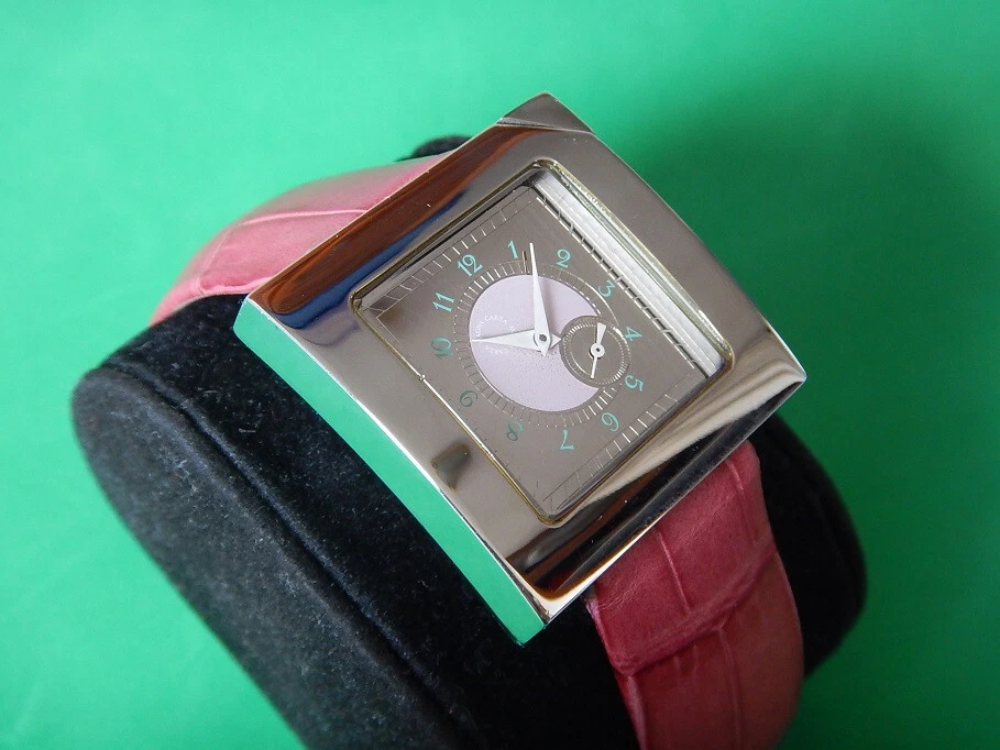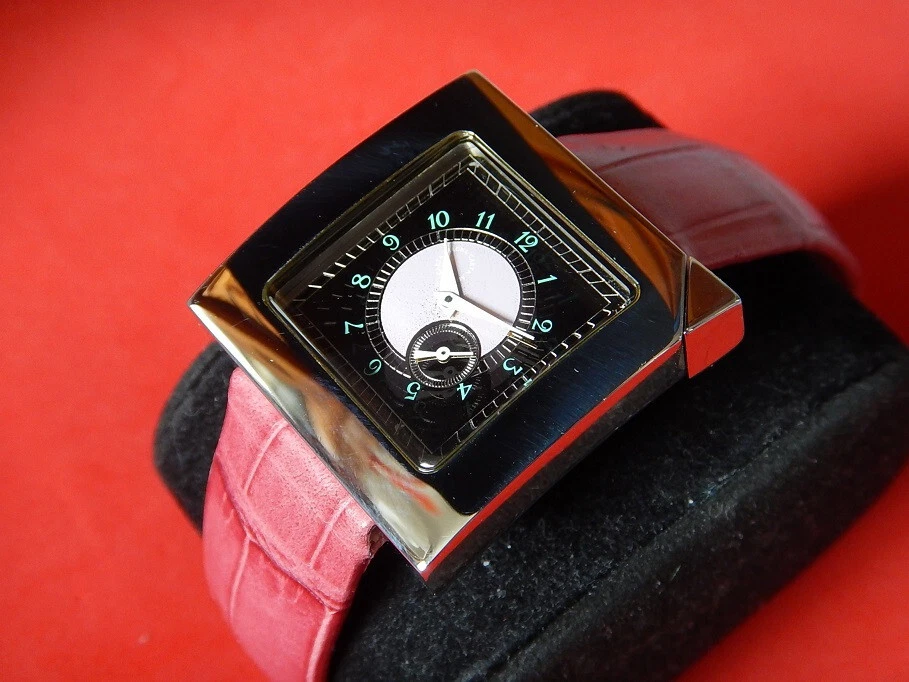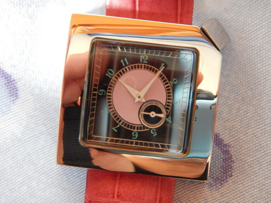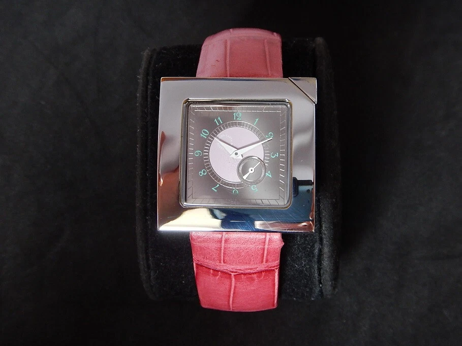 Original Square Mirror and Pink Watch with Integrated Crown in the Case