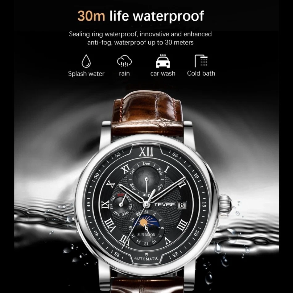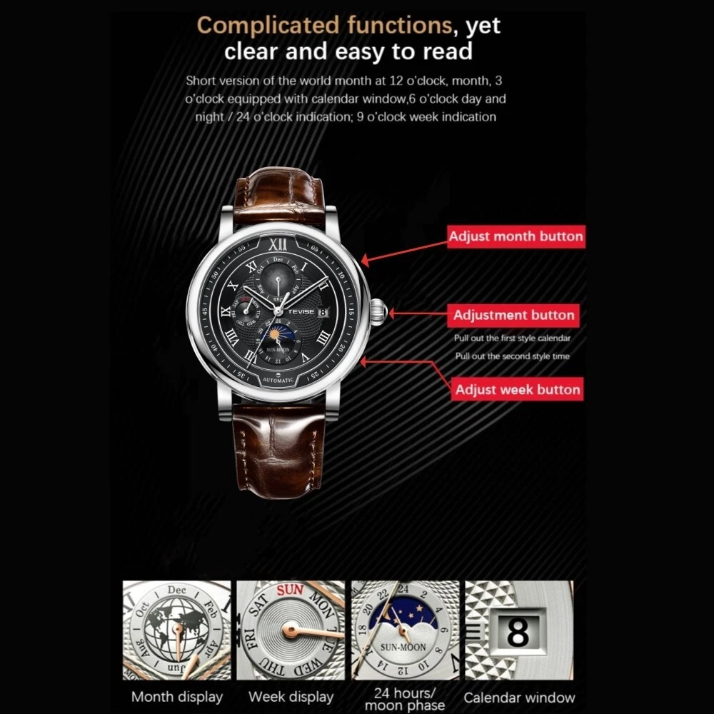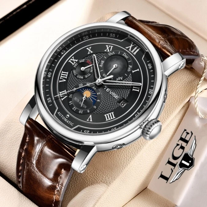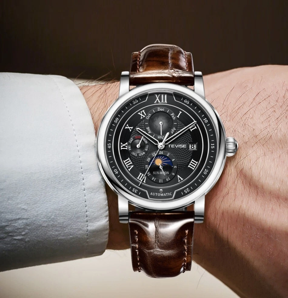 Men Watch Automatic Mechanical Date Month Week display Business Wristwatch Gift