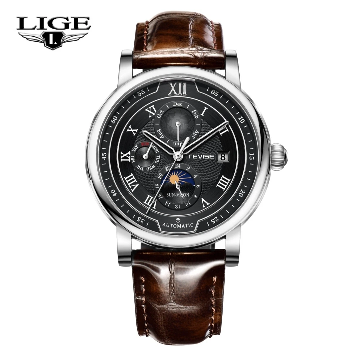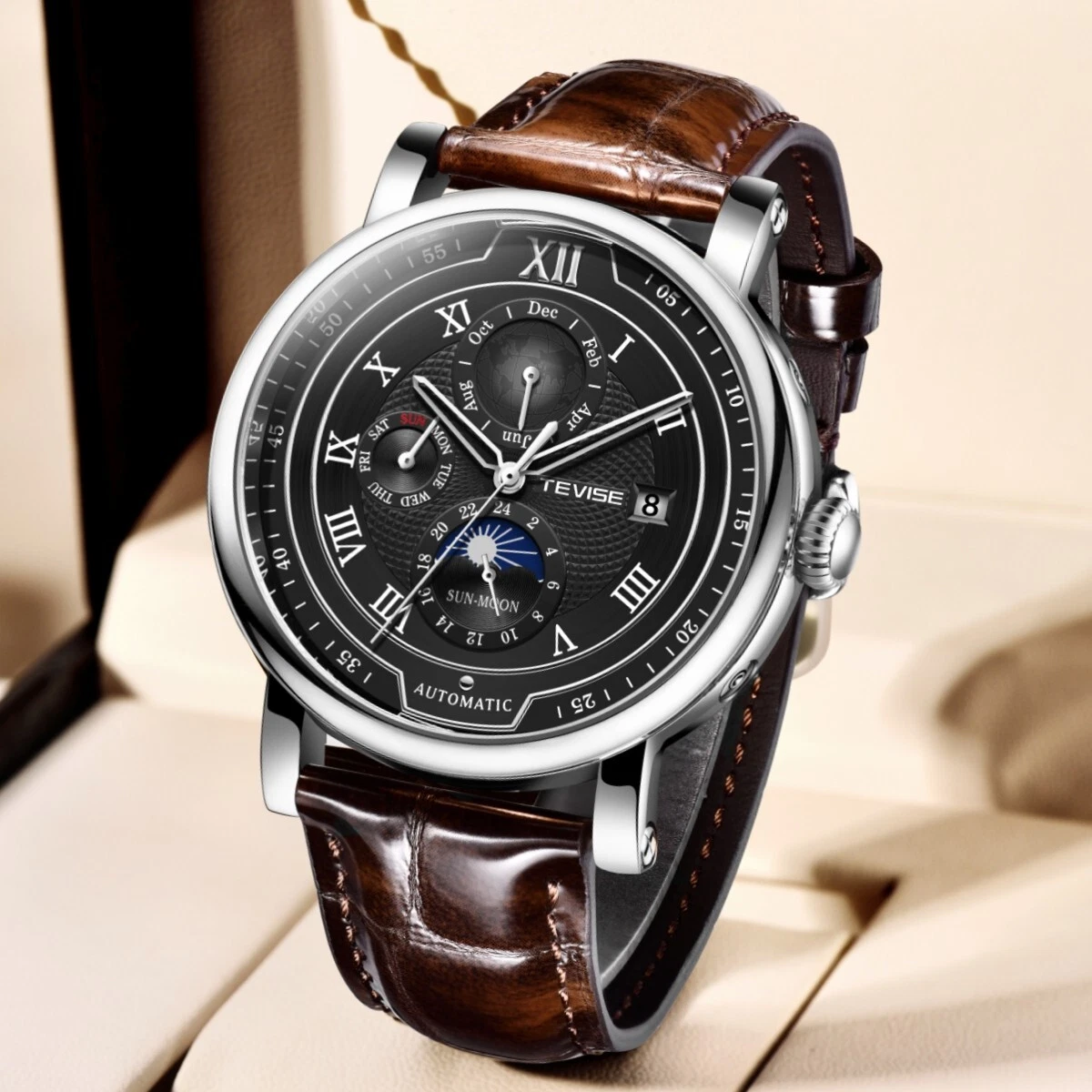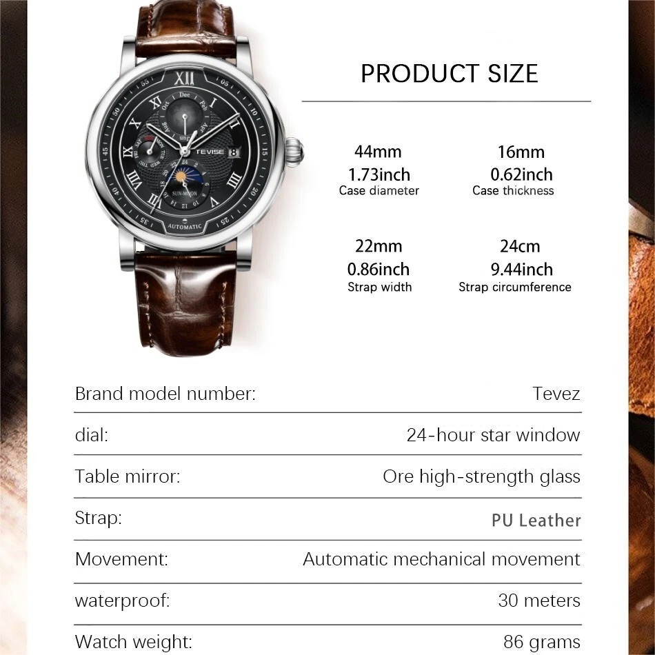 Men Watch Automatic Mechanical Date Month Week display Business Wristwatch Gift