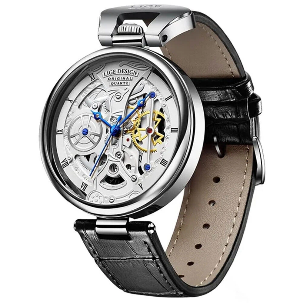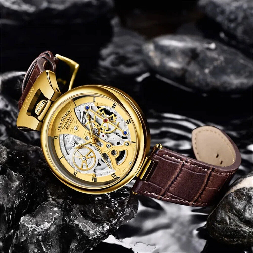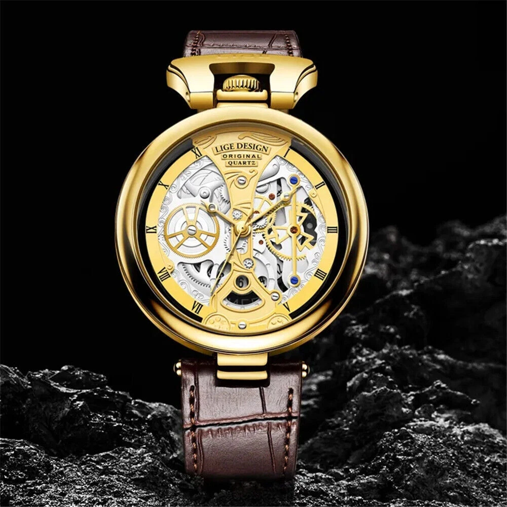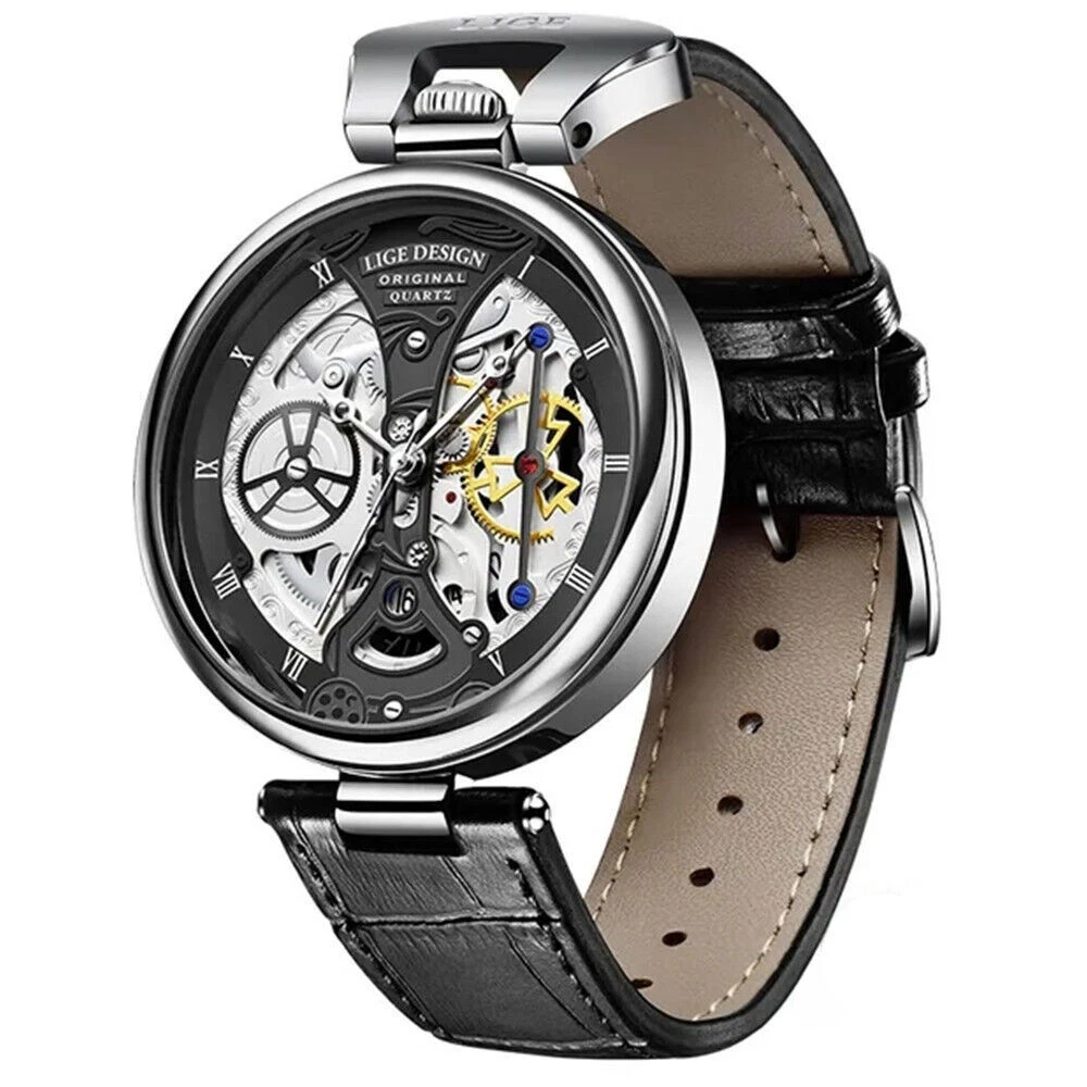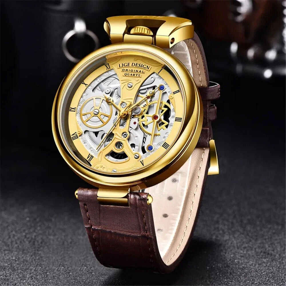 LIGE Men Quartz Watch Roman Numerals Hollow Dial Male Leather Strap Wristwatch
