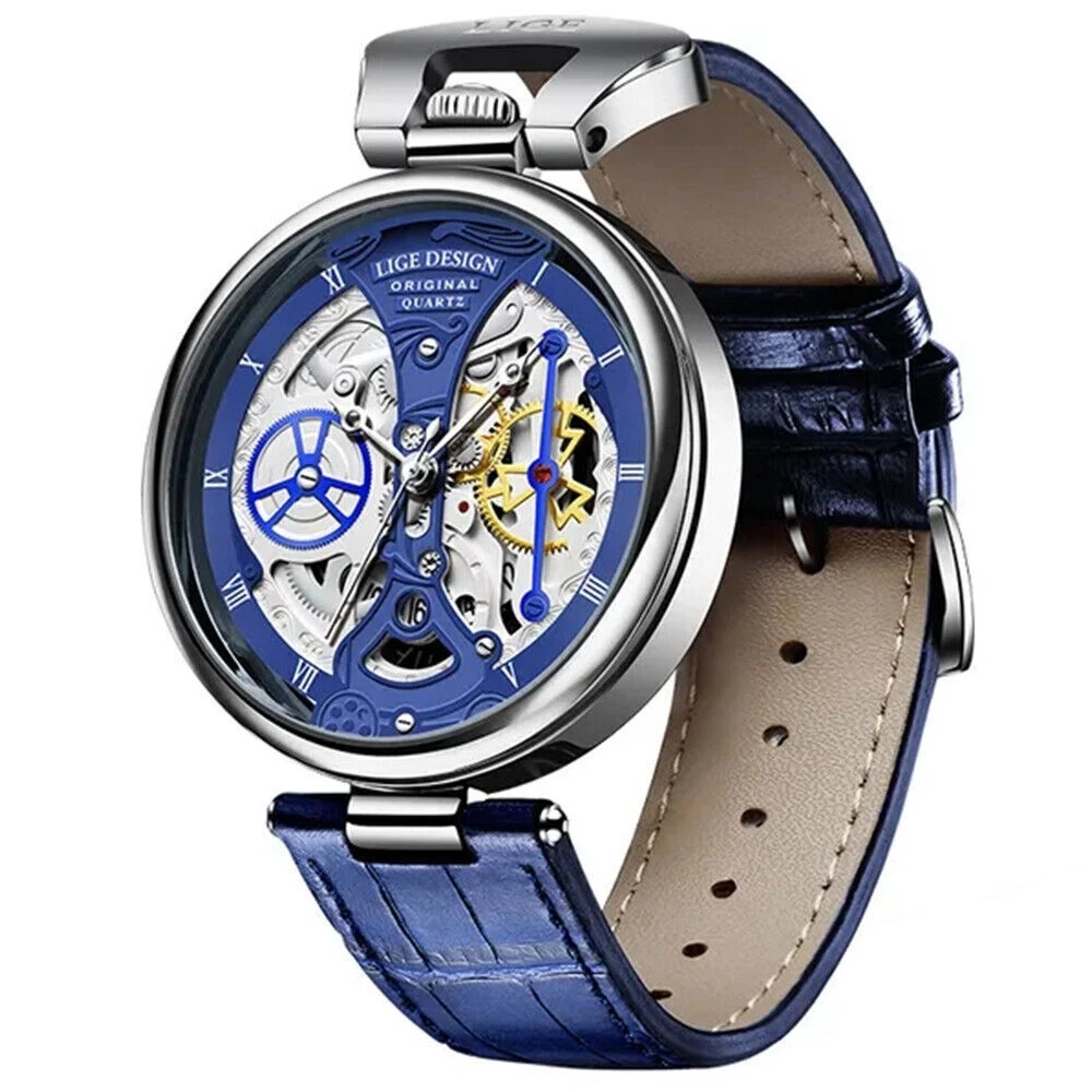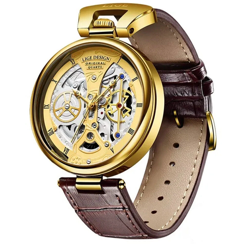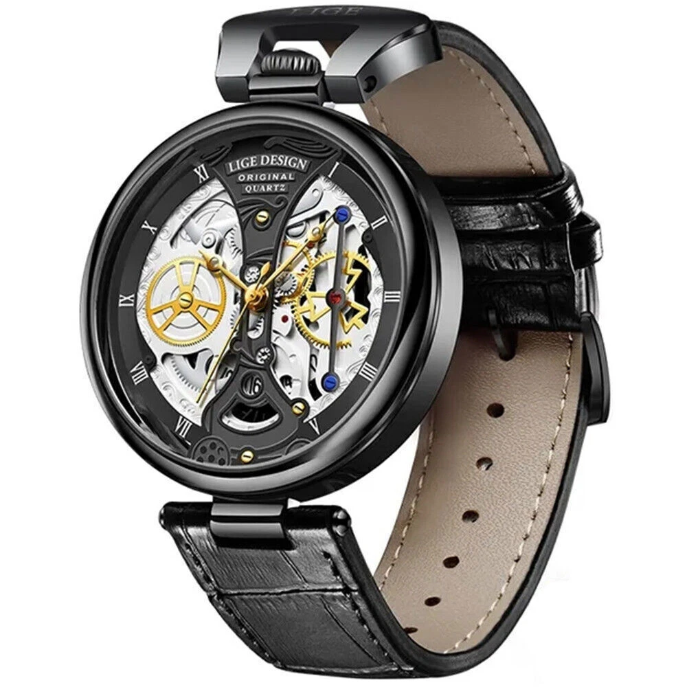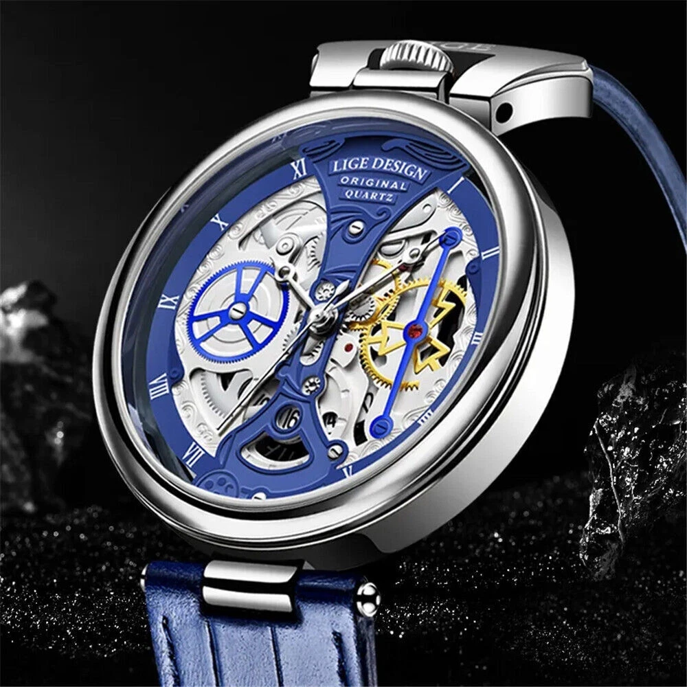 LIGE Men Quartz Watch Roman Numerals Hollow Dial Male Leather Strap Wristwatch