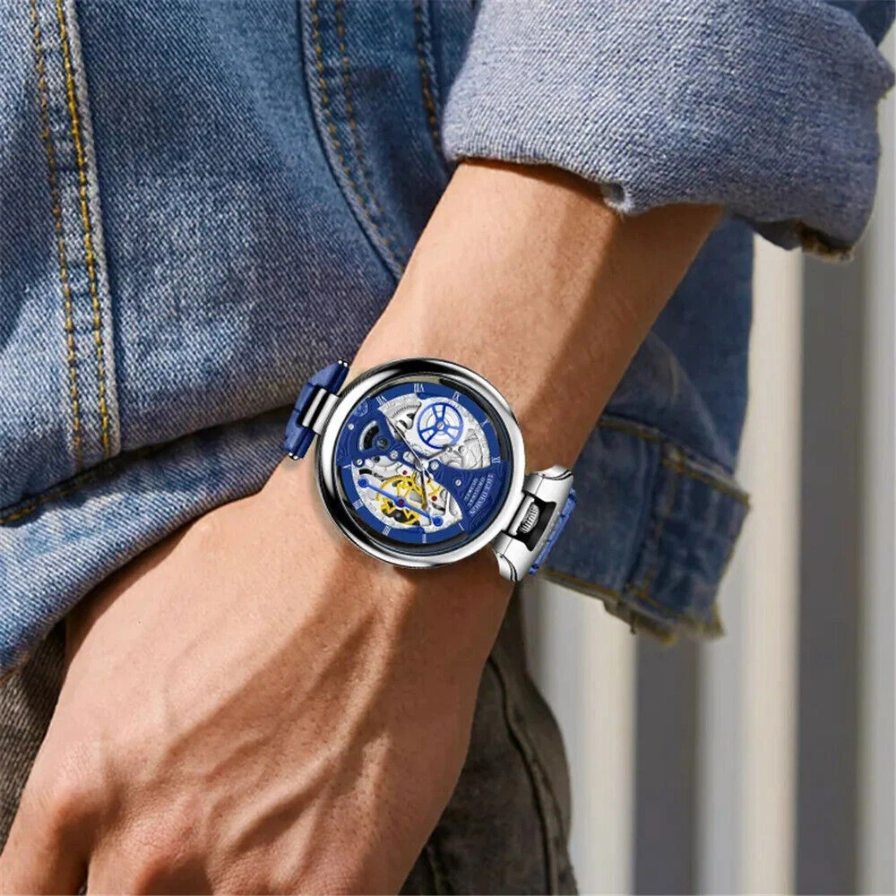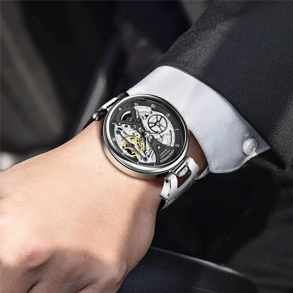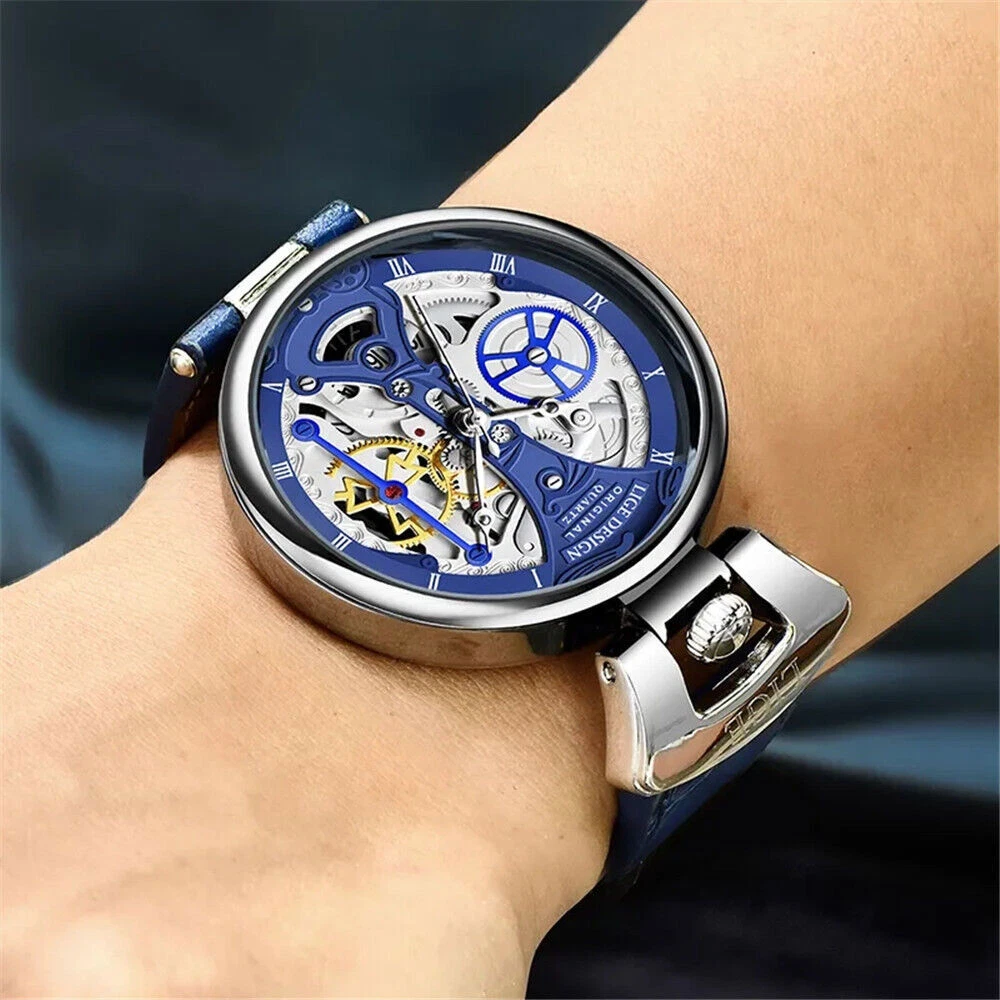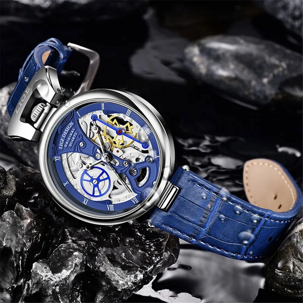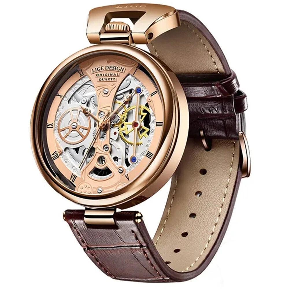 LIGE Men Quartz Watch Roman Numerals Hollow Dial Male Leather Strap Wristwatch