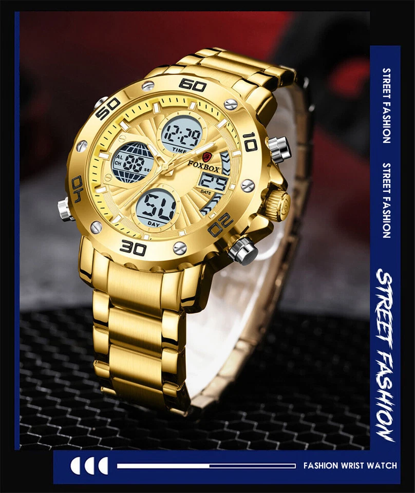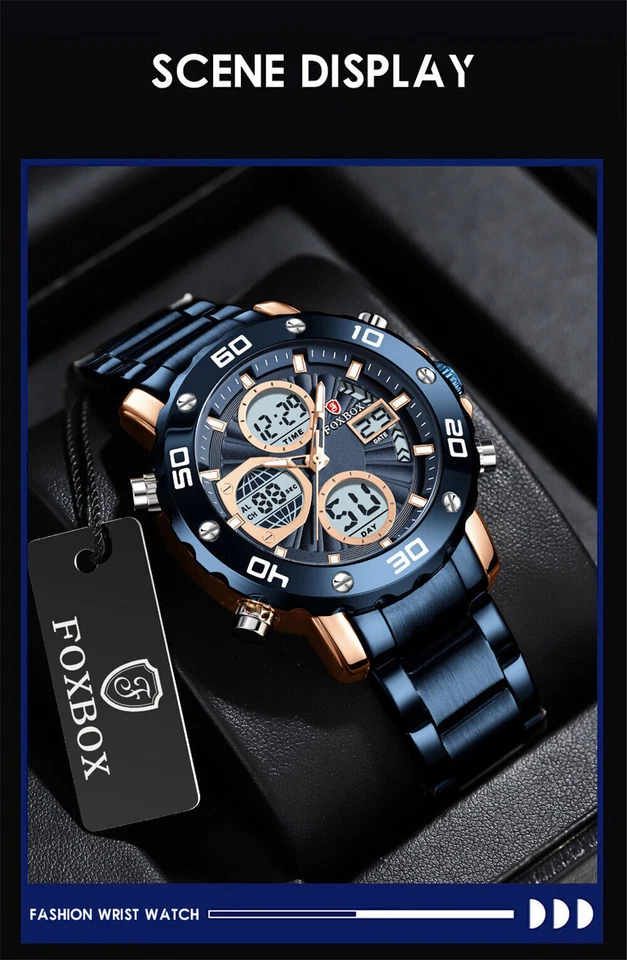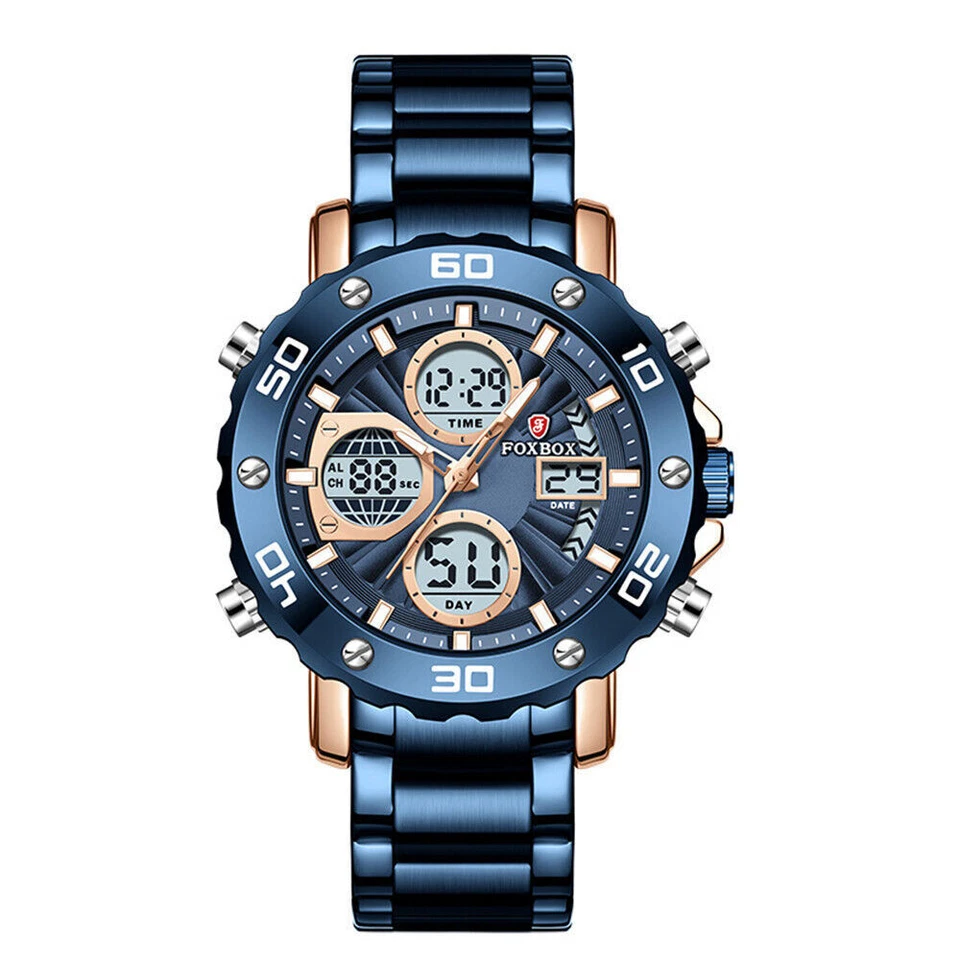 FOXBOX Men Blue Watches Top Brand Steel Wristwatch Military Digital Quartz Watch