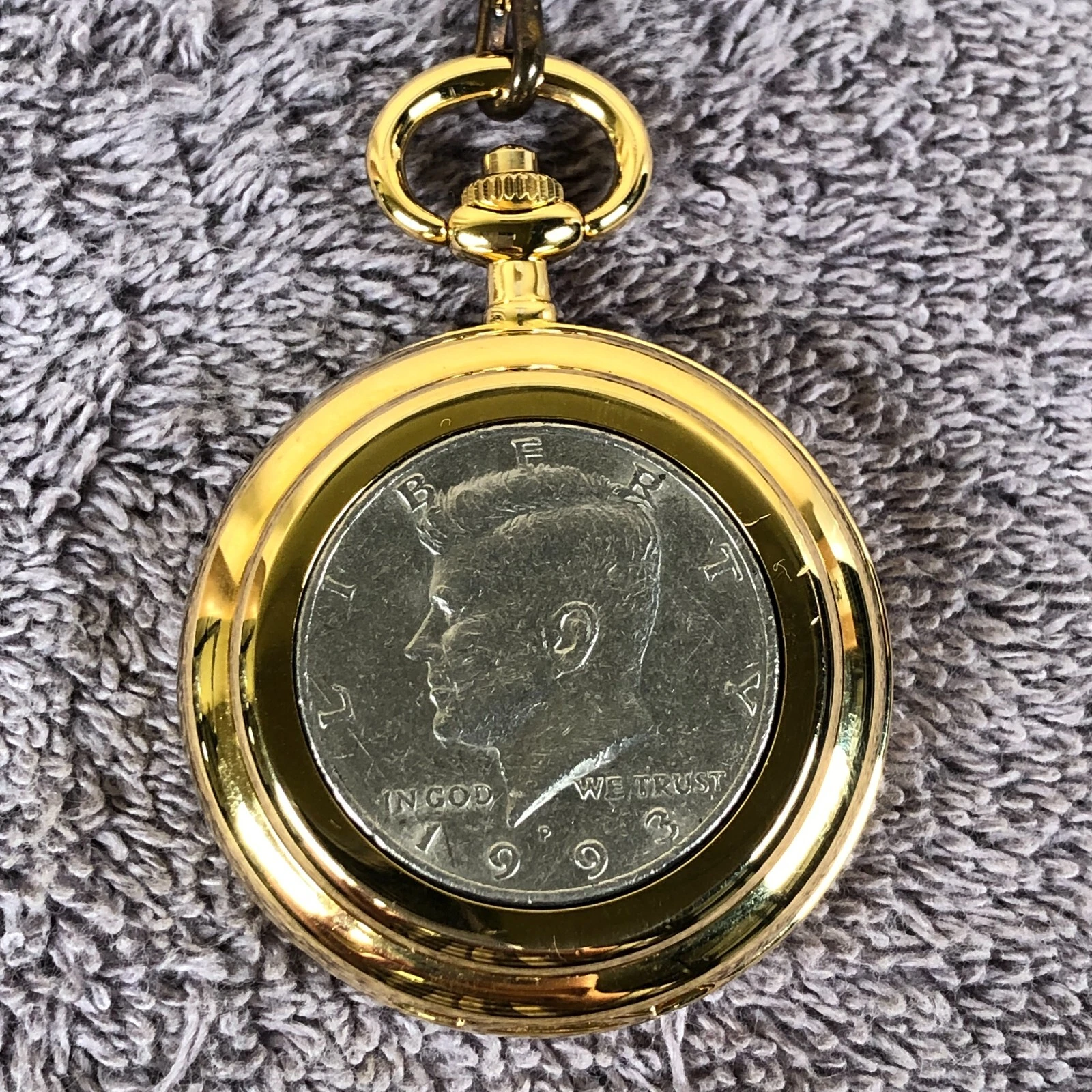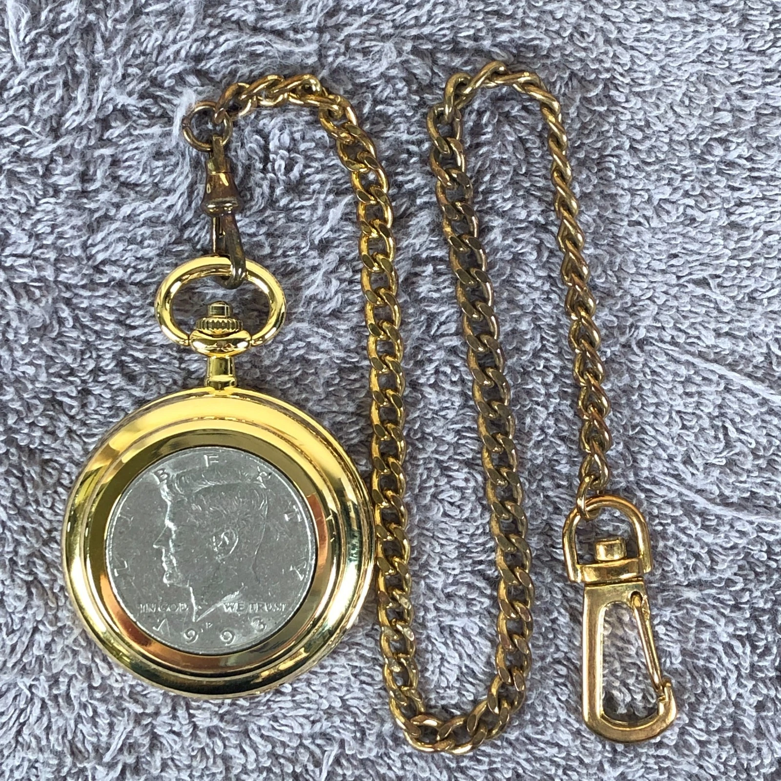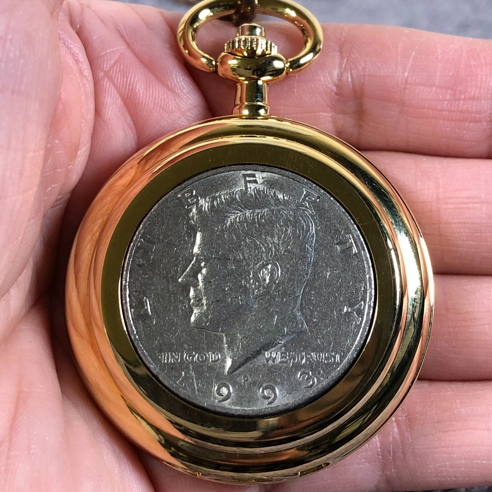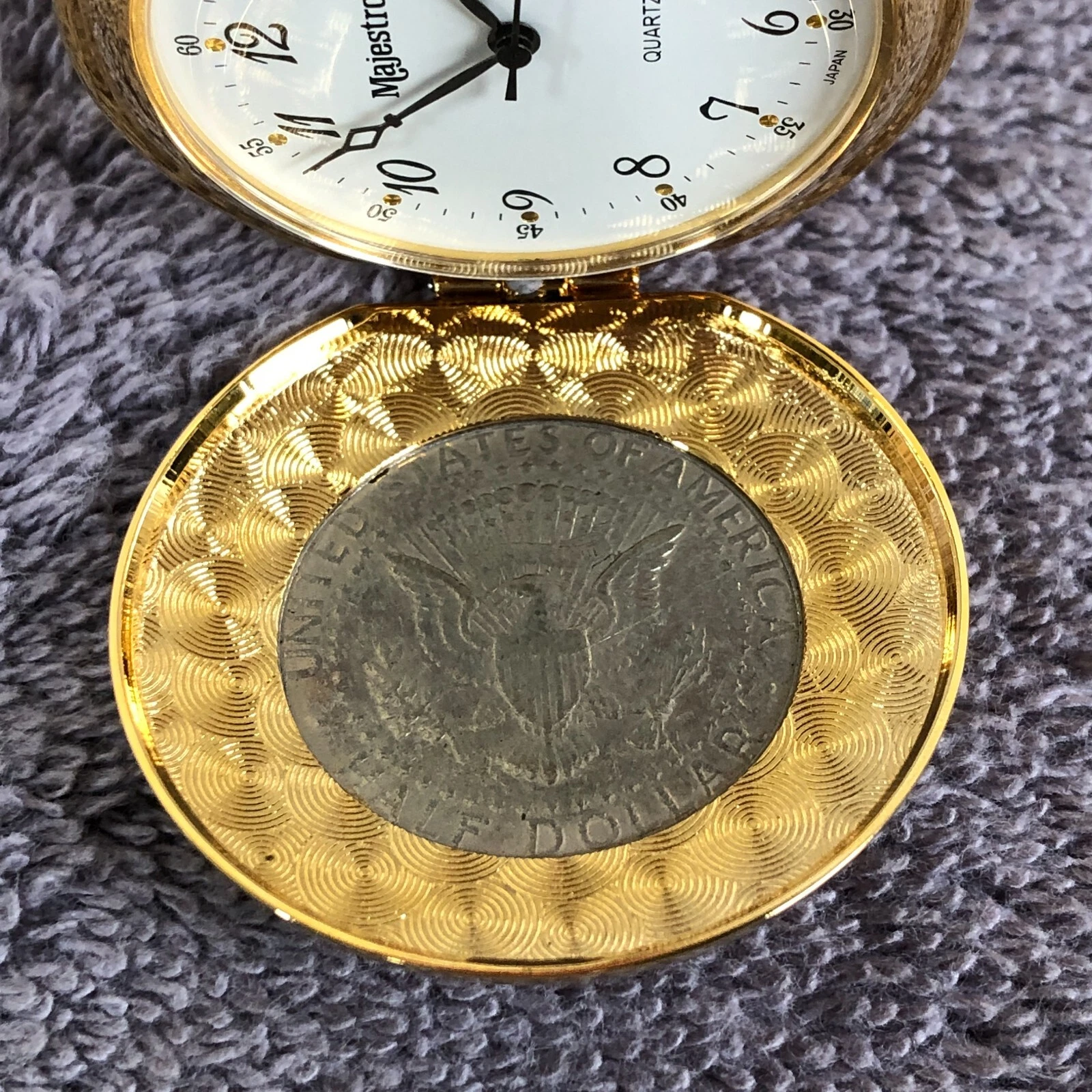 Majestron Gold Chain Tone Colibri Half Dollar JFK Flip Cover Quartz Pocket Watch