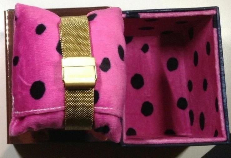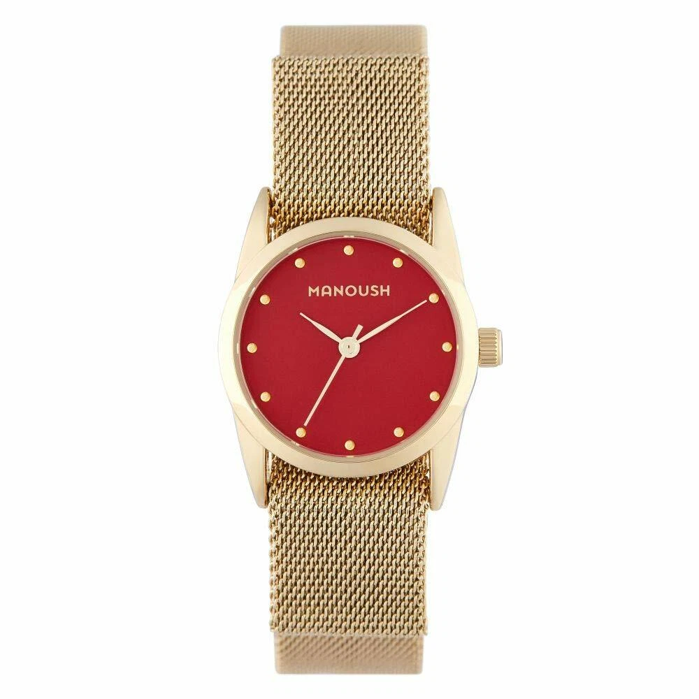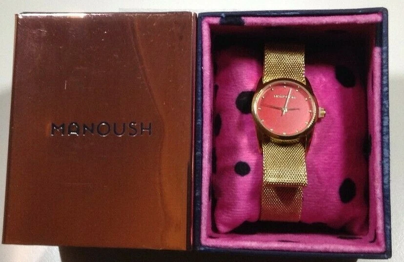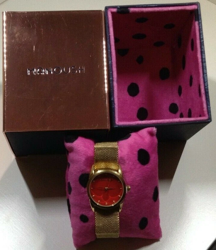 RARE DESIGNER Manoush Quartz Watch Red Dial Gold Mesh Bracelet MS1816
