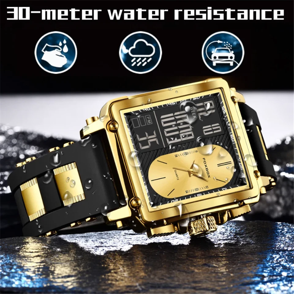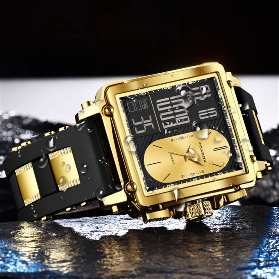 LIGE FOXBOX Men Dual Time Watch Male Rectangle Wristwatch Boys LED Quartz Watch