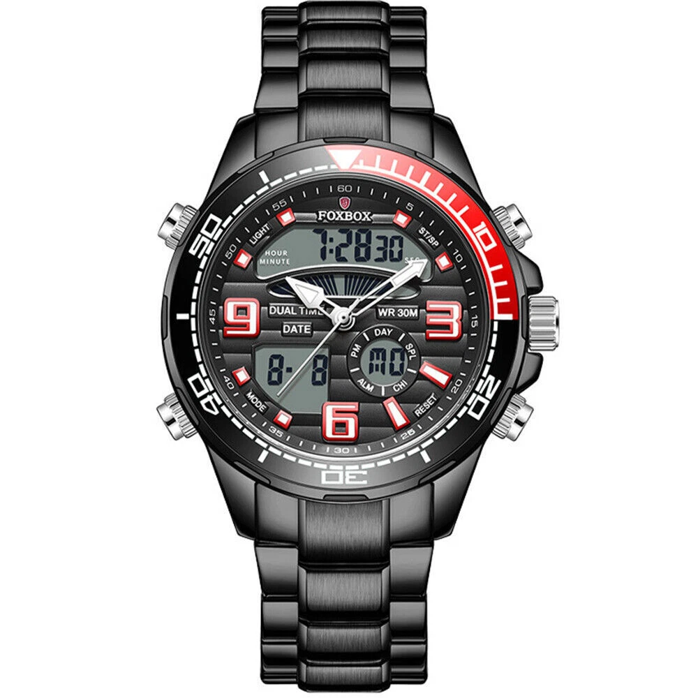 FOXBOX Men Watch Brand Quartz Silver Wristwatch Shockproof Digital Alarm Watch