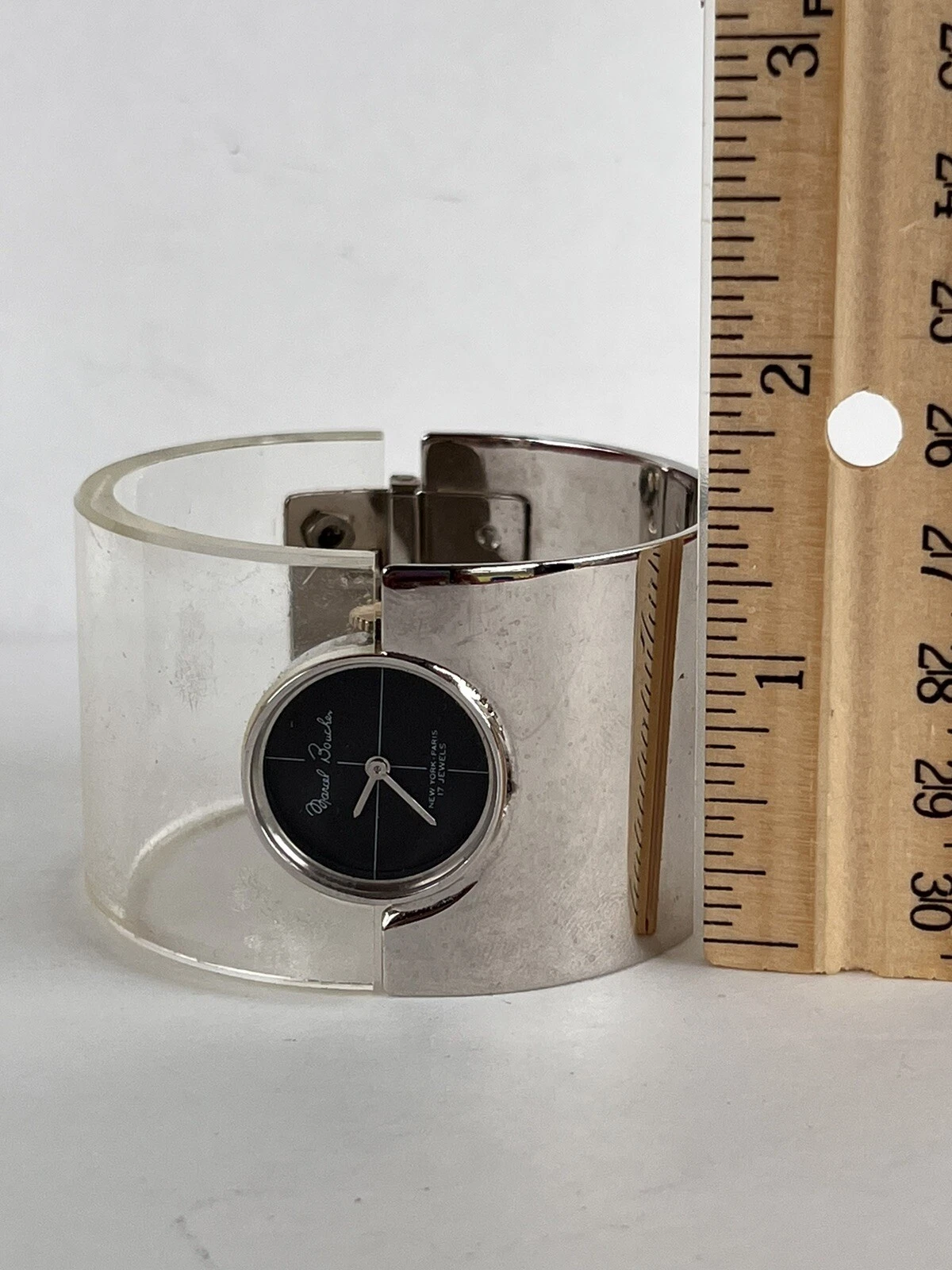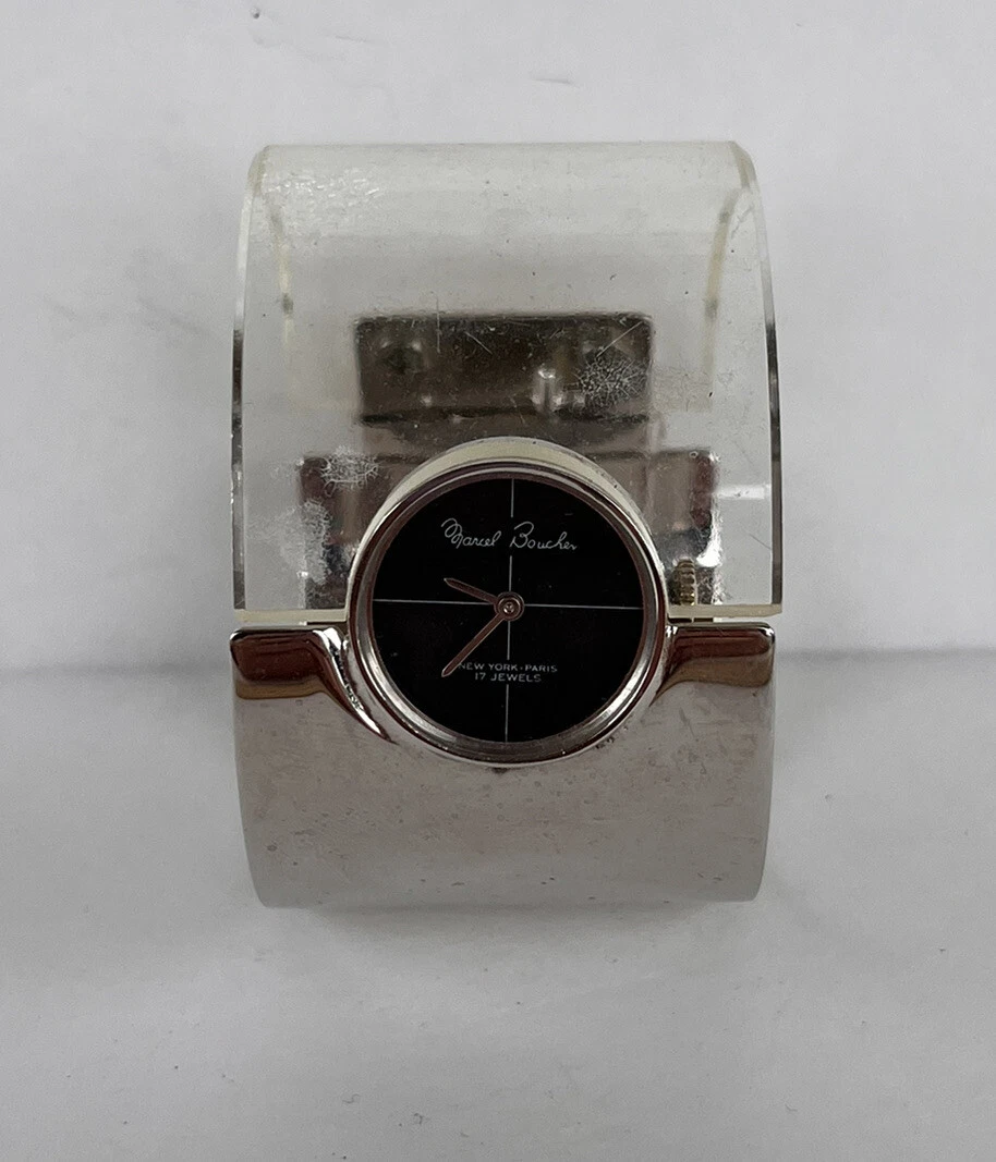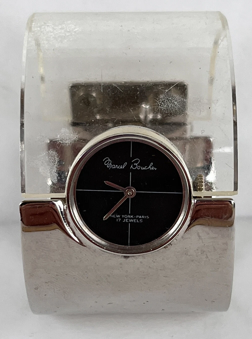 AS IS - MARCEL BOUCHER  Silver & Clear Lucite Cuff Watch Iconic 70s Fashion