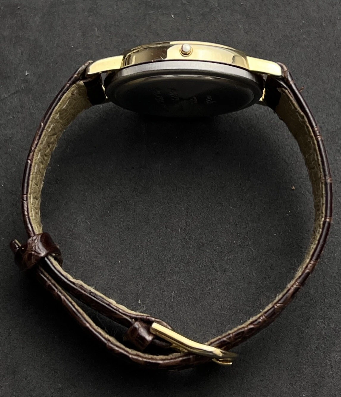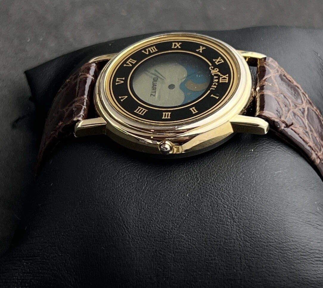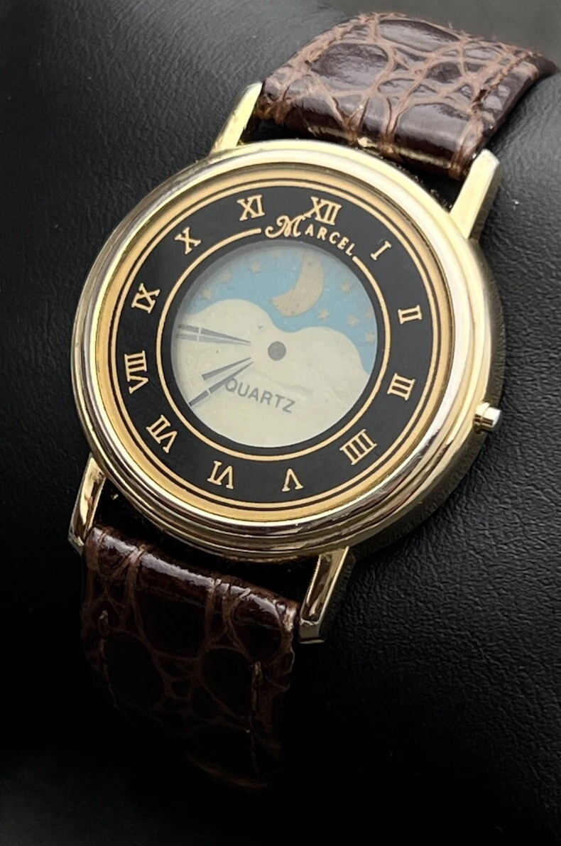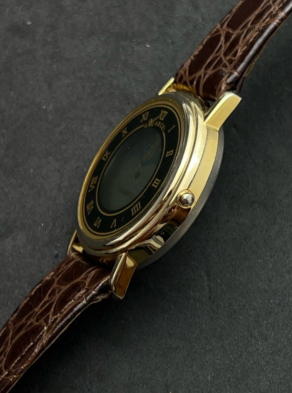 Vintage New MARCEL Digital Hands Men’s 36mm Quartz Watch Gold Case Brown Leather