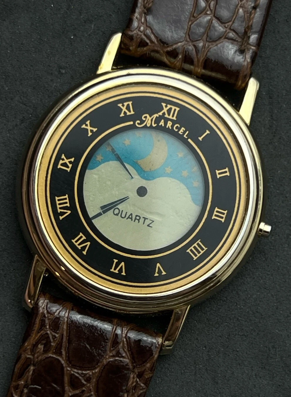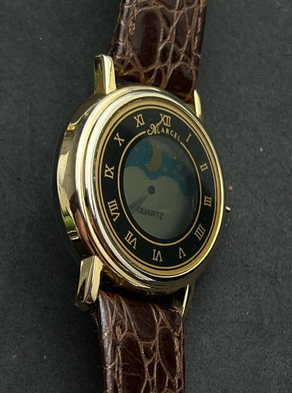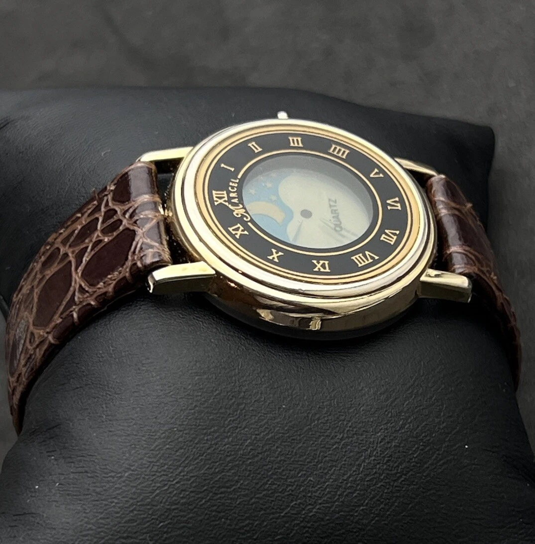 Vintage New MARCEL Digital Hands Men’s 36mm Quartz Watch Gold Case Brown Leather