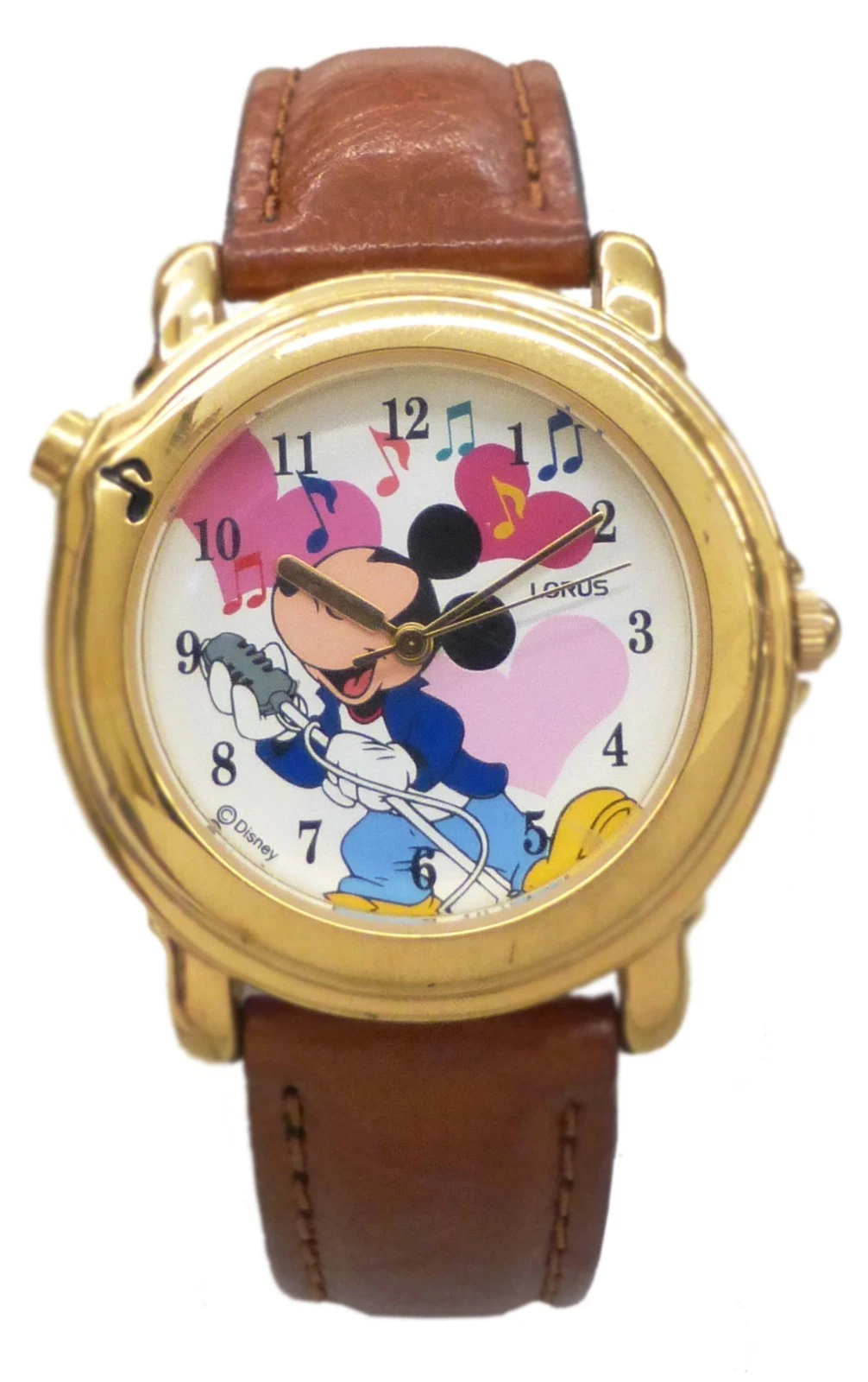 Lorus Musical Disney Mickey Mouse Watch With Gold Color Case& Brown Leather Band
