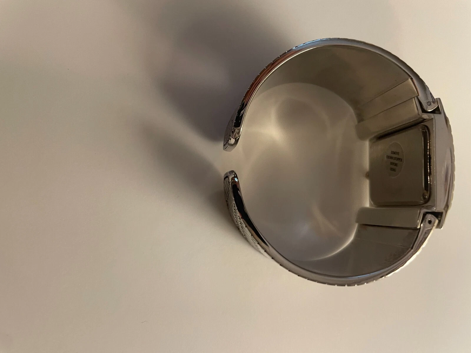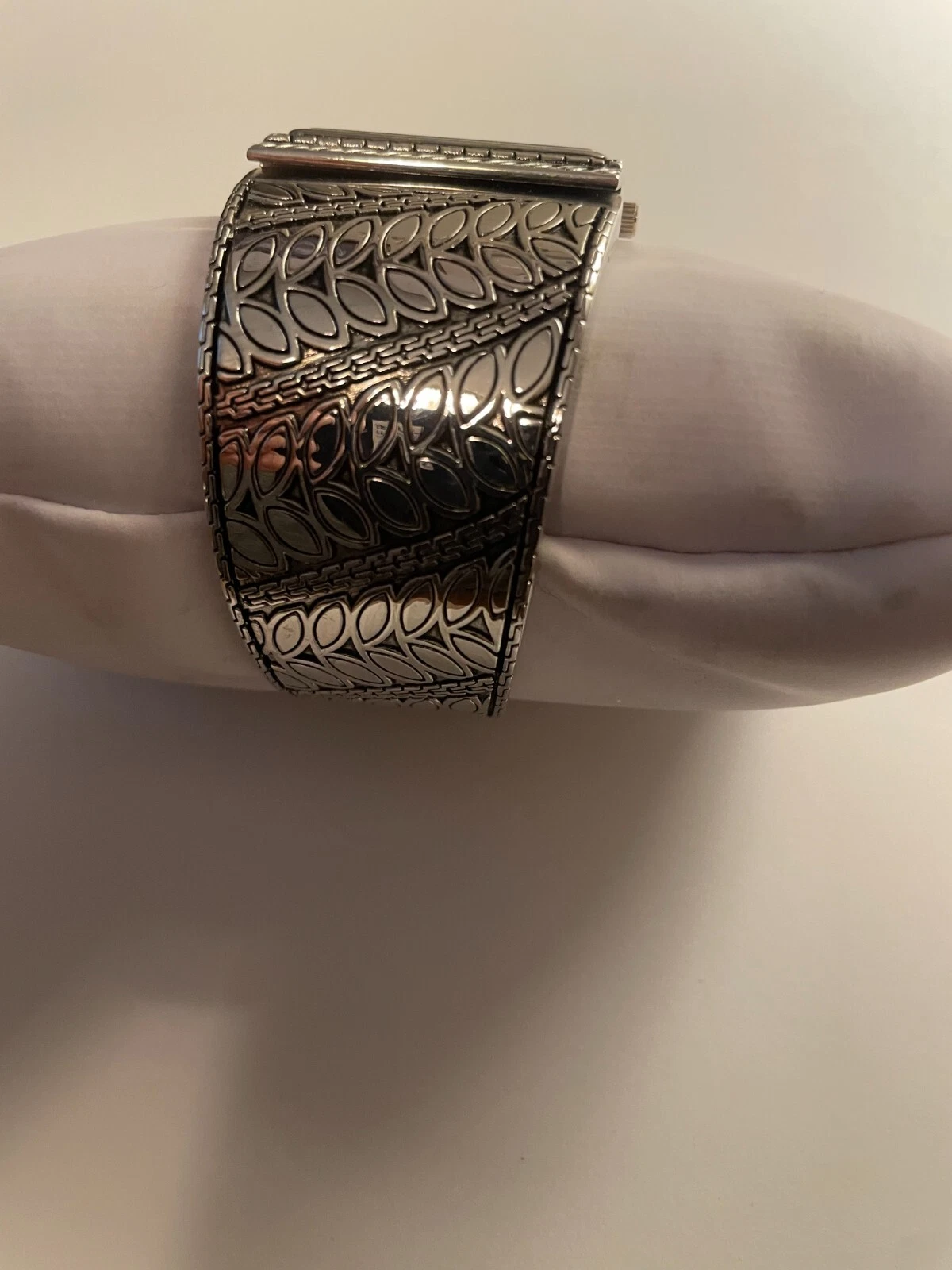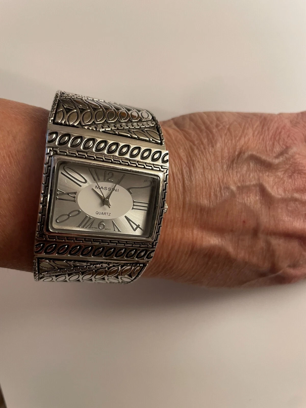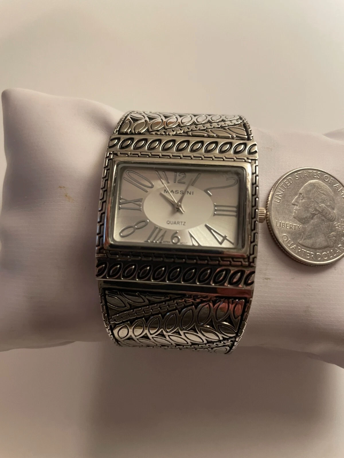 Massini Silvertone Wide Cuff Watch Pretty Design Fit 7"-7-3/4" Wrist Preowned