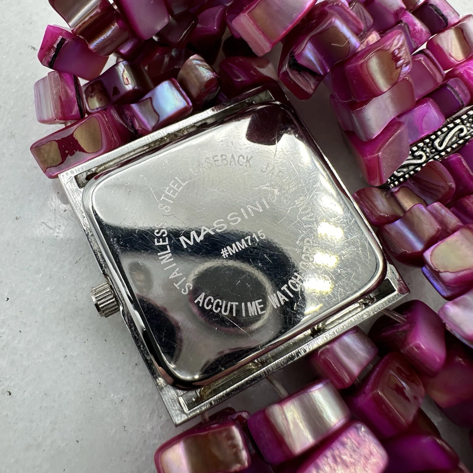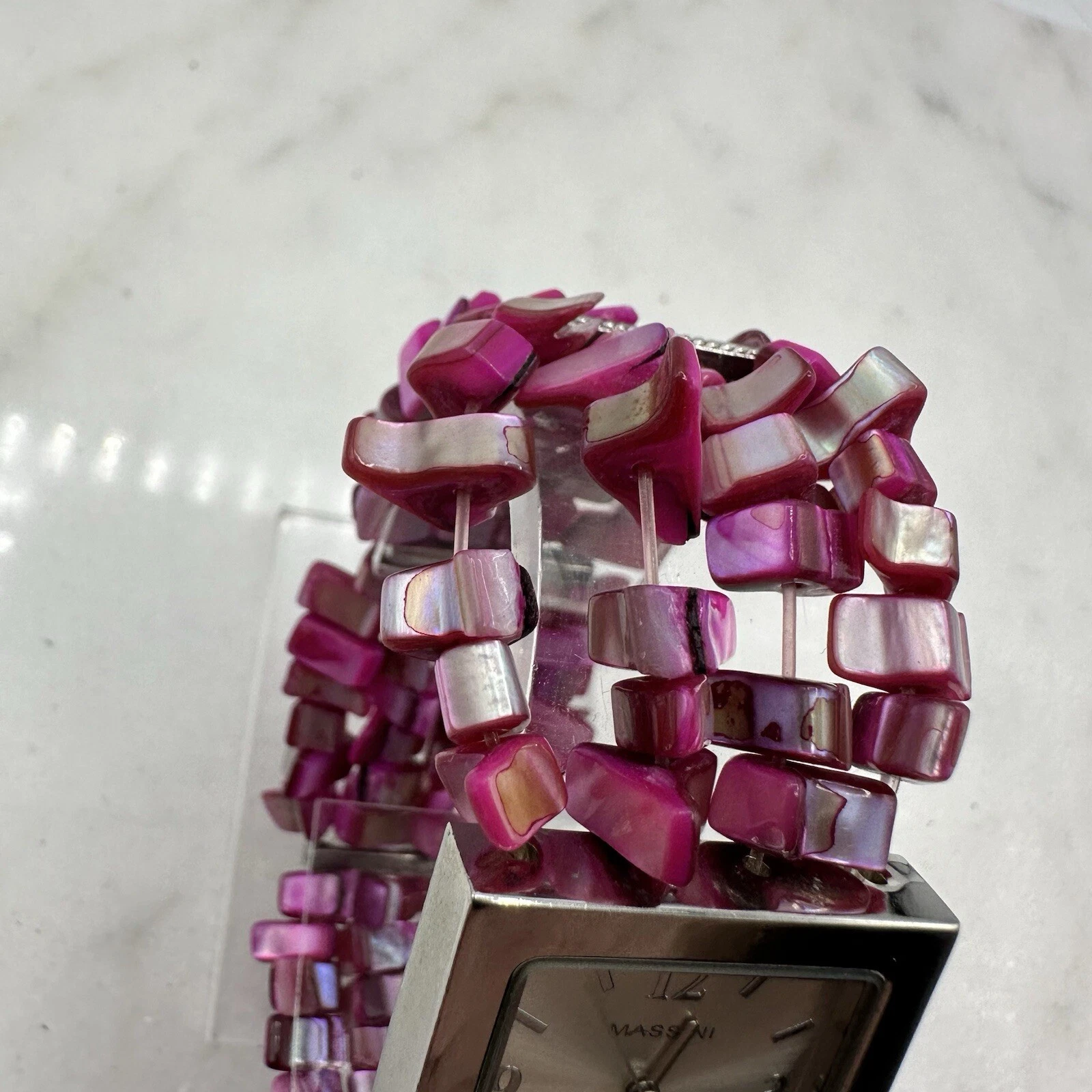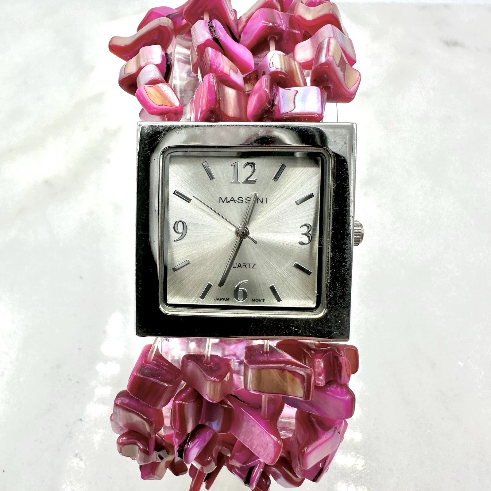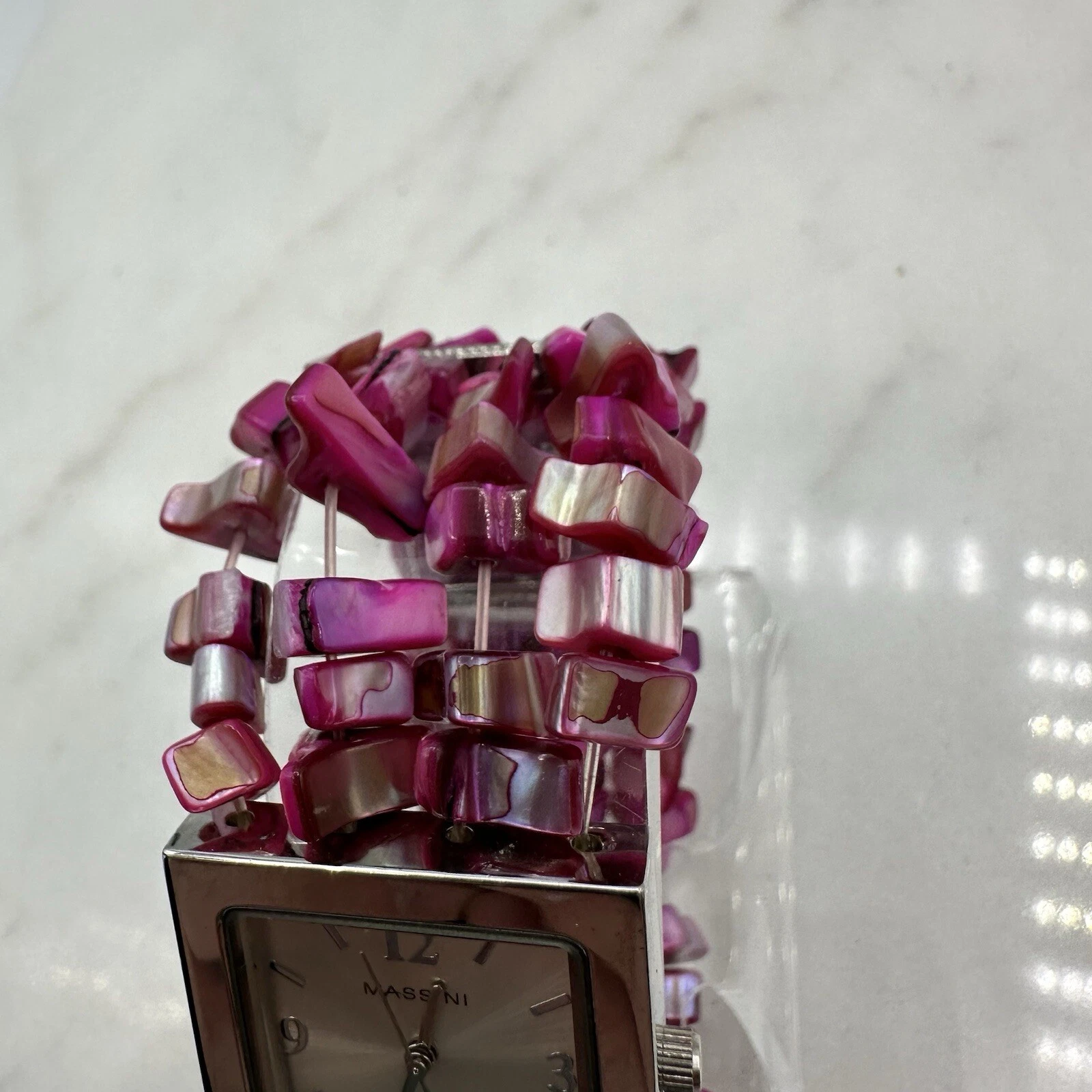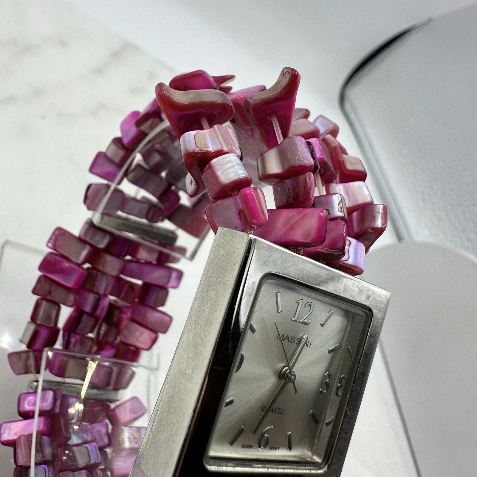 Massini Pink Stranded Bead Women’s 28mm Watch, Silver Tone, New Battery, Sz 7”