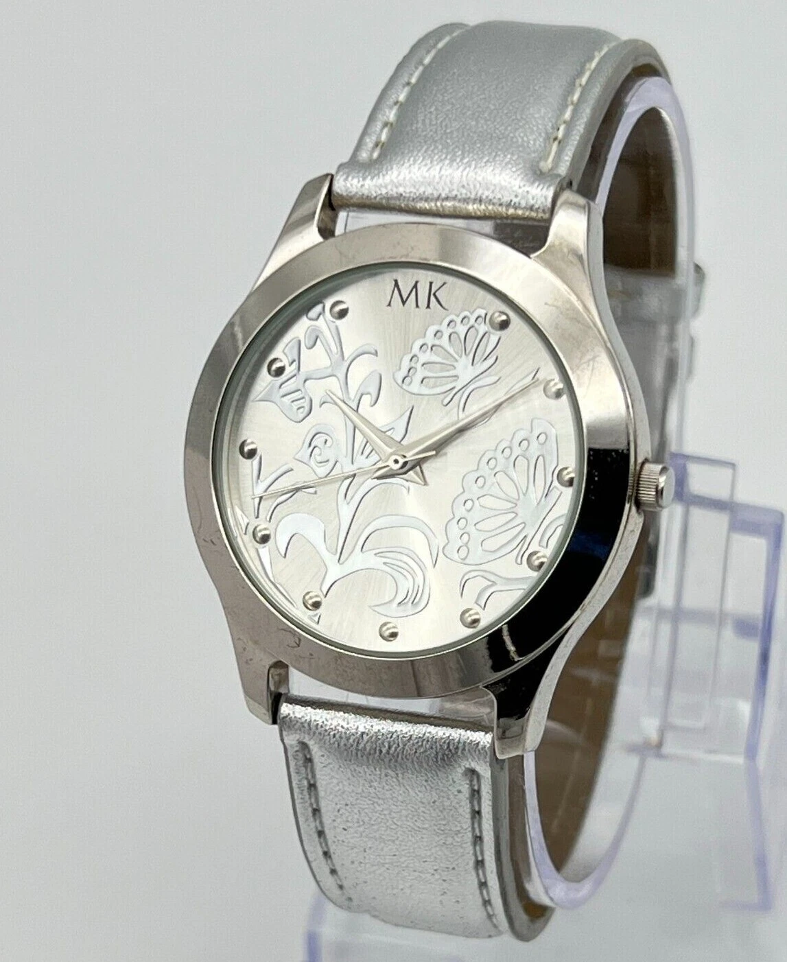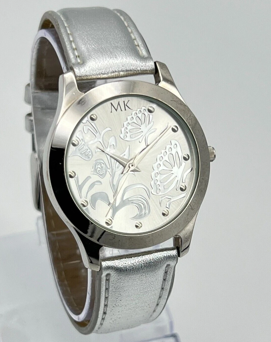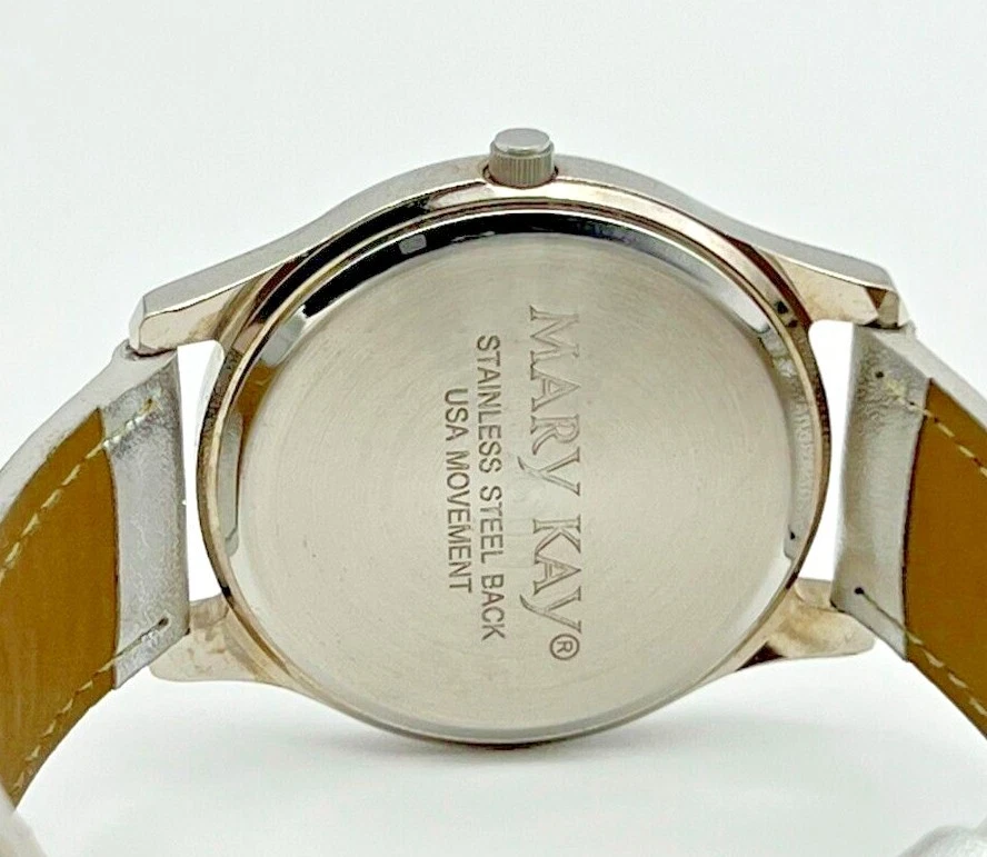 Women's MARY KAY Silver Tone Floral/Butterfly Dial Watch, Leather Band, 36mm