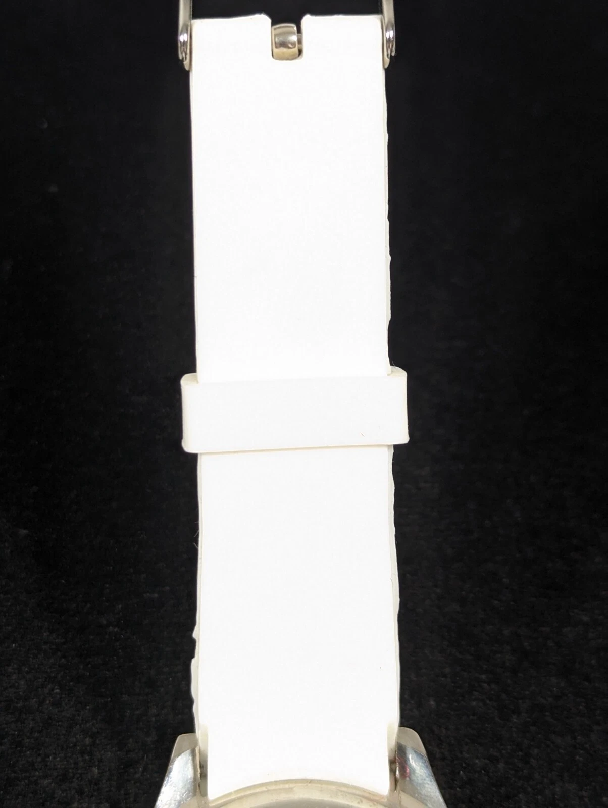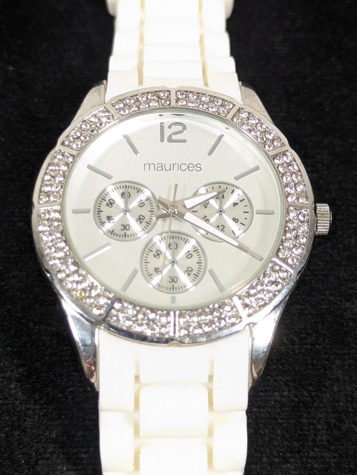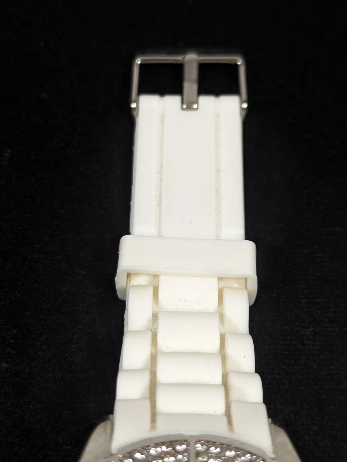 Maurices Womans Silver Tone Dial Crystal Accent White Silicone Band Watch 8.5 in