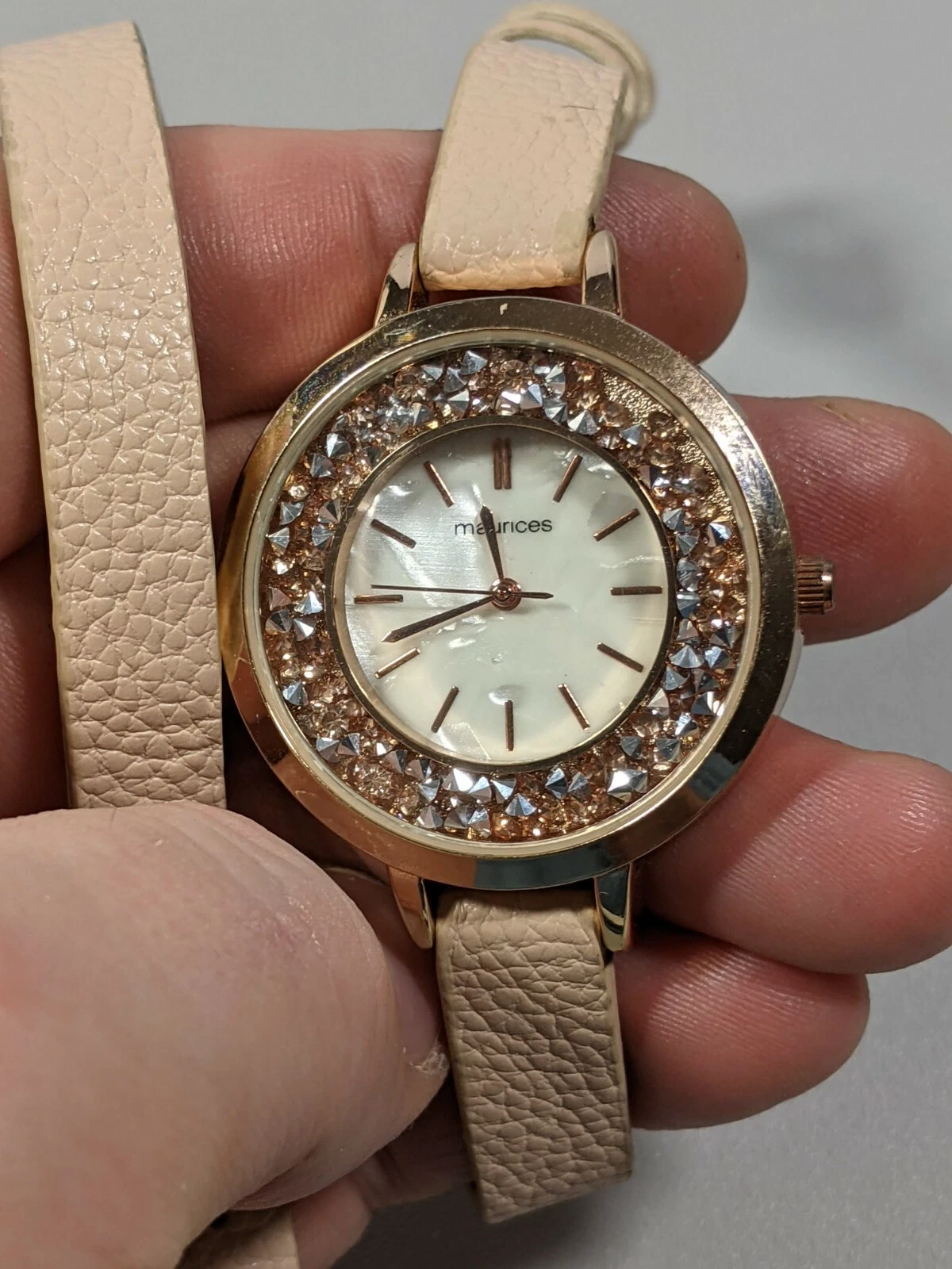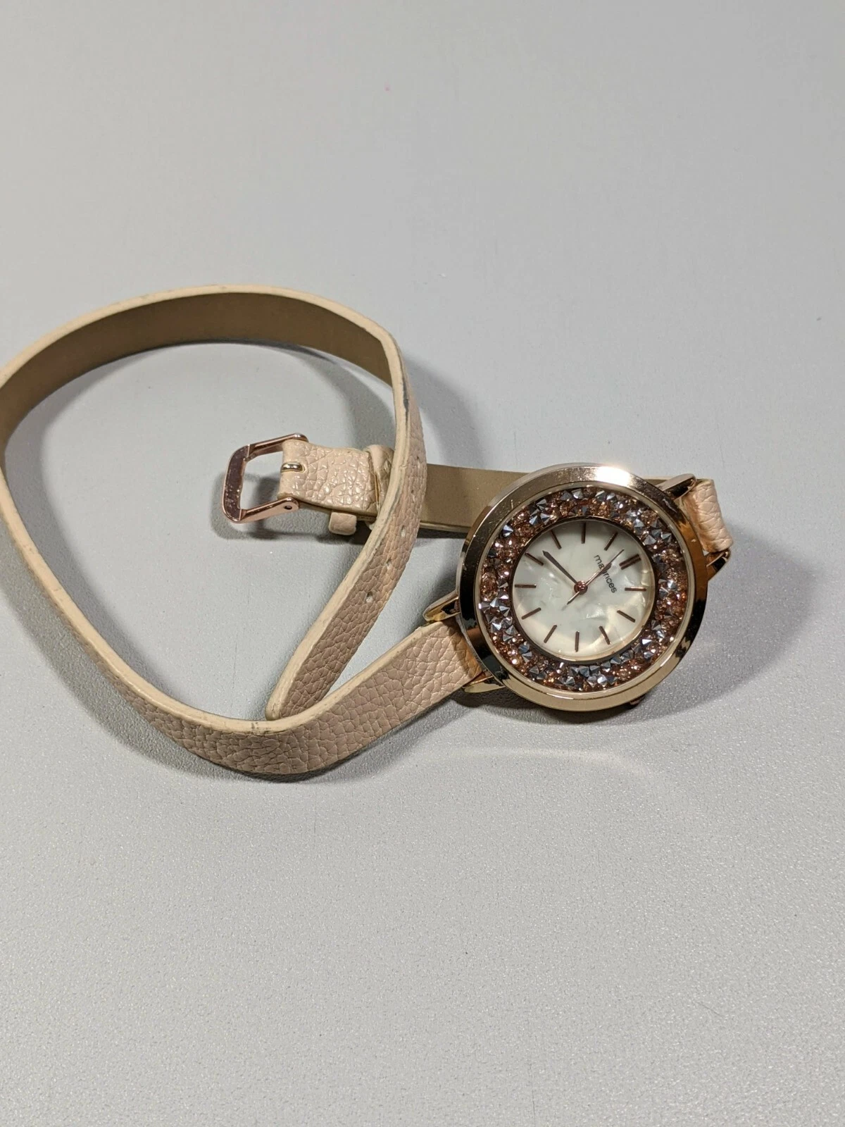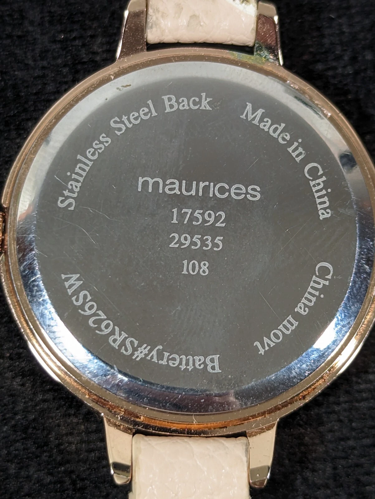 Maurices Gold Tone Round Pearlized Face Beige Faux Leather Wrap Band Watch 16 In