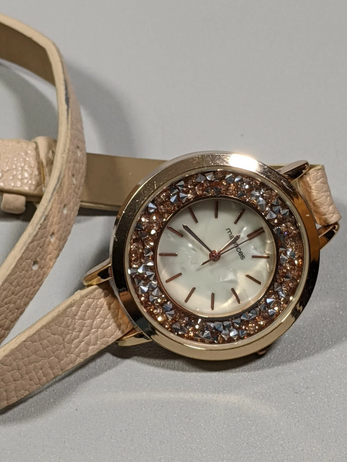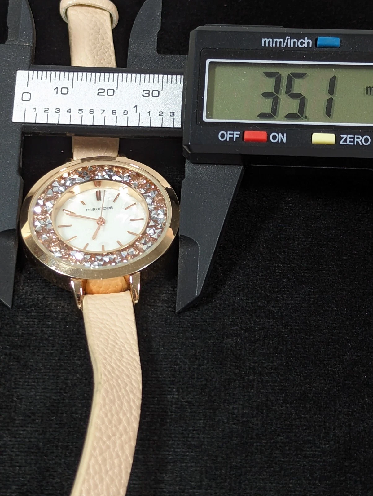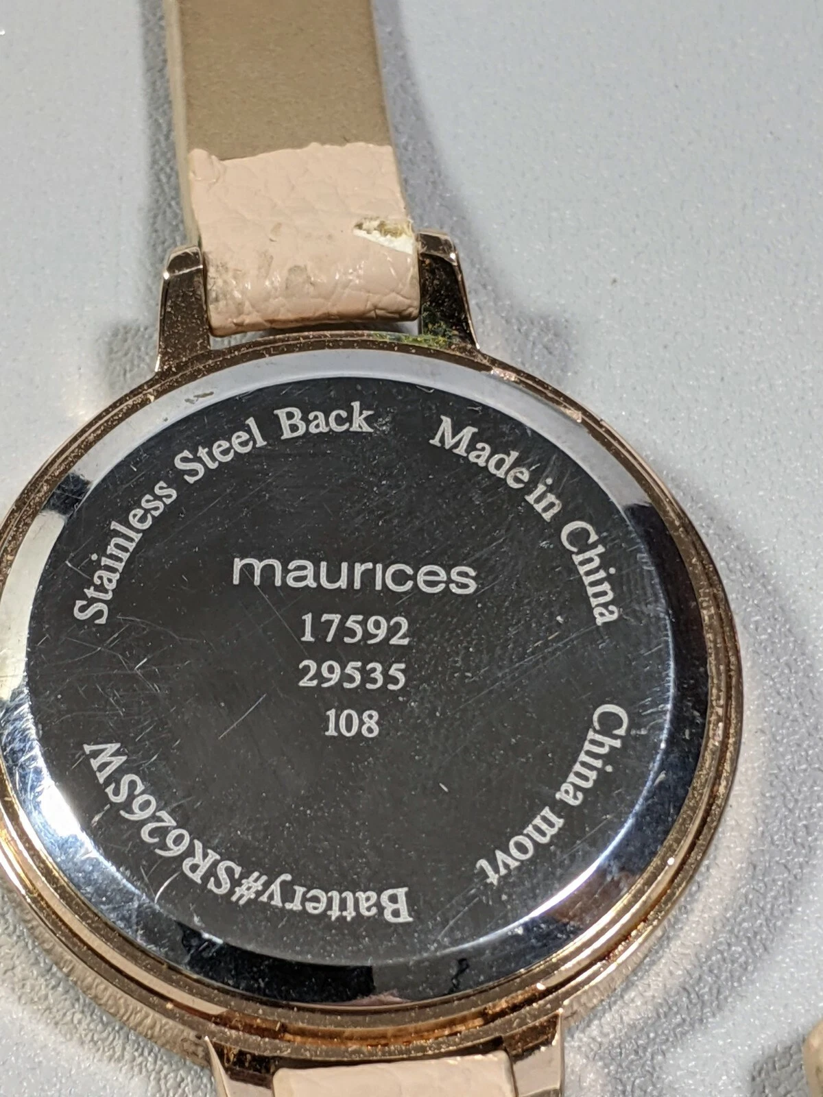 Maurices Gold Tone Round Pearlized Face Beige Faux Leather Wrap Band Watch 16 In