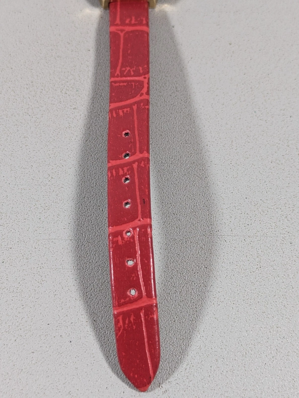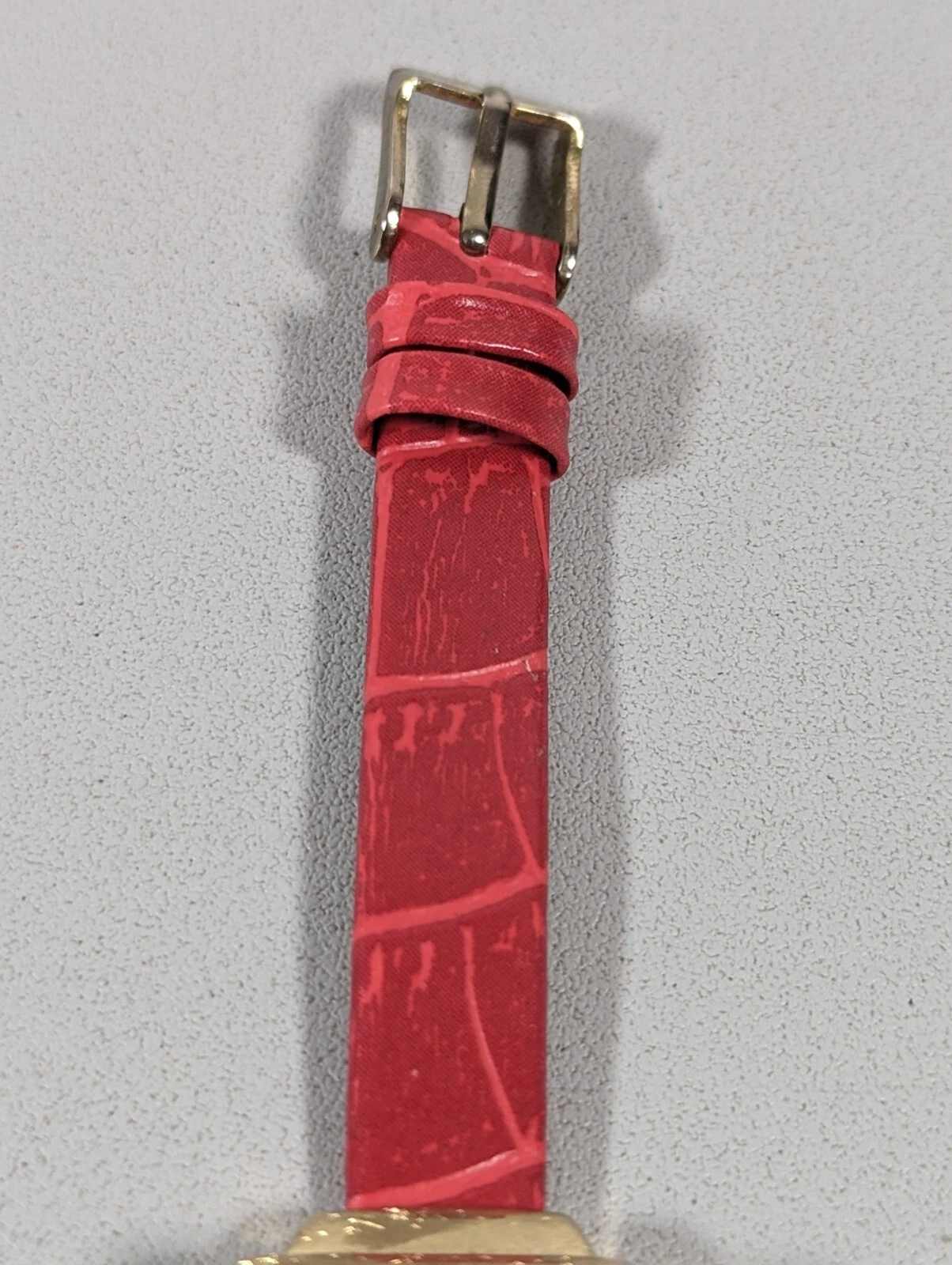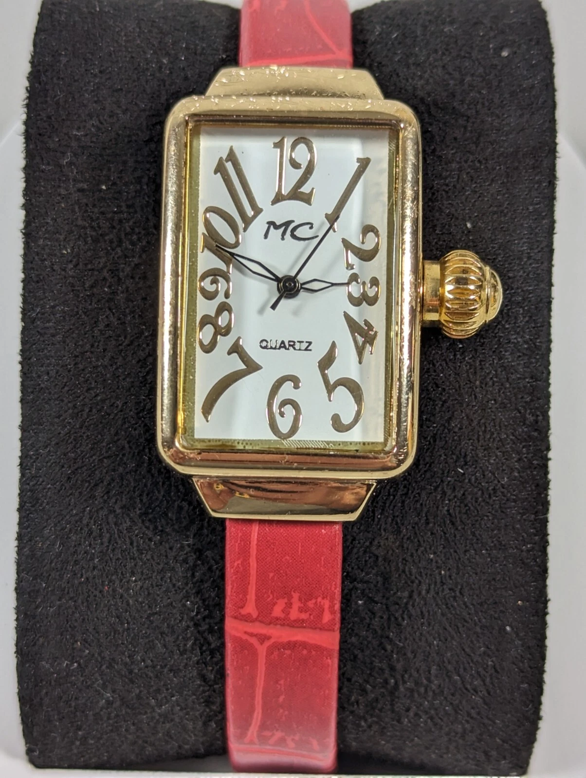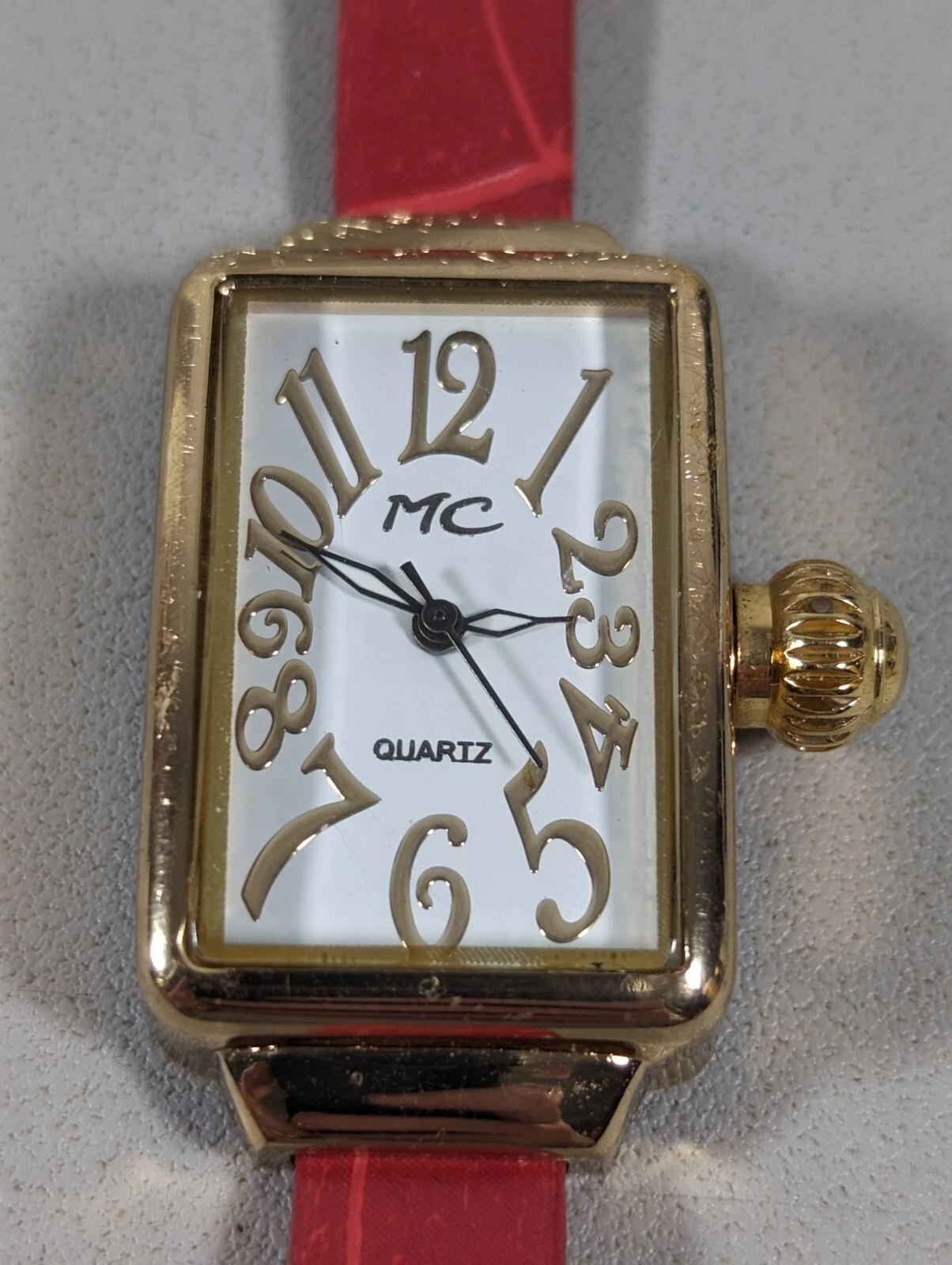 MC White Dial Gold Tone Rectangle Case Red Faux Leather Band Watch